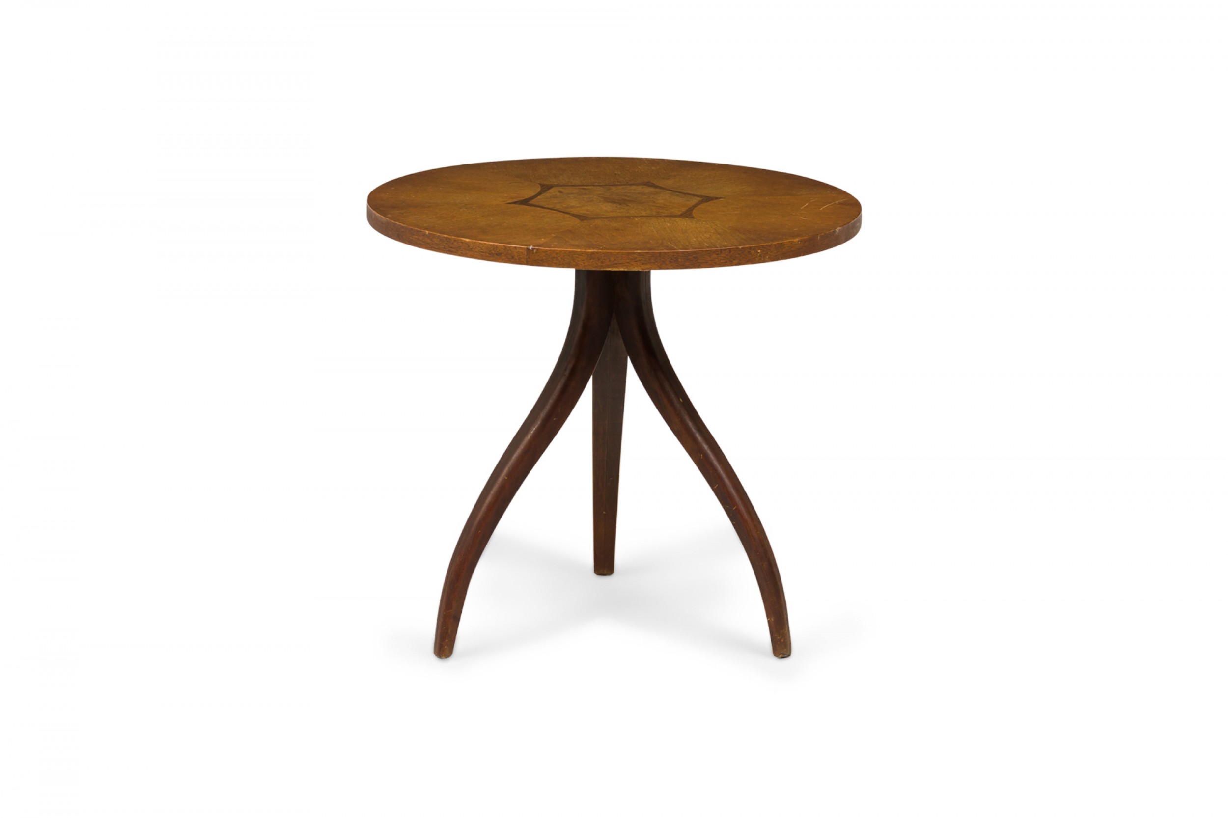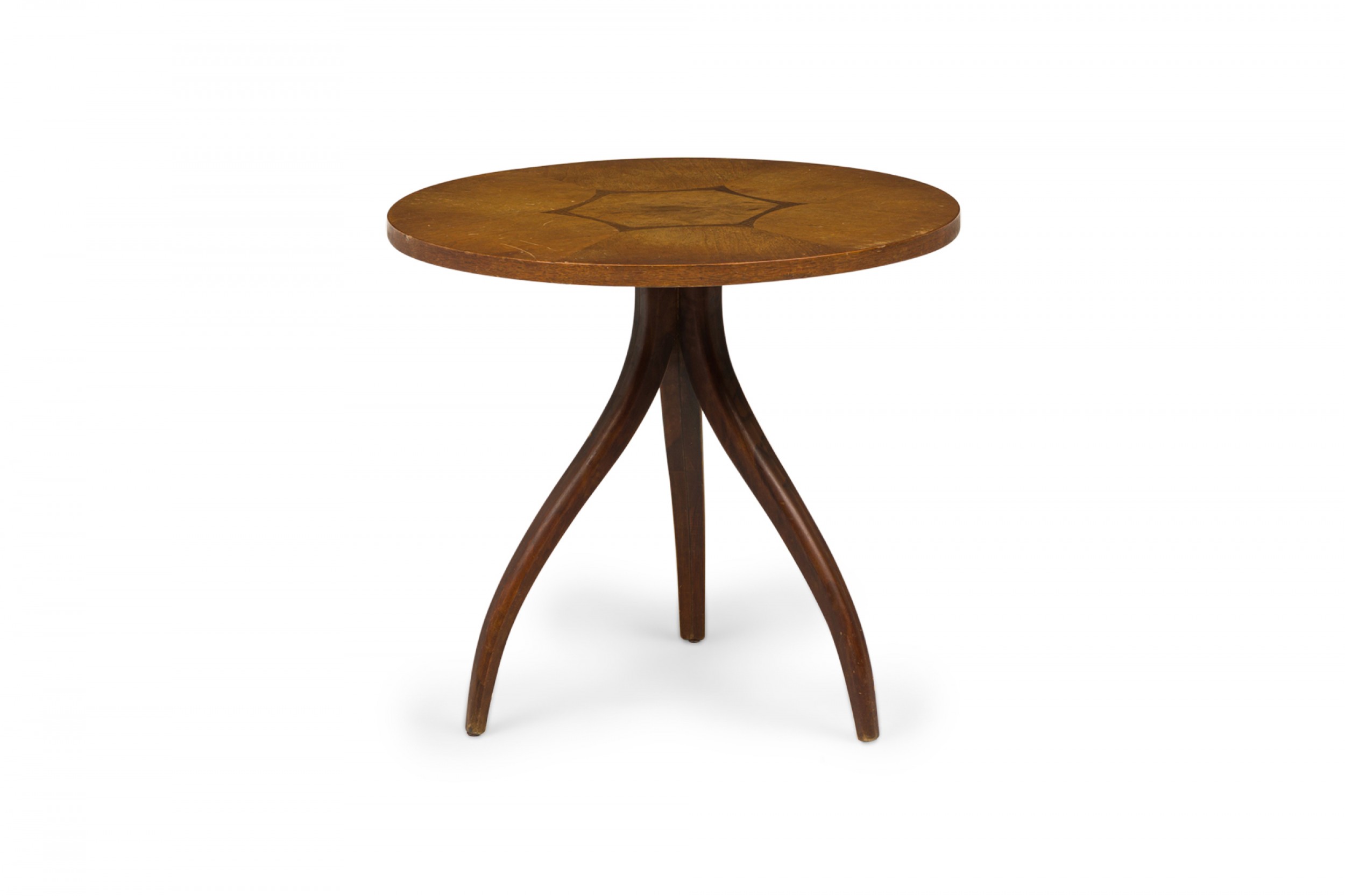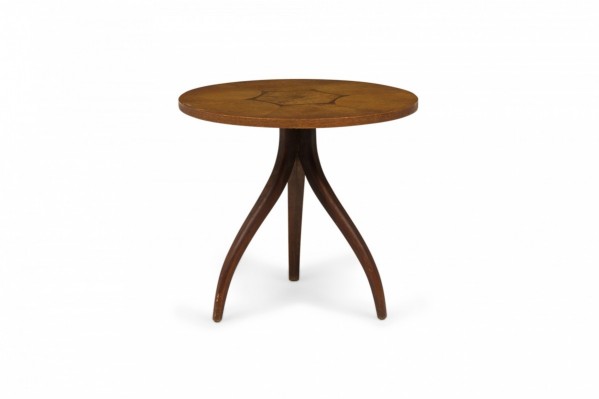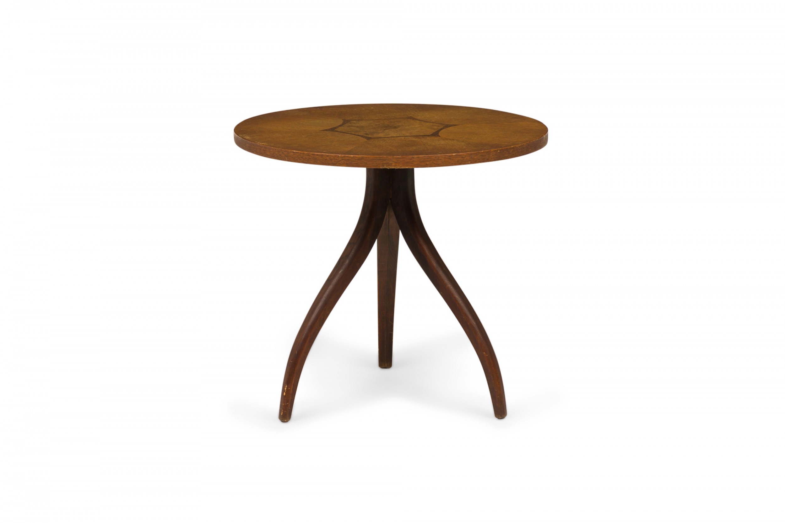 American Mid-Century circular end / side table with an inlaid central hexagonal star design supported by a wooden tripod base. (KIPP STEWART FOR DREXEL)