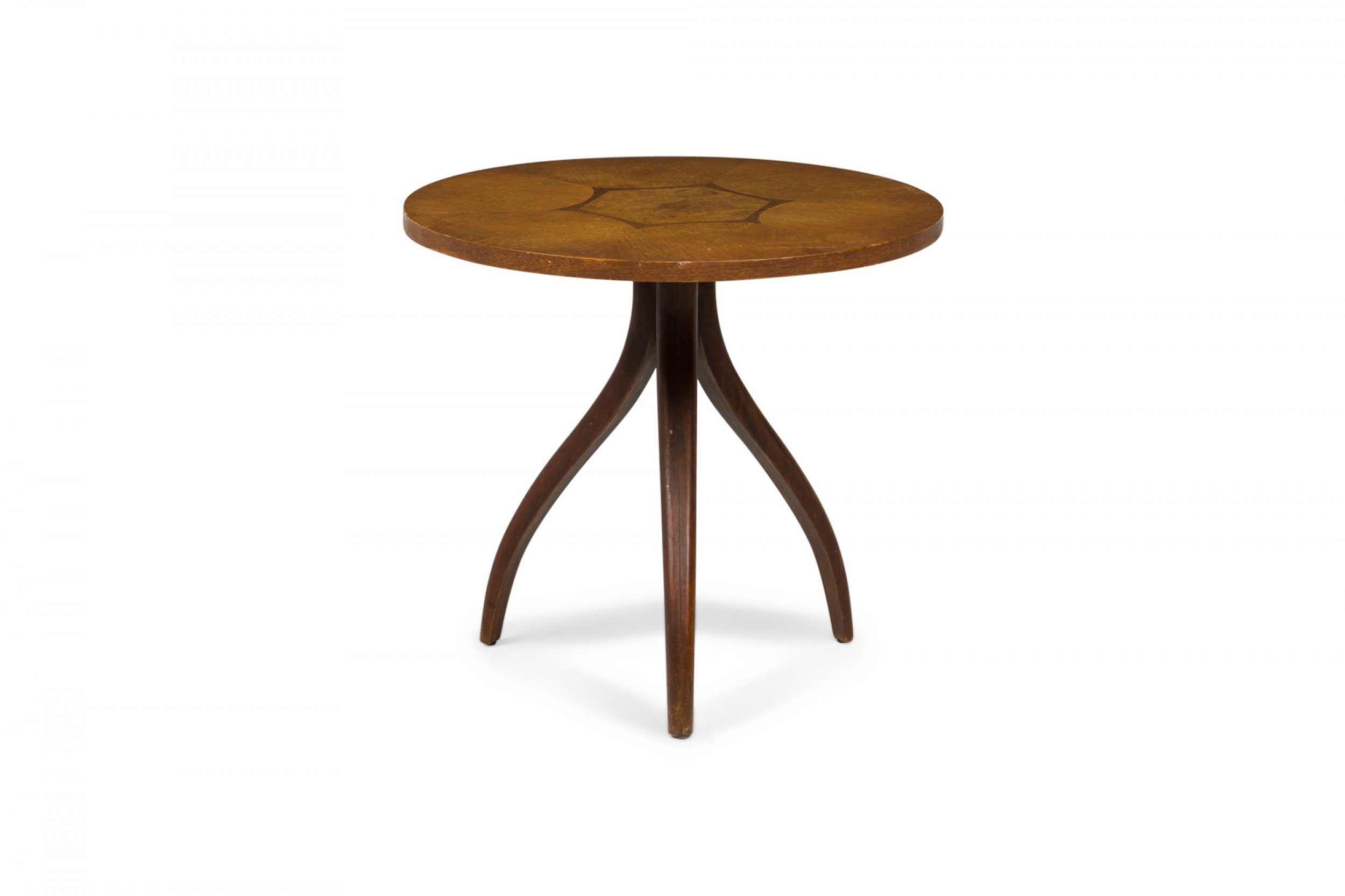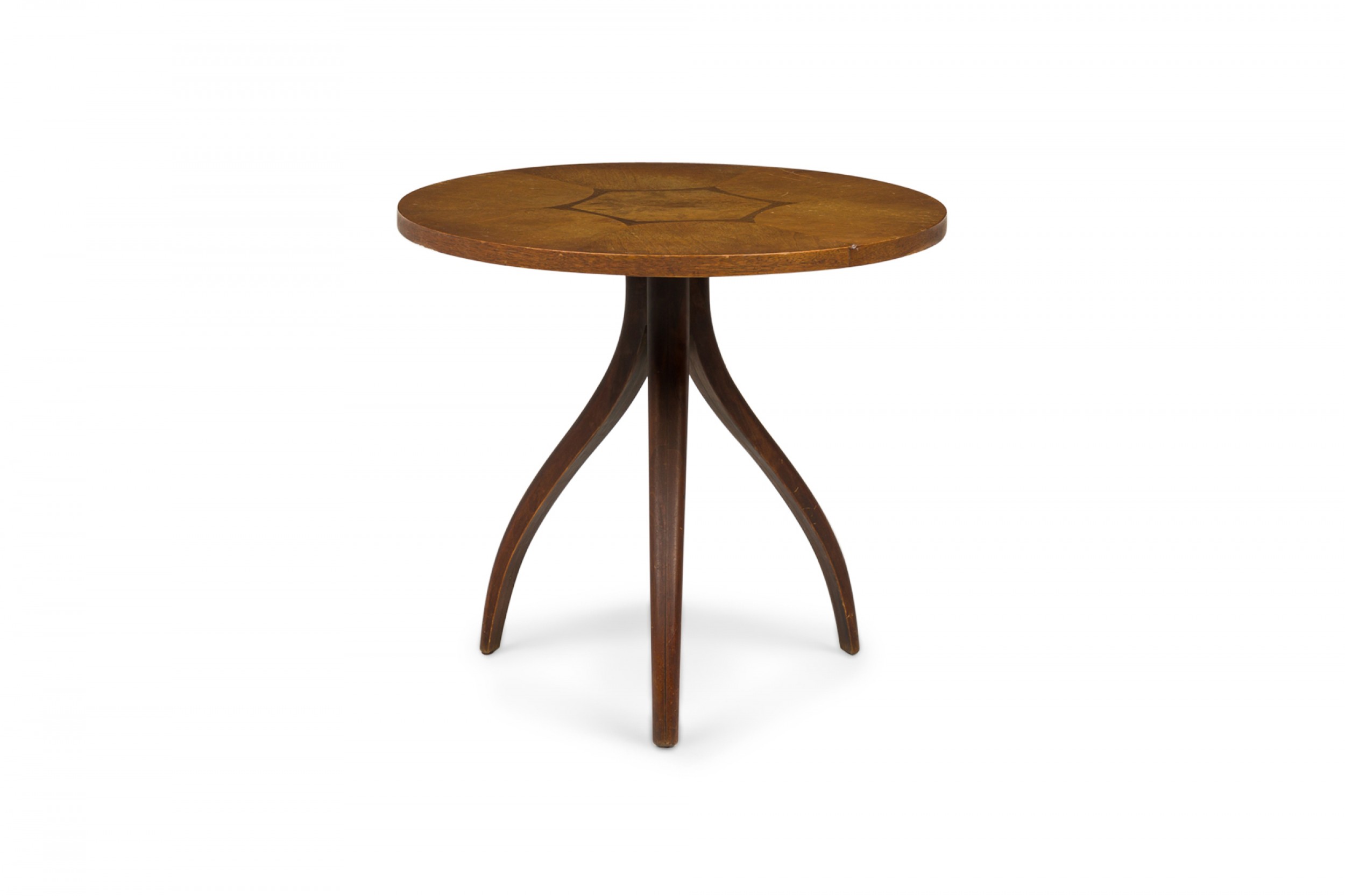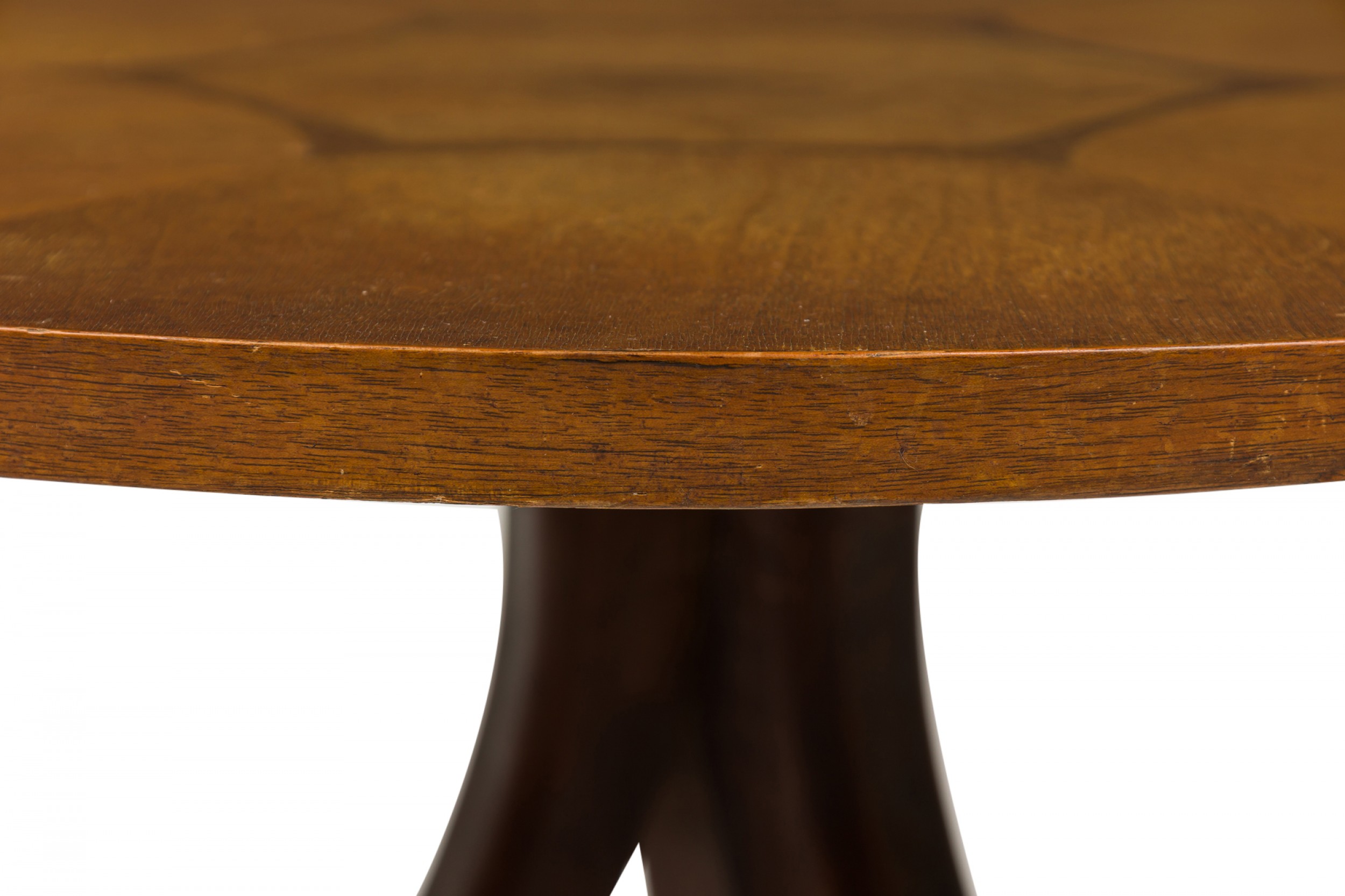 American Mid-Century circular end / side table with an inlaid central hexagonal star design supported by a wooden tripod base. (KIPP STEWART FOR DREXEL)