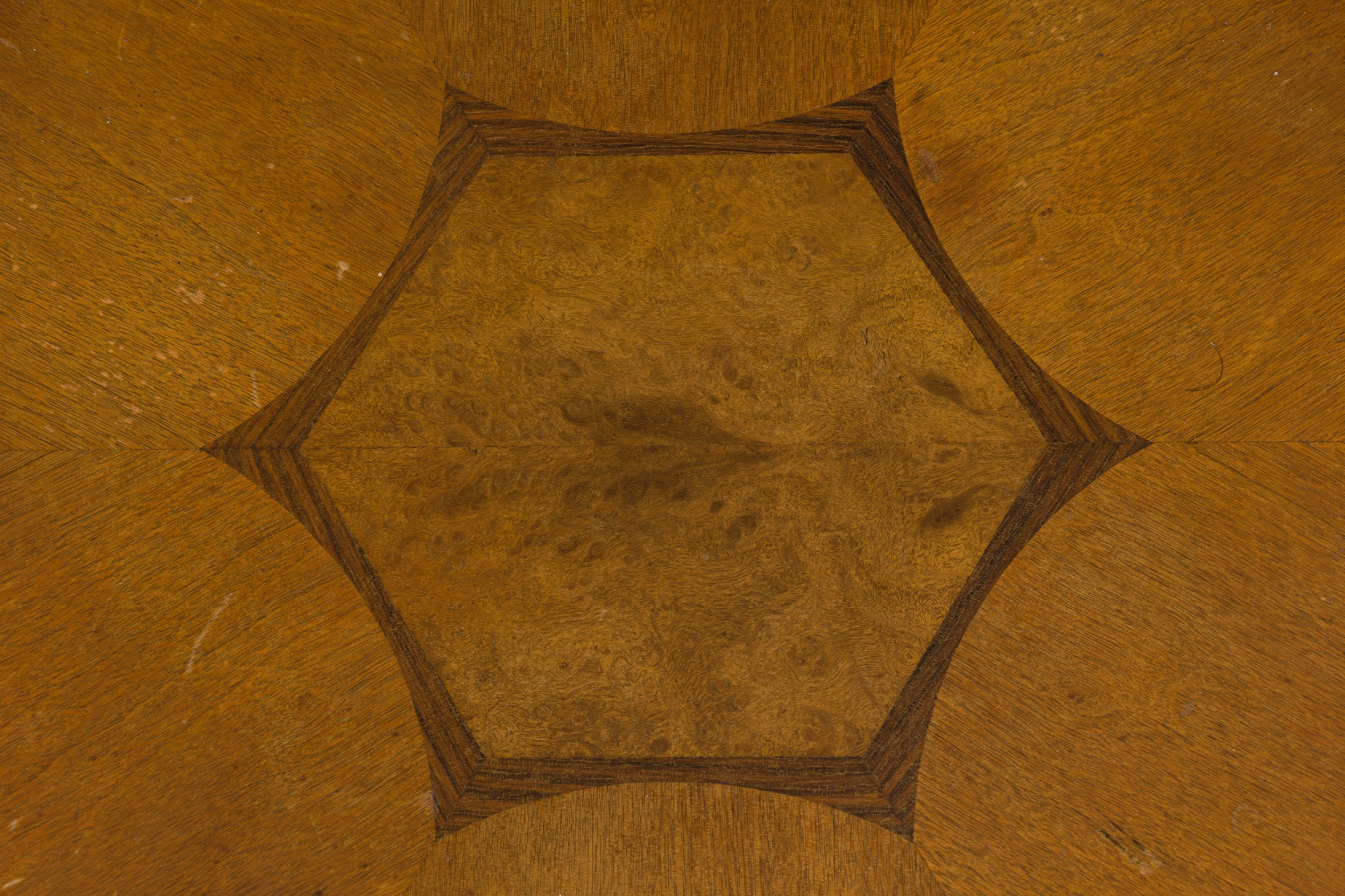 Kipp Stewart for Drexel American Mid-Century Wooden Inlay Hexagon Circular Tripod End / Side Table