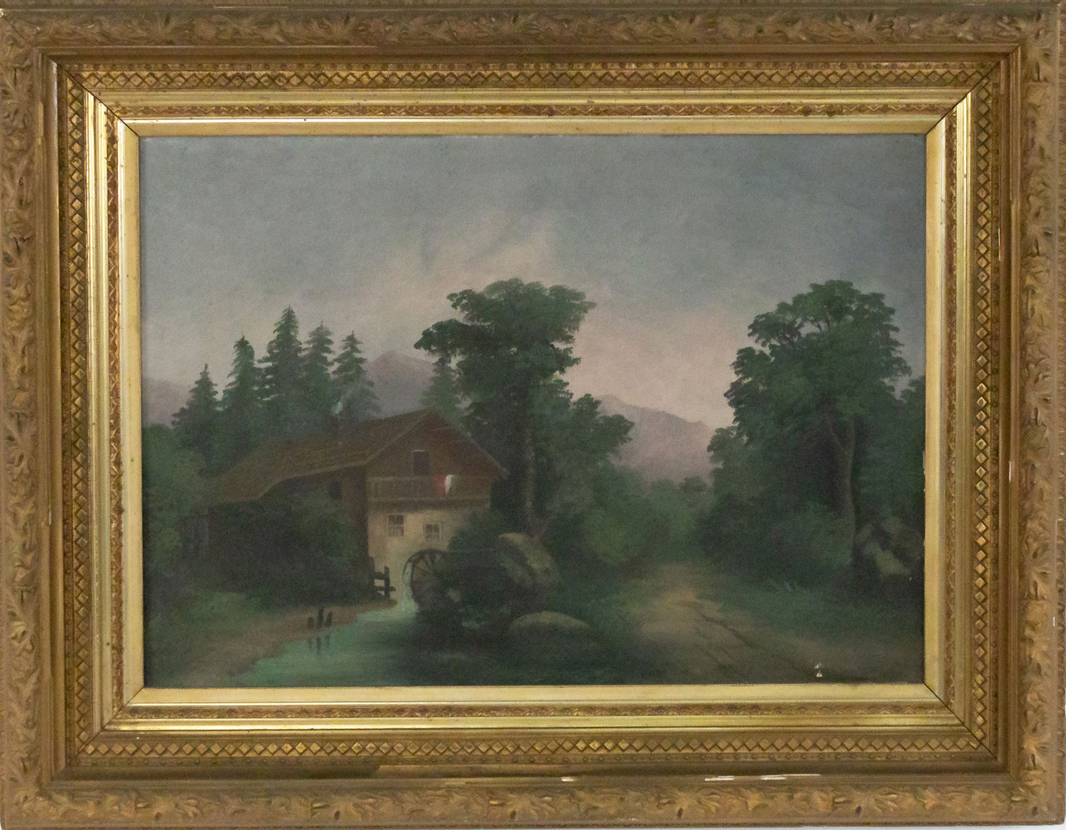English Victorian style oil painting of a landscape depicting a windmill in a rectangular gold gesso and wood frame with a decorative foliage pattern..