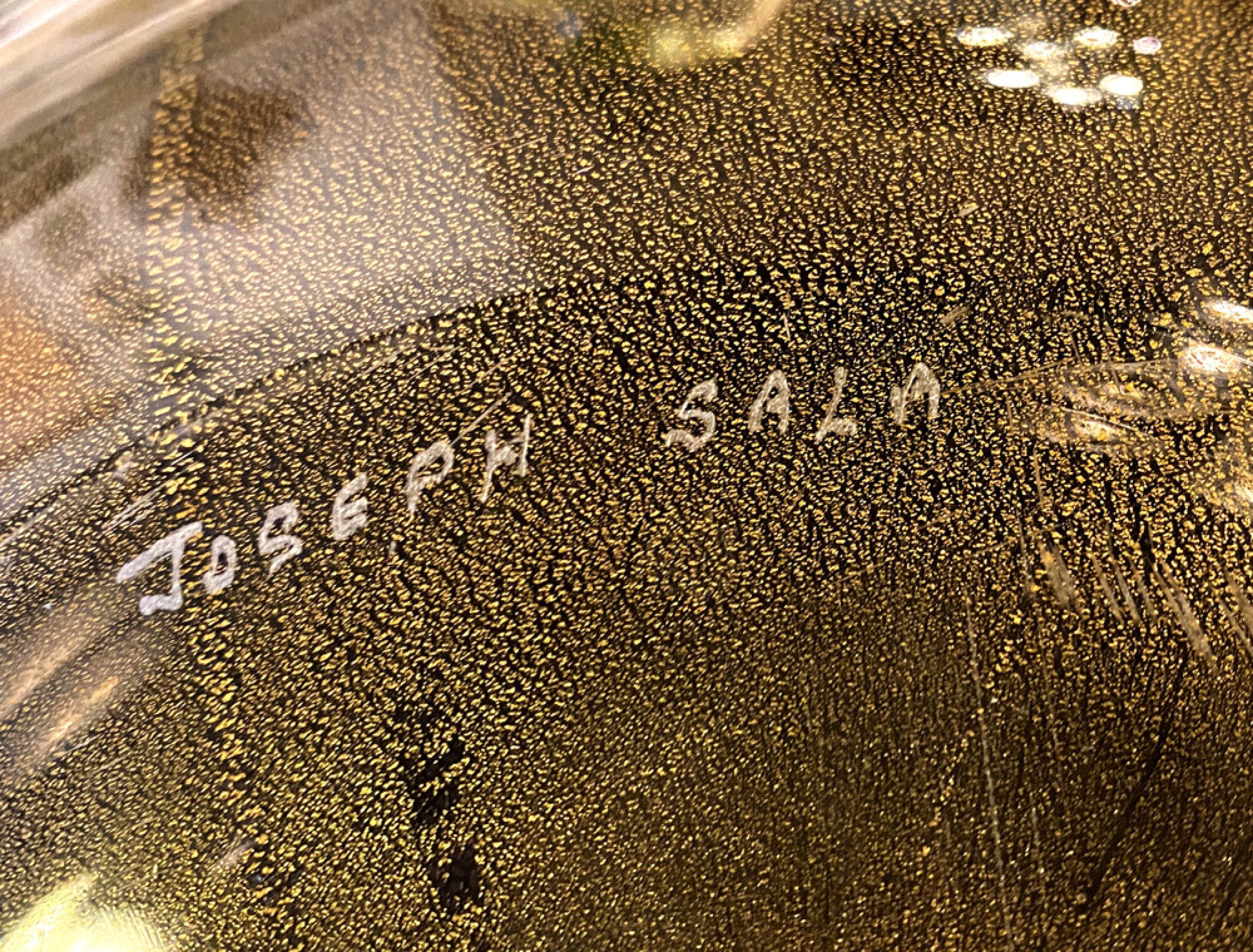 Italian Mid-Century Hand Blown Gold Dusted Murano Bowl / Vide Poche with a shaped round form (signed on bottom: JOSEPH SALA).