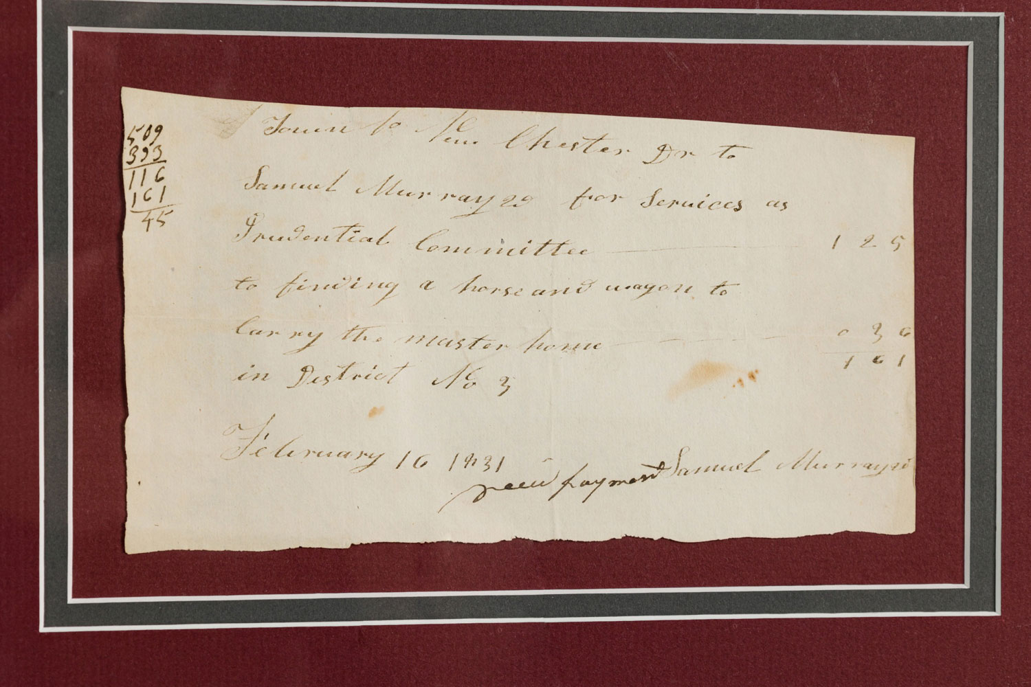 American (19th Cent) fragment of antique paper with handwritten script and numerical calculations framed in a burgundy mat above two copper coins in a blue mat mounted in a gold wooden frame.