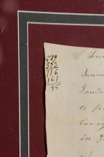 American (19th Cent) fragment of antique paper with handwritten script and numerical calculations framed in a burgundy mat above two copper coins in a blue mat mounted in a gold wooden frame..