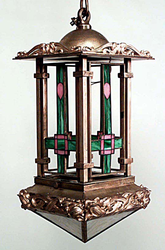 French Art Nouveau bronze dore lantern with leaded colored glass panels and floral trim