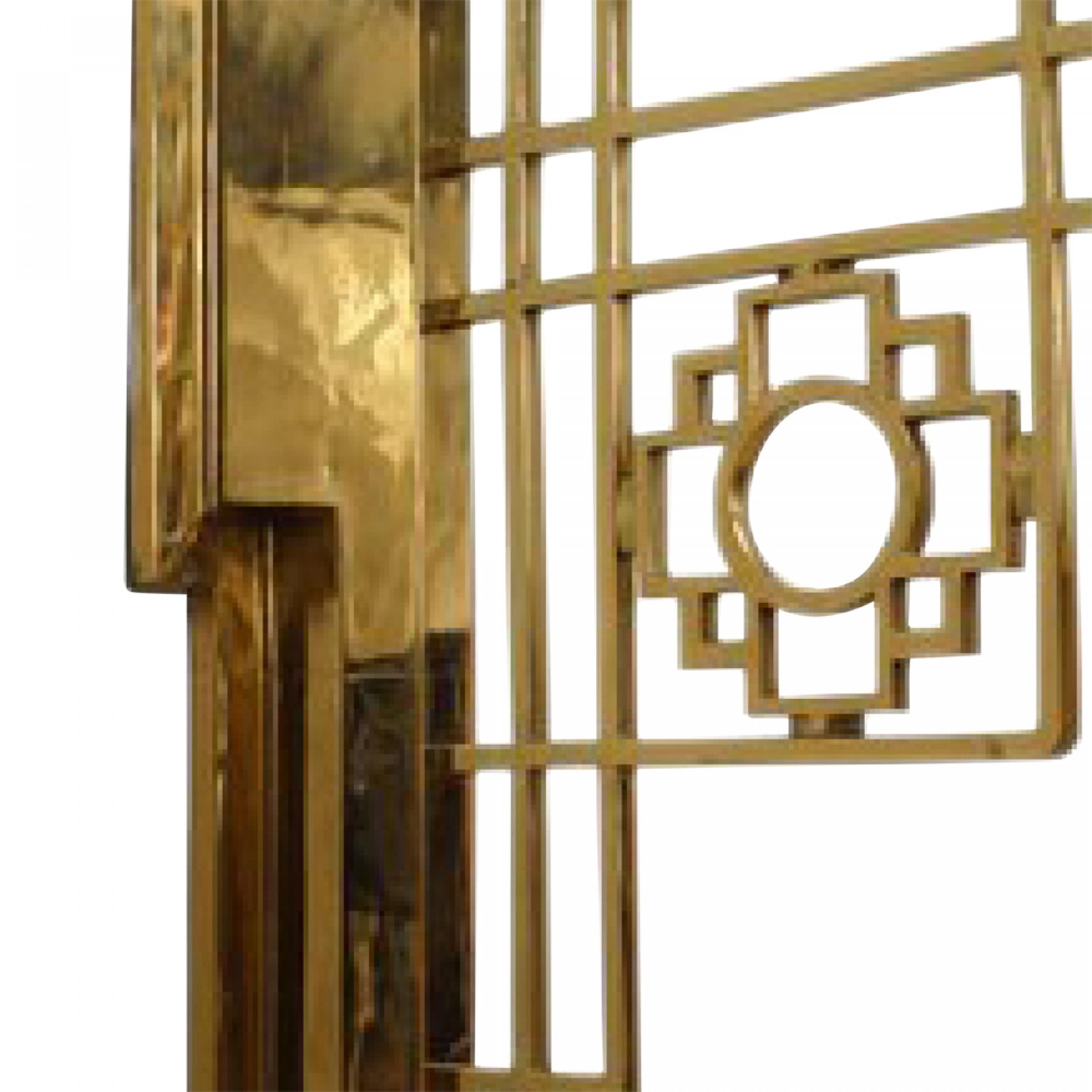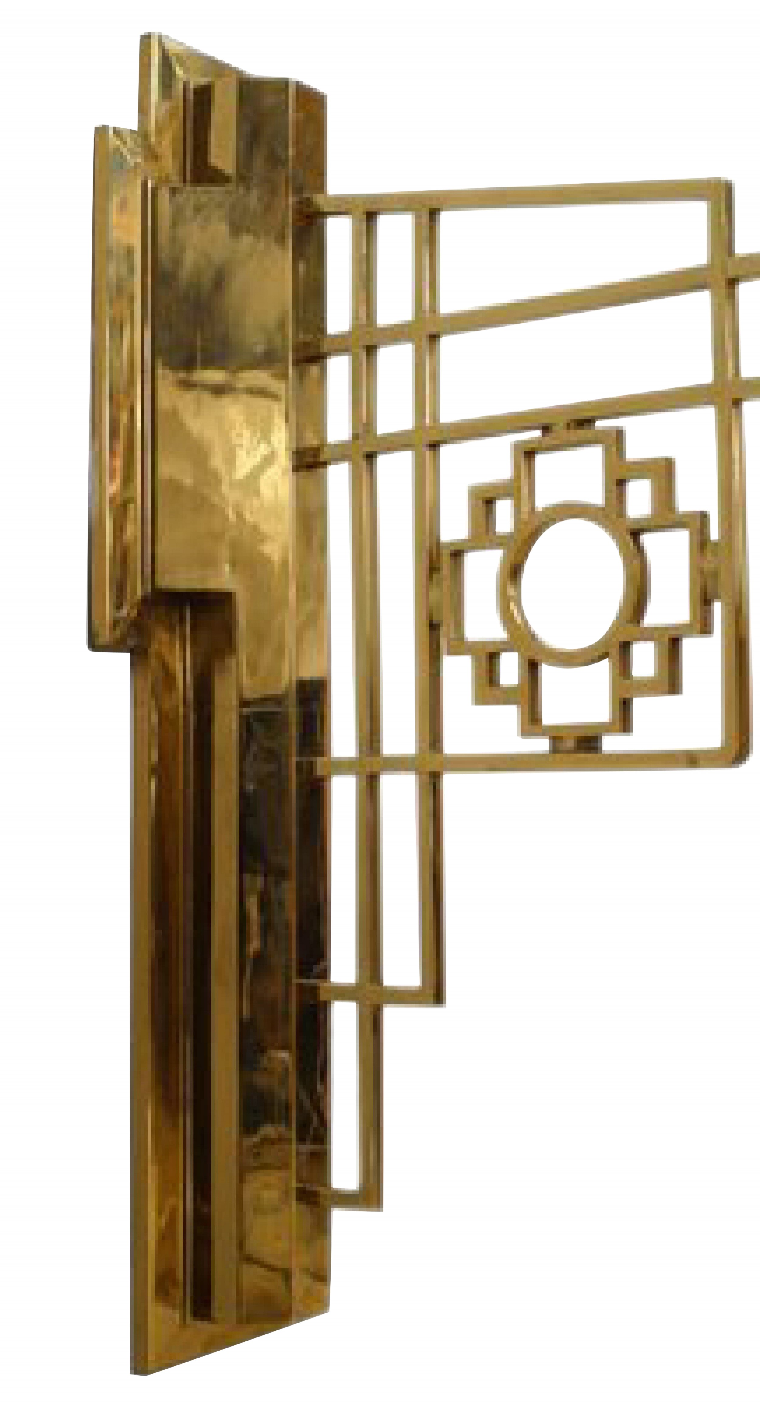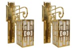 PAIR of French Mid-Century (1940s) brass wall sconces with Chinese lattice-design wall brackets supporting four-sided fixtures with frosted glass panels. (PRICED AS PAIR).