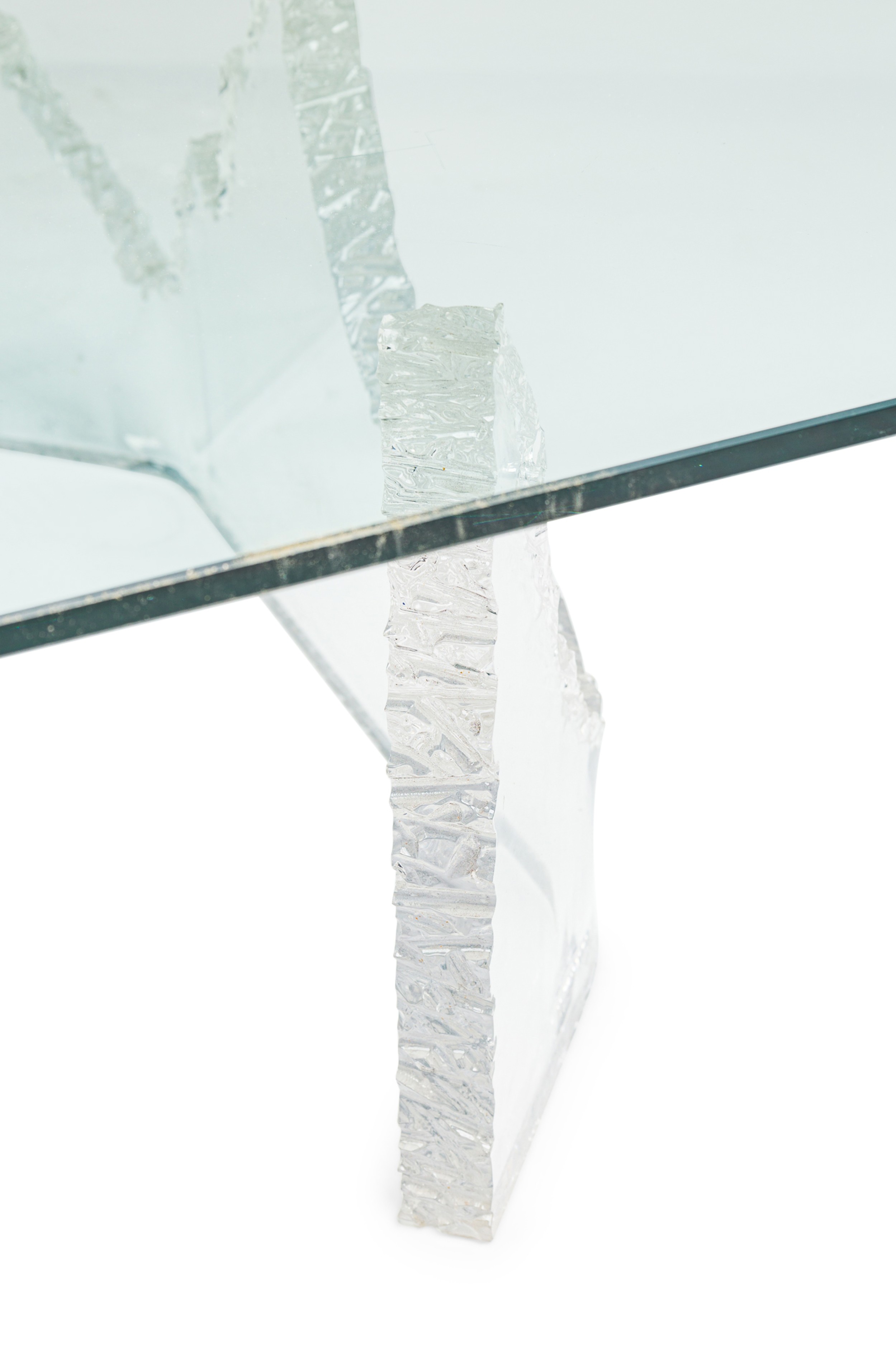 Mid-Century American lucite cocktail / coffee table made up of 2 iceberg form bases with the longer base being U-shaped and the shorter is V-shaped. (signed, LION IN FROST).