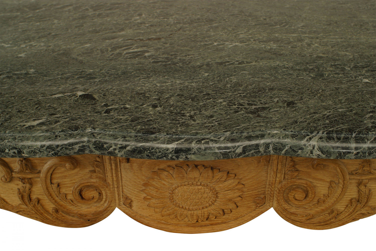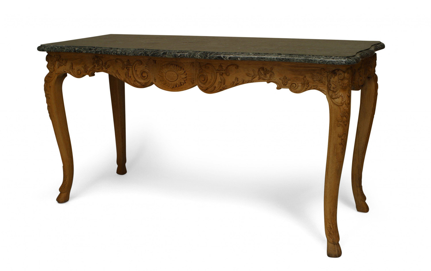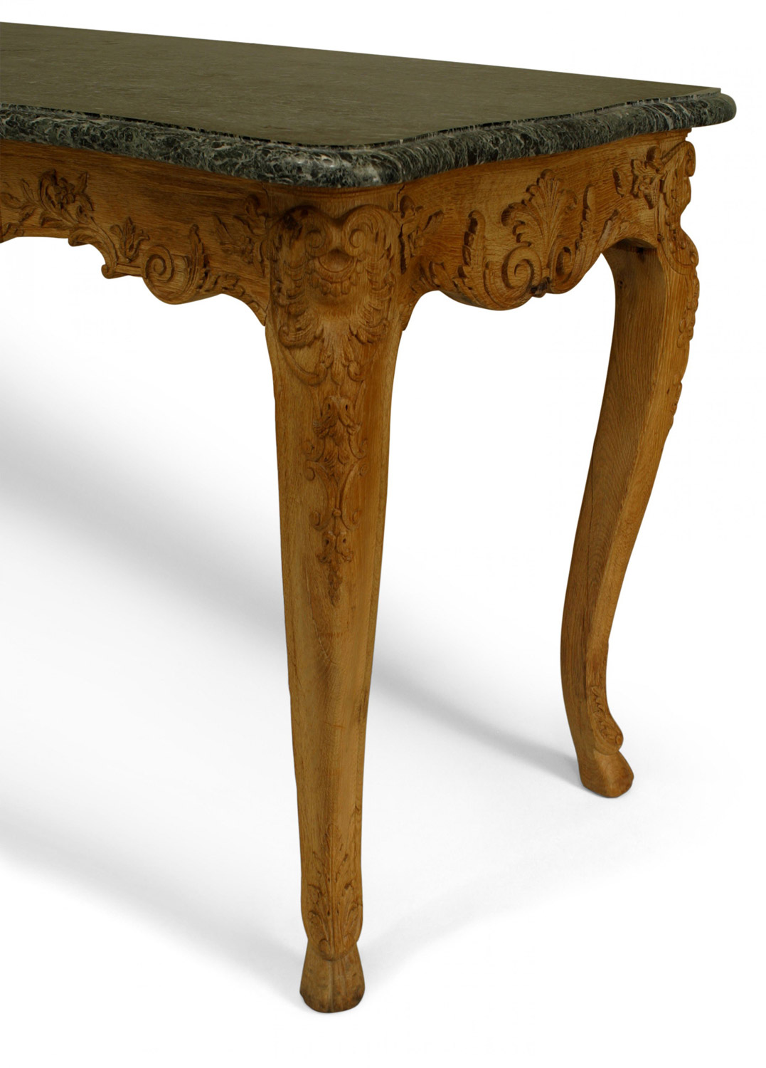 PAIR of French Provincial Louis XV-style (19th Century) stripped oak console tables with serpentine green marble top above a sunflower carved apron on cabriole legs with hoof feet (PRICED AS PAIR).