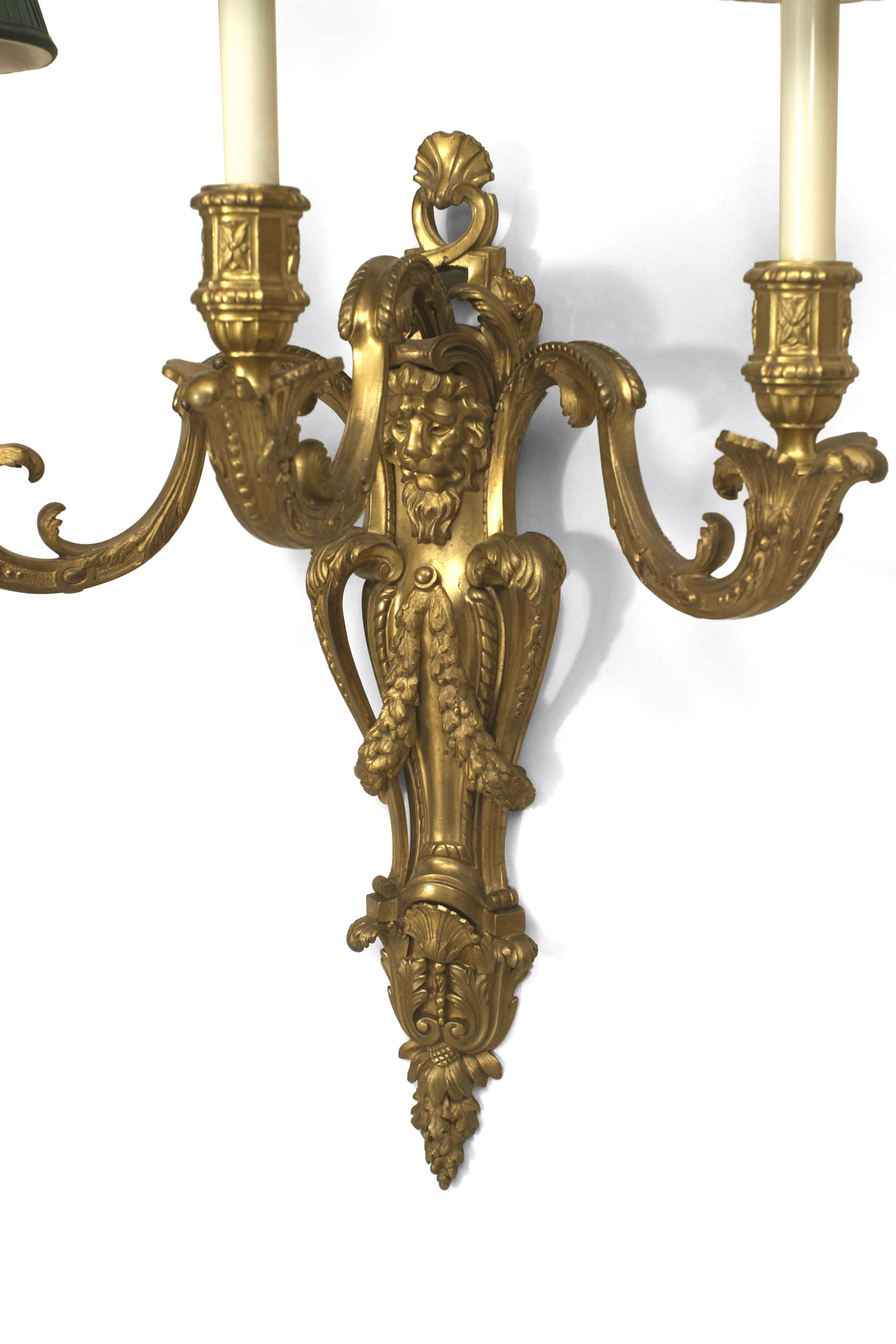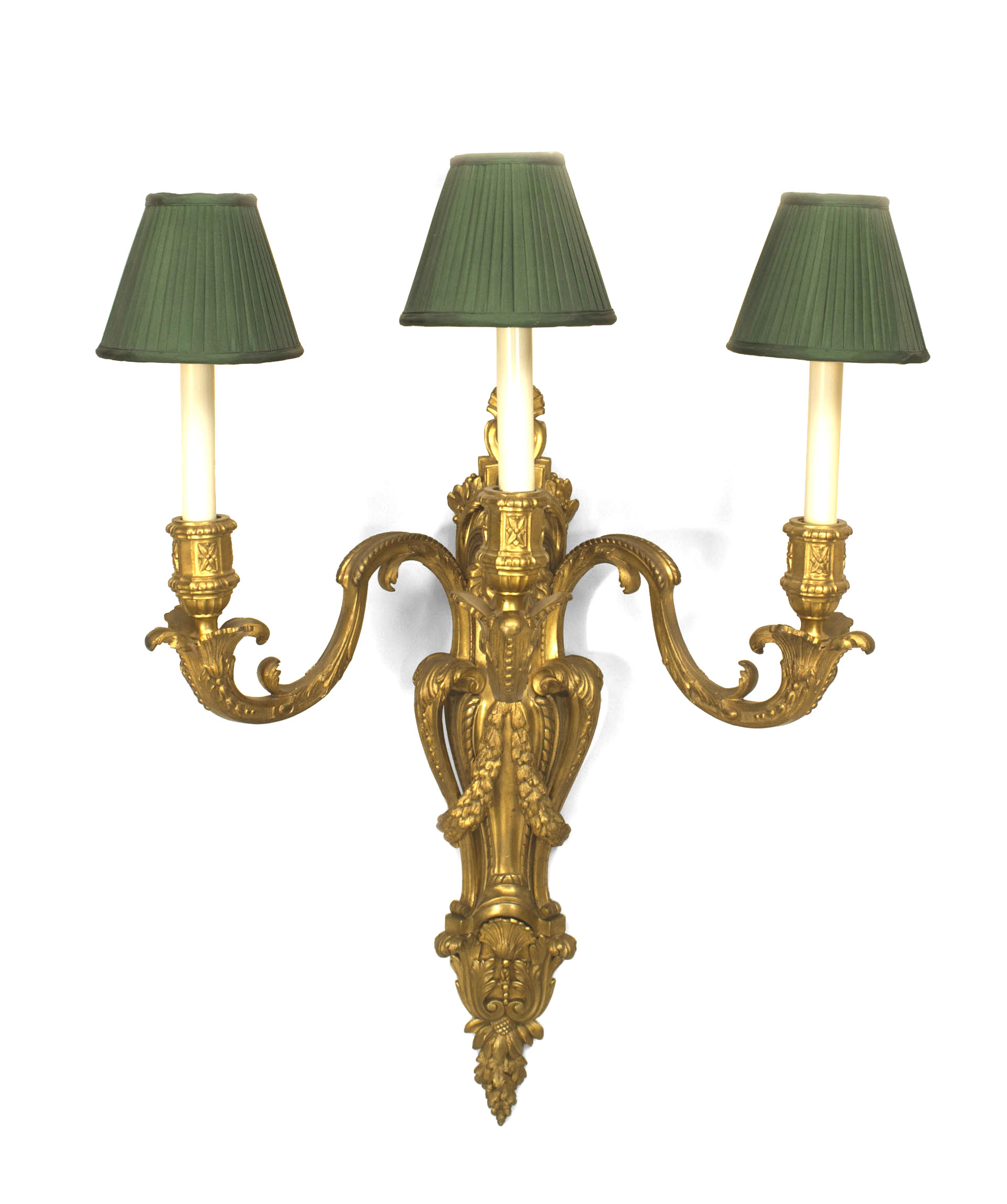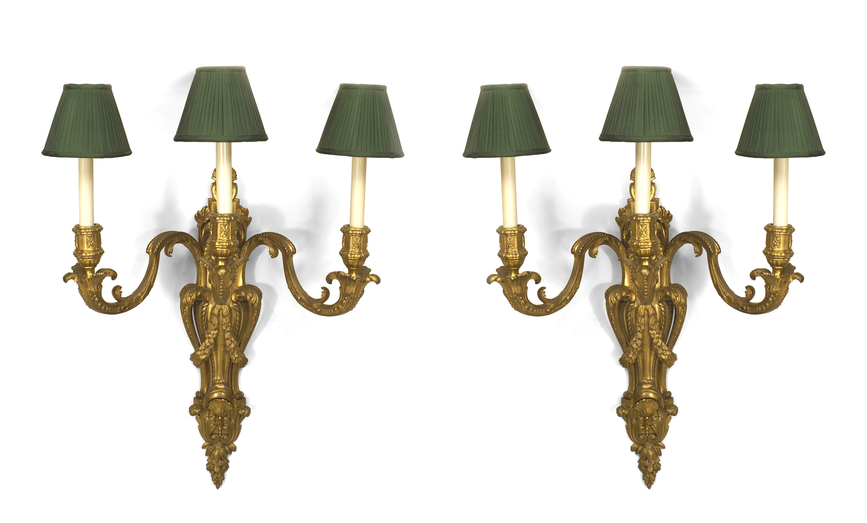PAIR of Louis XV-style (19/20th Century) bronze wall sconces with three scroll arms, a centered lion head with swags, and green pleated fabric shades (PRICED AS PAIR).