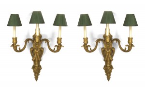 Pair of Louis XV Style Bronze Wall Sconces with Green Shades