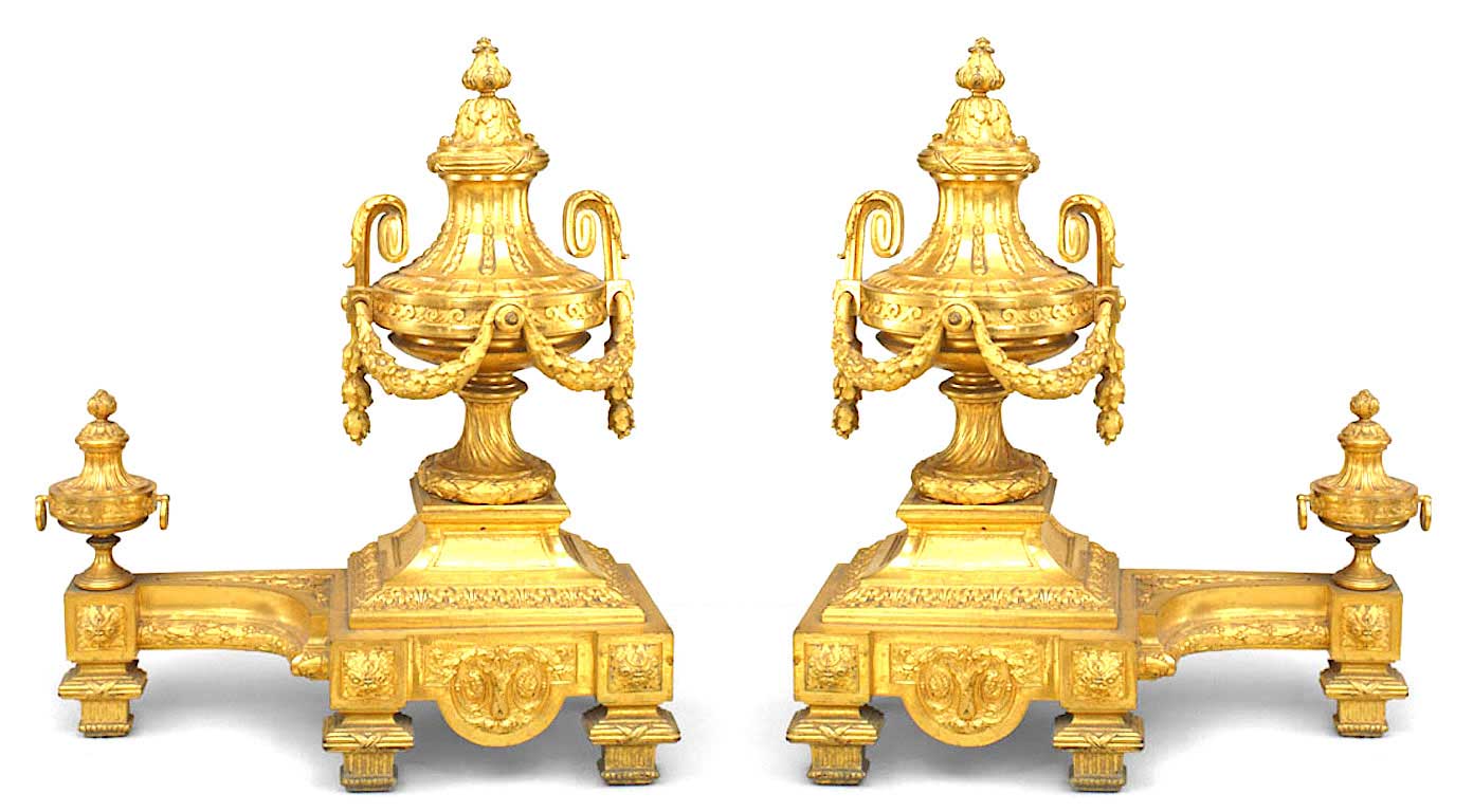 PAIR of French Louis XVI-style (19th Century) bronze dore urn and festoon andirons with small urn at one end with ring handles. (PRICED AS PAIR)