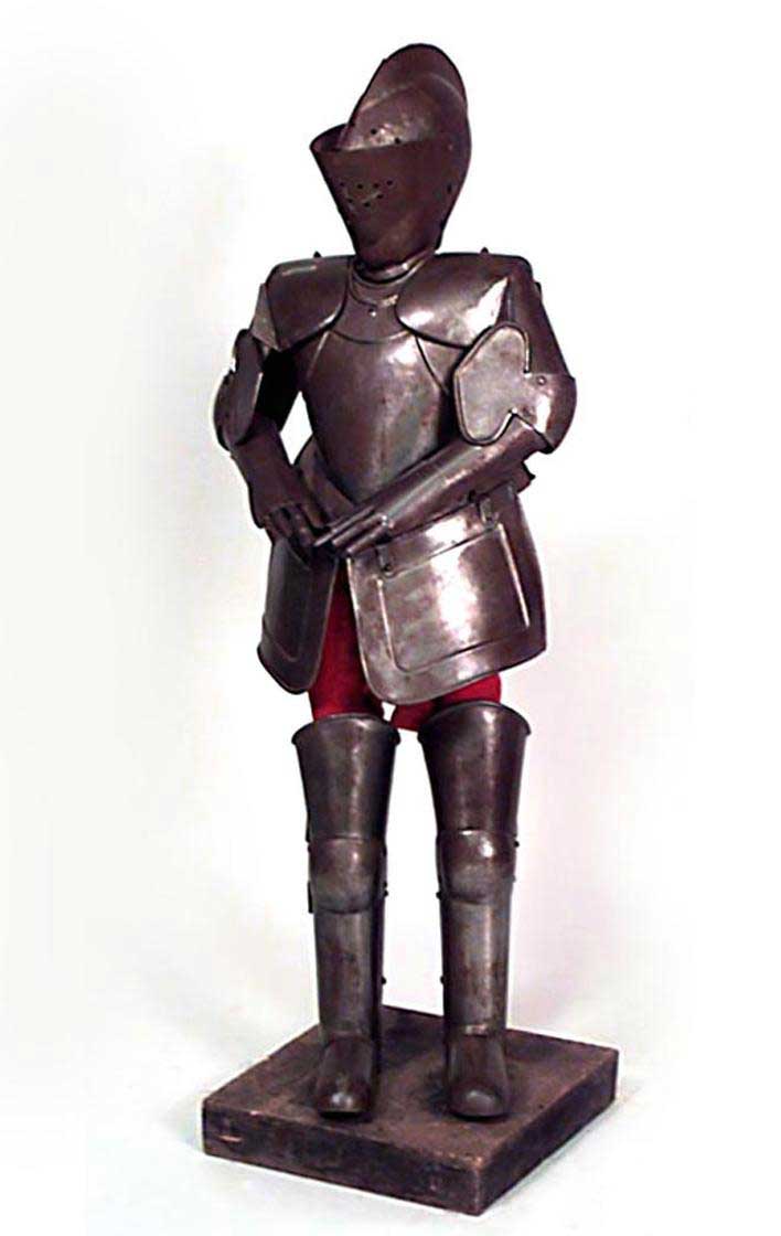 Style: Italian Materials & Techniques: Metal Category: Sporting/Gaming Condition: Tarnish. Bases 13" x 13.5" x 2.5". Armor alone 43" height. Good; Wear consistent with age and use