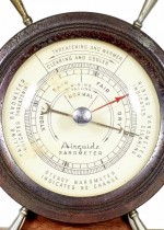 Small metal ship-wheel shaped barometer on rectangular wood base.