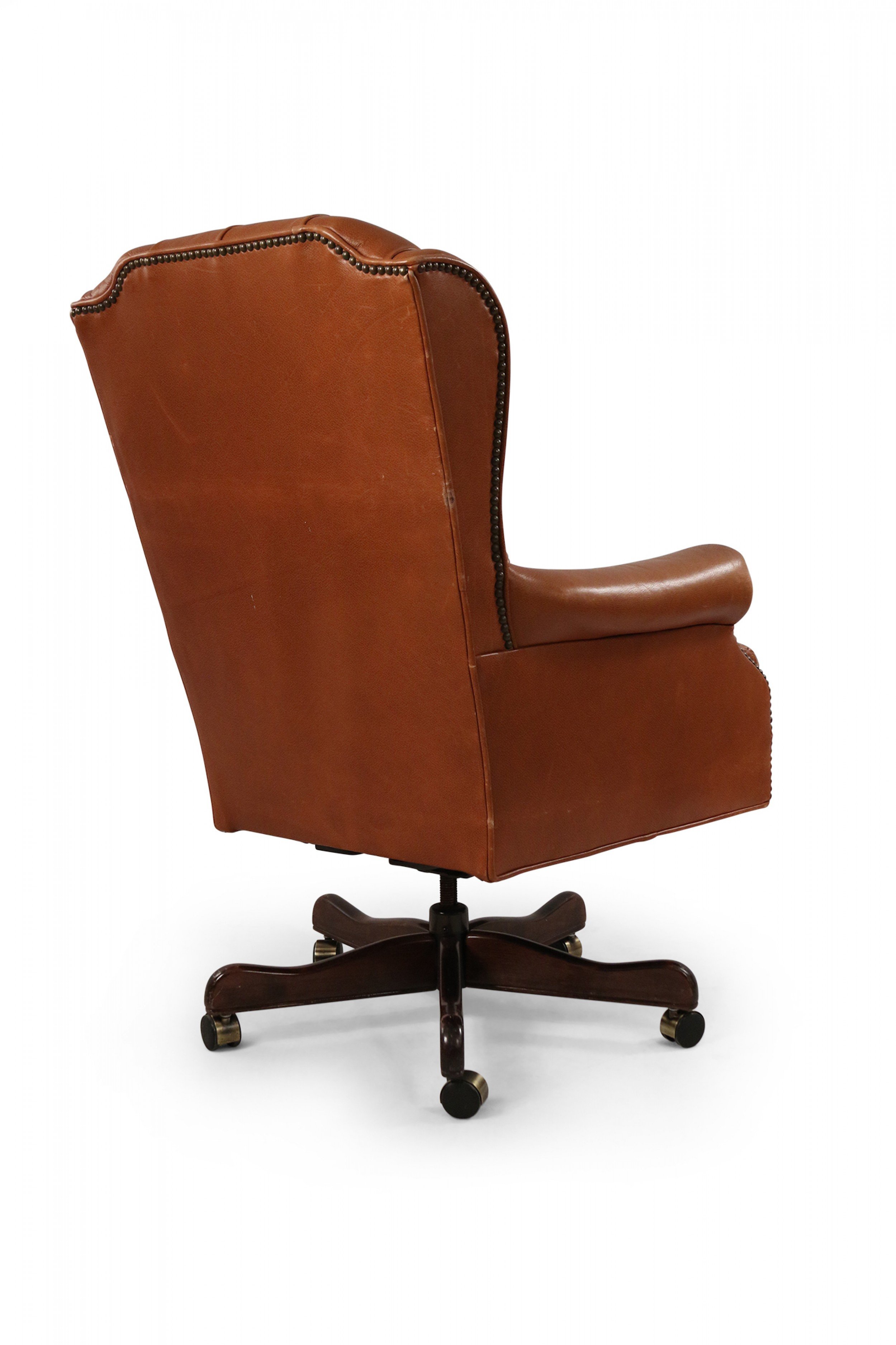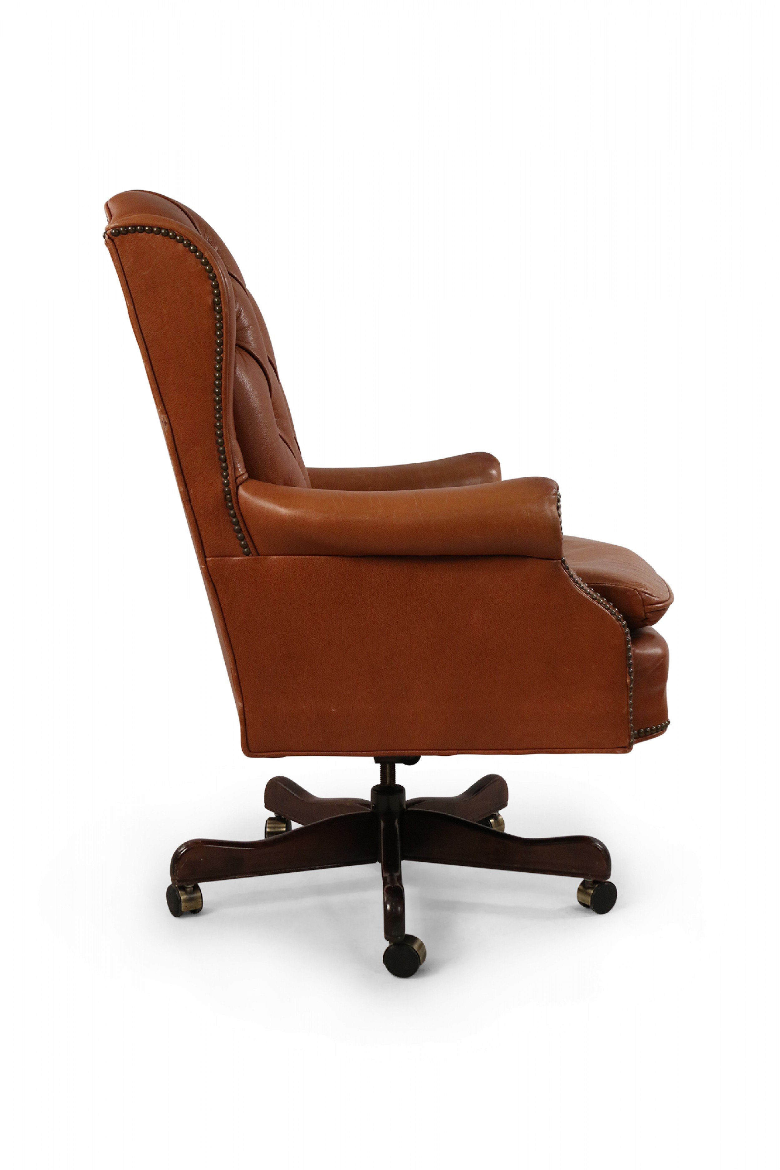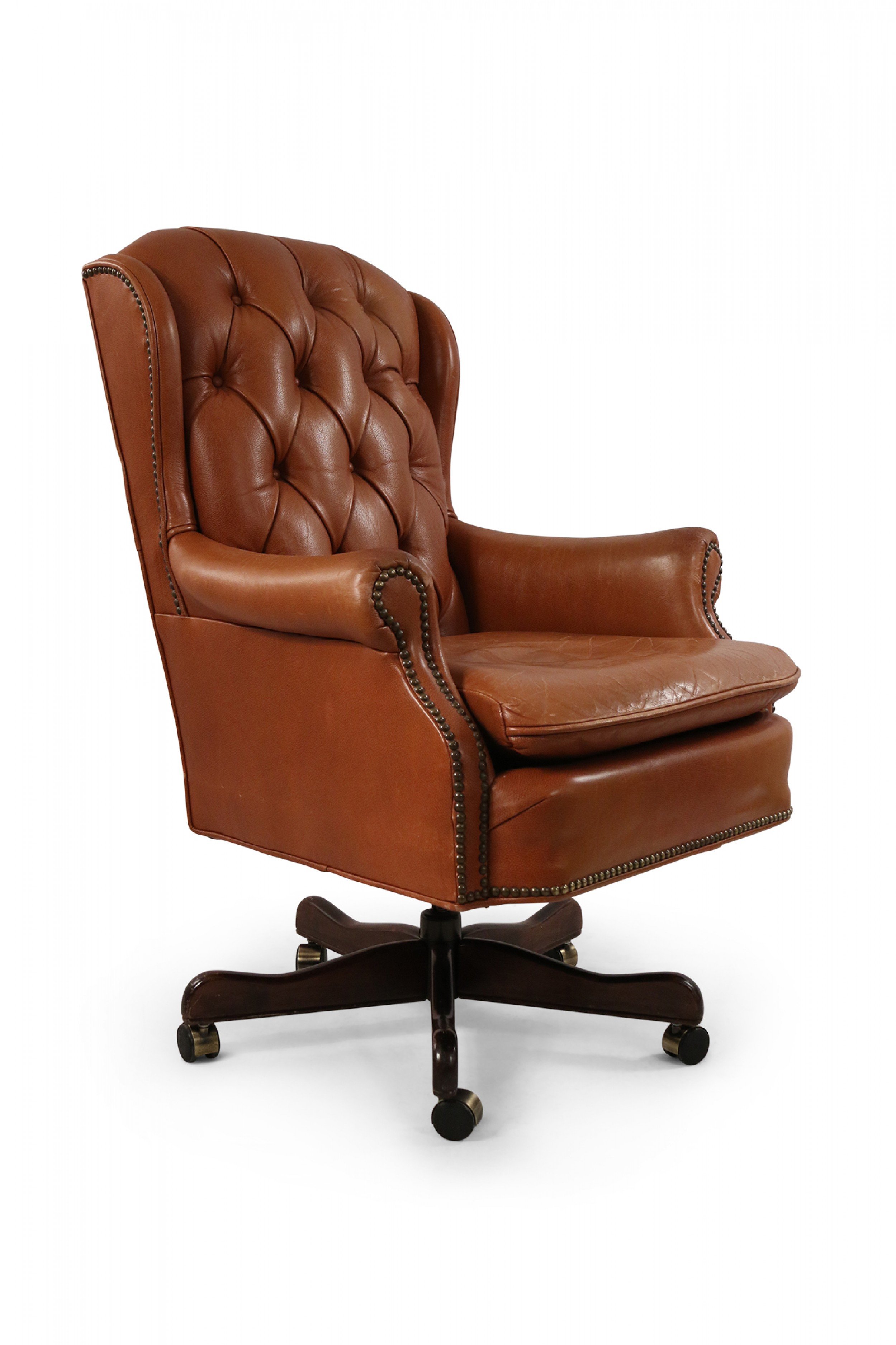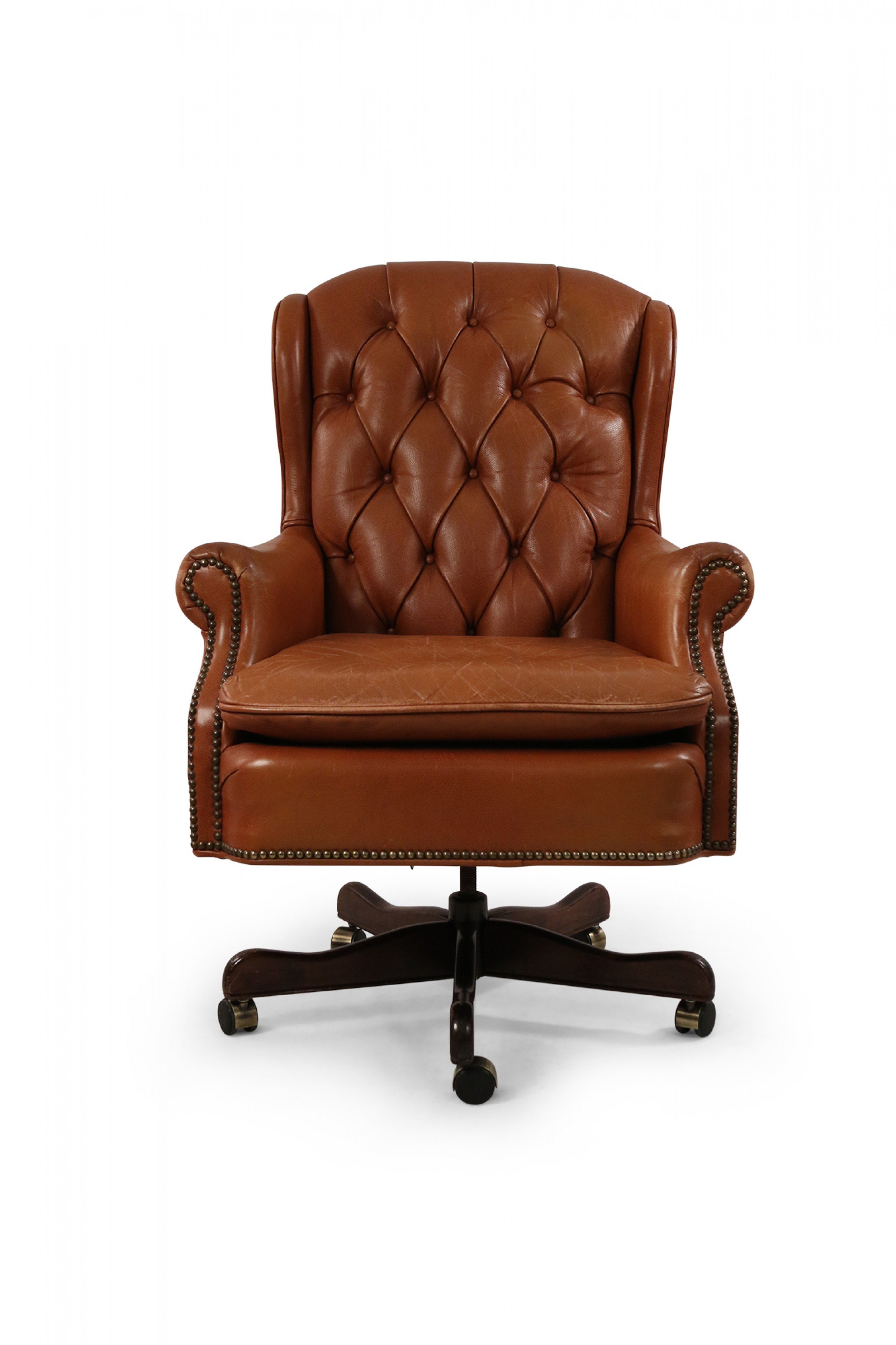 Mid-Century American brown tufted leather swivel office / wing armchair with brass upholstery nails and a wooden five leg rolling swivel base.