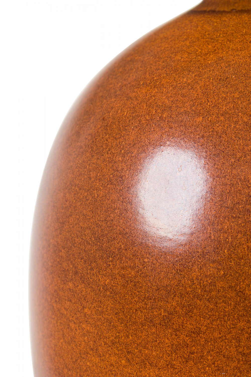 Mid-Century American ceramic table lamp in egg-like ovoid form with a pinched tapered neck extending to a fitted brass stem and functioning light switch socket, finished in a semi-gloss textured brown glaze with stippled gradations, mounted on a tapered circular brass stand..