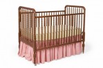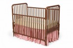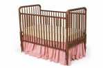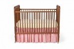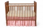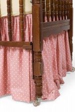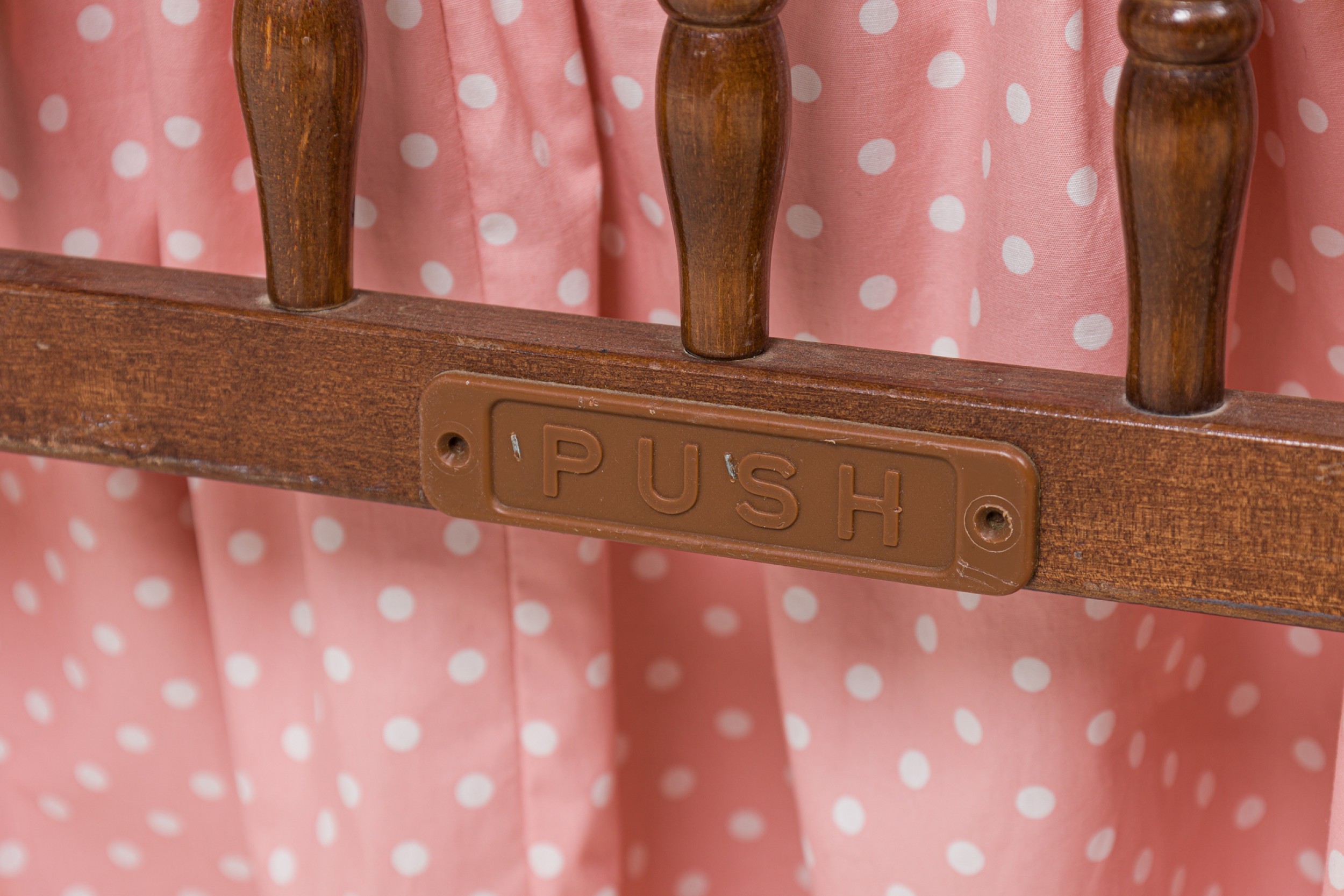 Mid-Century American baby crib with spindle turned bars and supports, groove carved lower frame, and locking sliding side panel, with interior spring mattress and pink and white polka dot bed skirt, resting on turned legs ending in clear plastic casters.