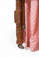 Style: Mid-Century Materials & Techniques: Fabric, turned, wood Category: Bedroom Condition: One caster missing, one broken in half, one lower rail detached and missing hardware. Not suitable for practical use. For display/prop purposes only. Good; Minor losses