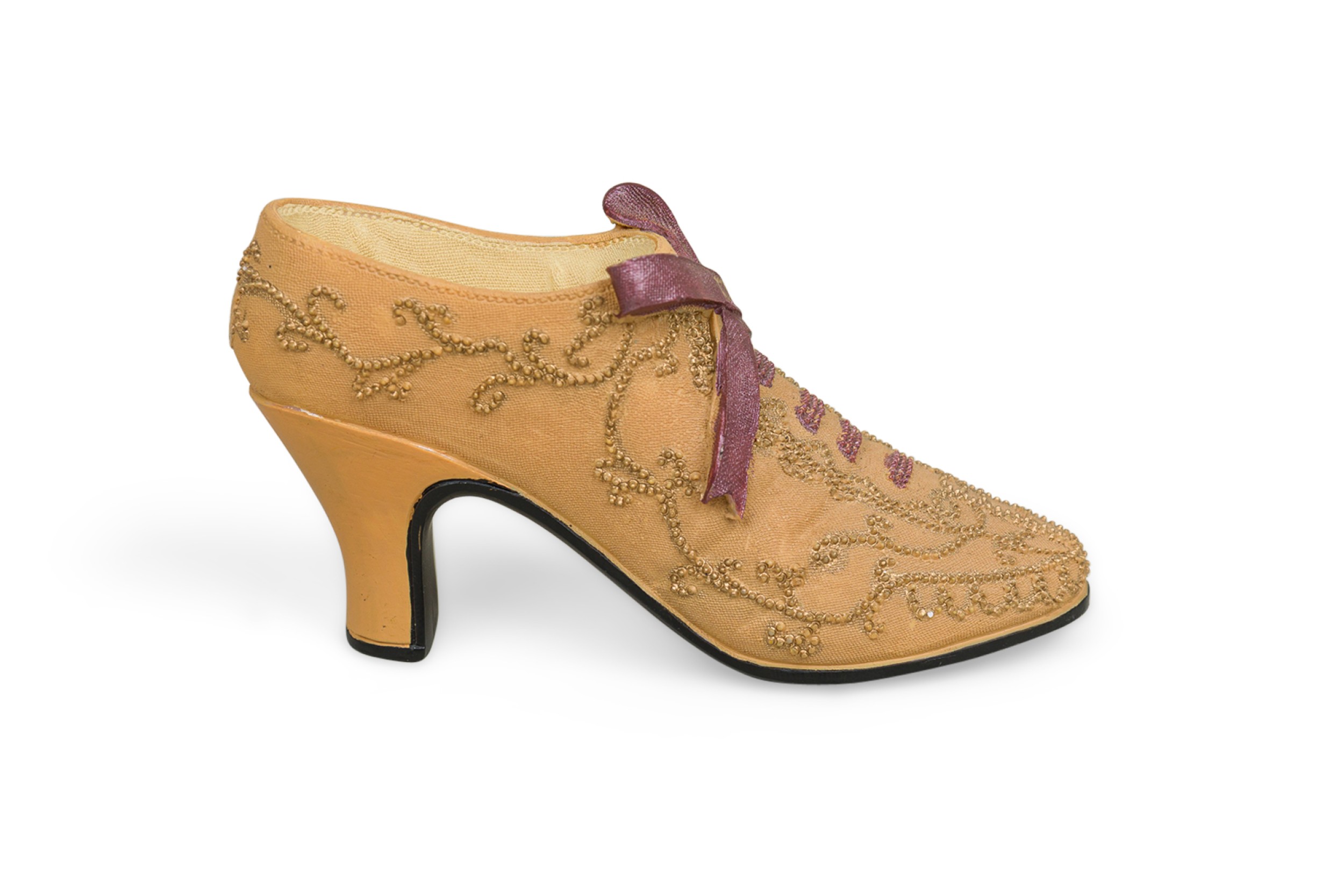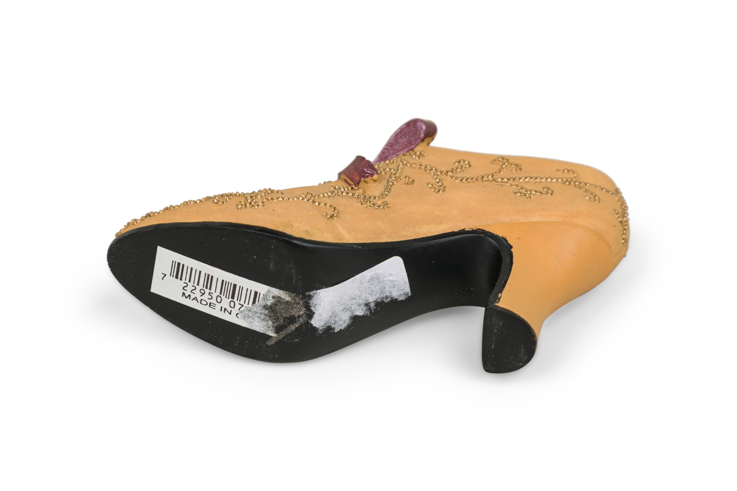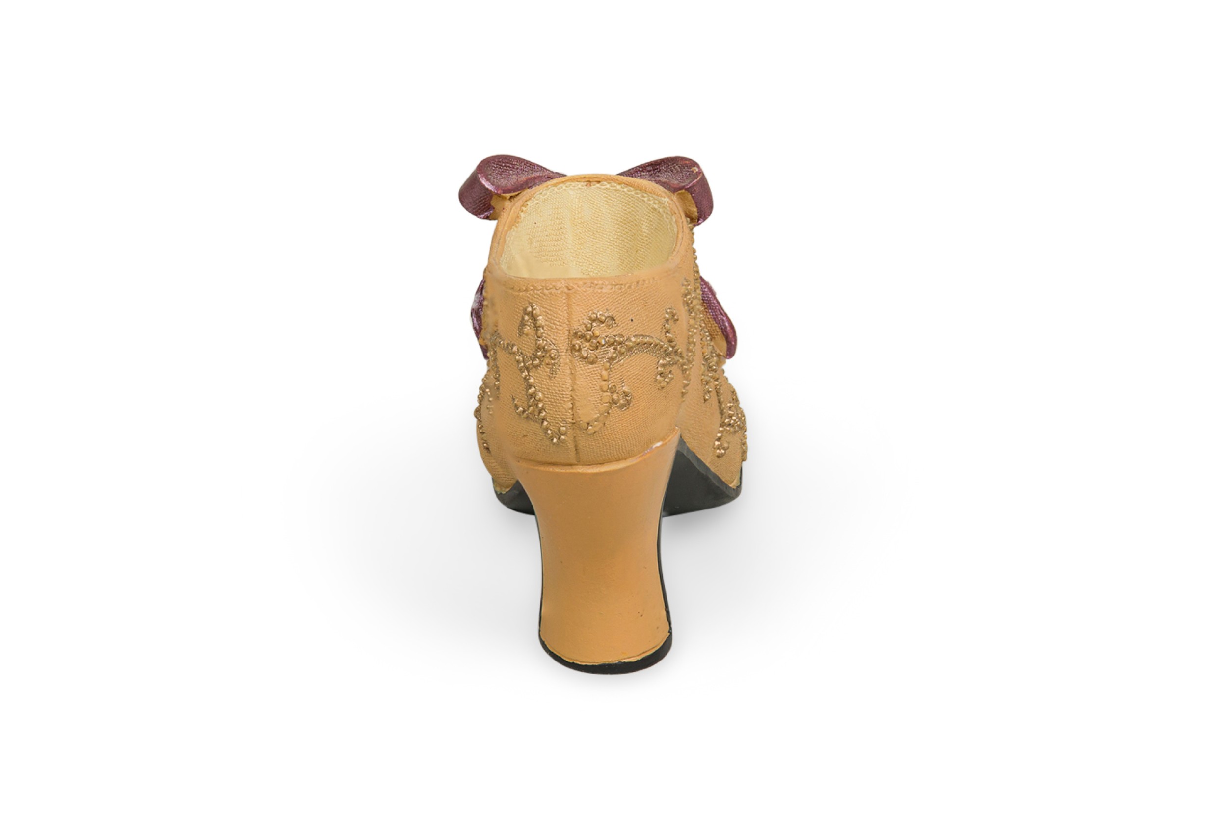 Mid-Century Continental small figurine of a pink high heel shoe with a purple bow (Collection NWL7892A-M).