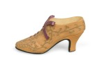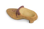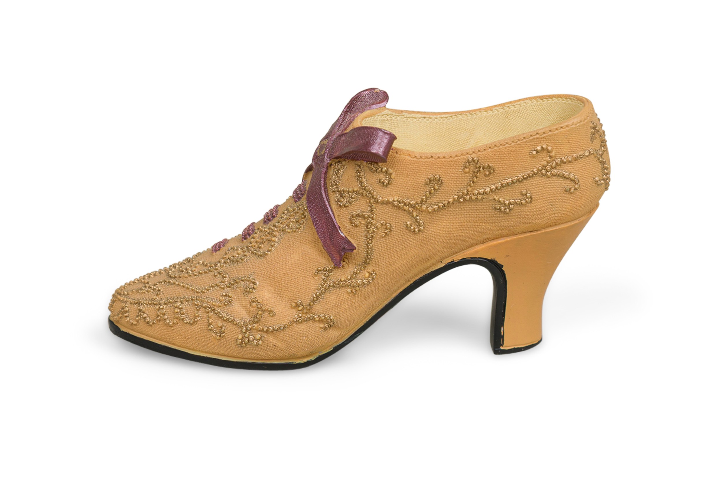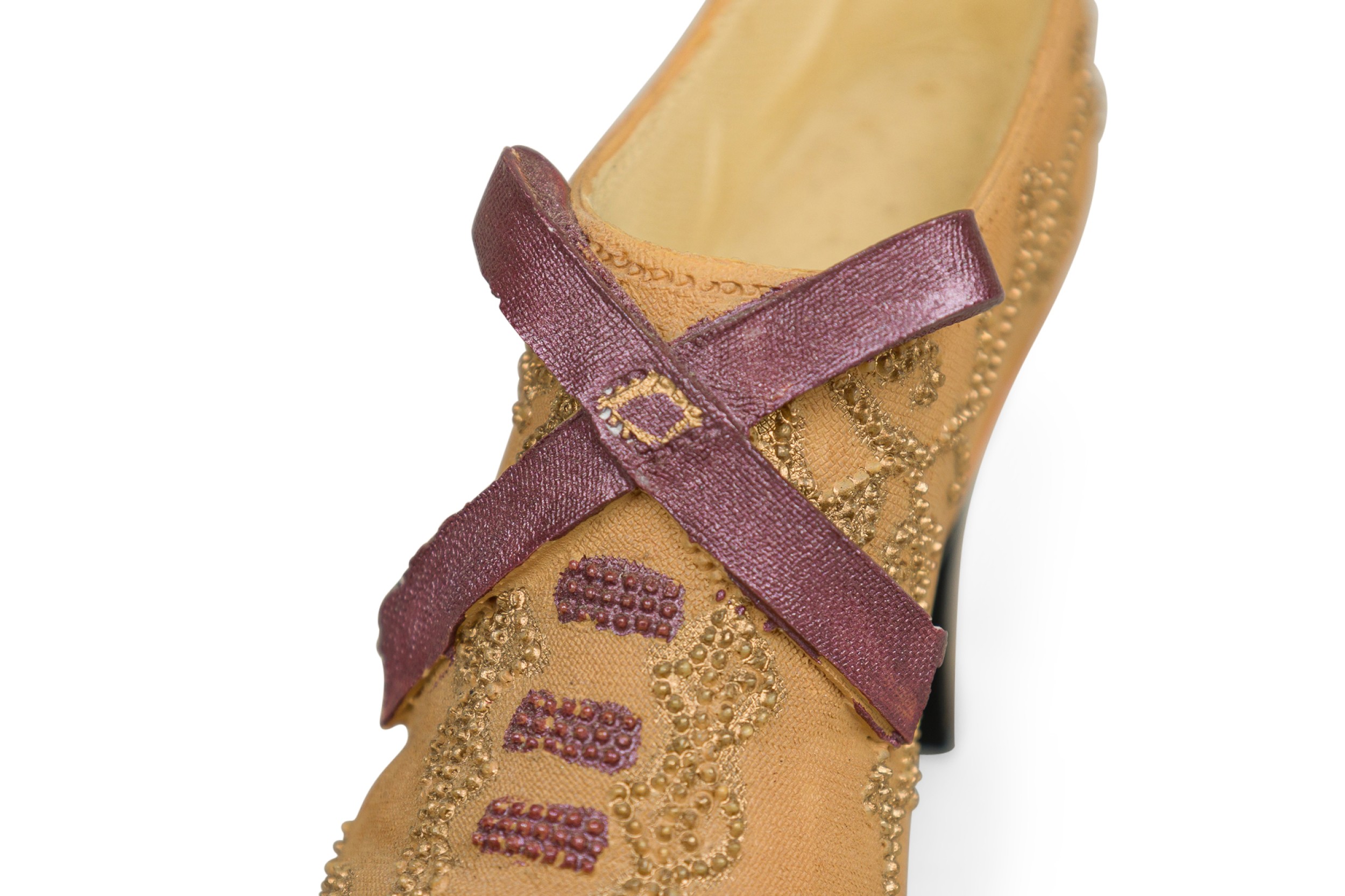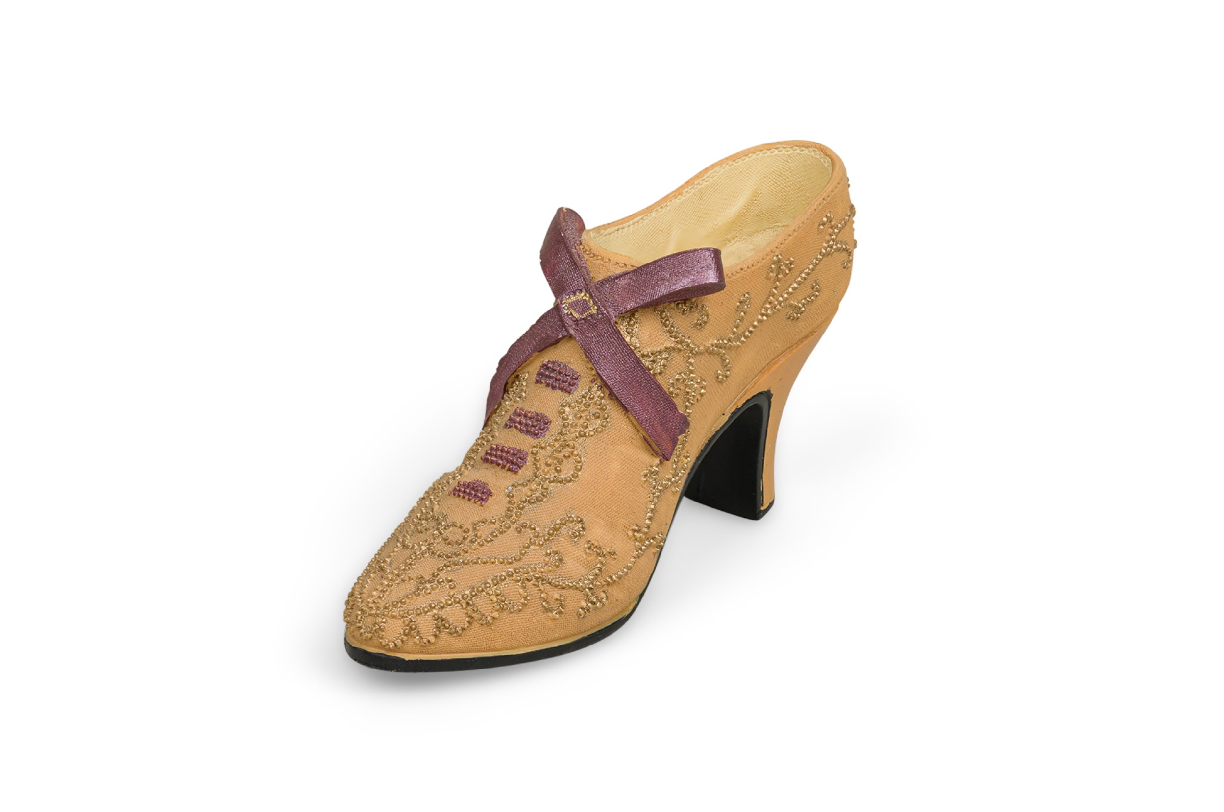 Mid-Century Continental small figurine of a pink high heel shoe with a purple bow (Collection NWL7892A-M).
