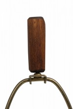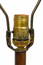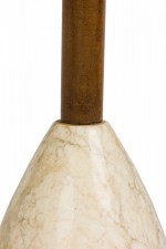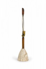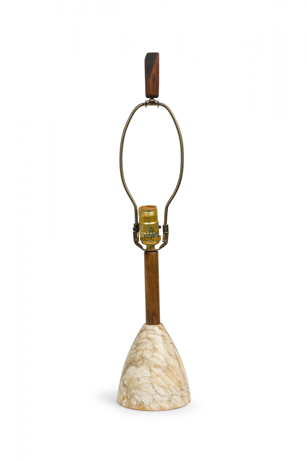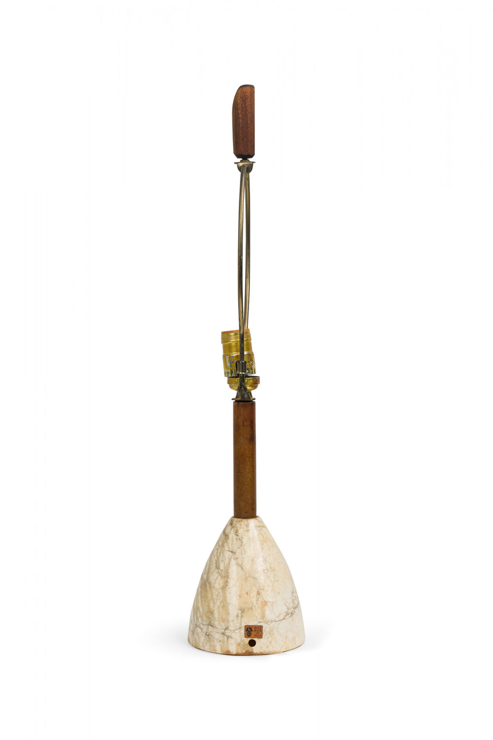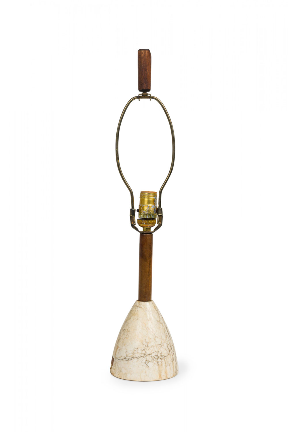 Style: Mid-Century Materials & Techniques: Brass, marble, metal, stone, wood Category: Lighting Condition: 23.5" height with harp & finial, socket loose, felt bottom worn. Non-functional electrics. Ships without shade. Good; Wear consistent with age and use