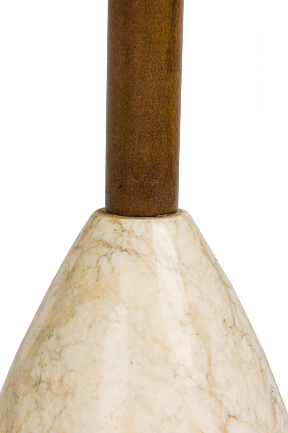 Mid-Century Italian carrara marble table lamp in bullet form featuring a wood stem protruding from the stone with a non-functioning brass light switch socket and harp. The marble has a striated brown texture over a beige ground with a smoothly polished finish and flattened bottom.