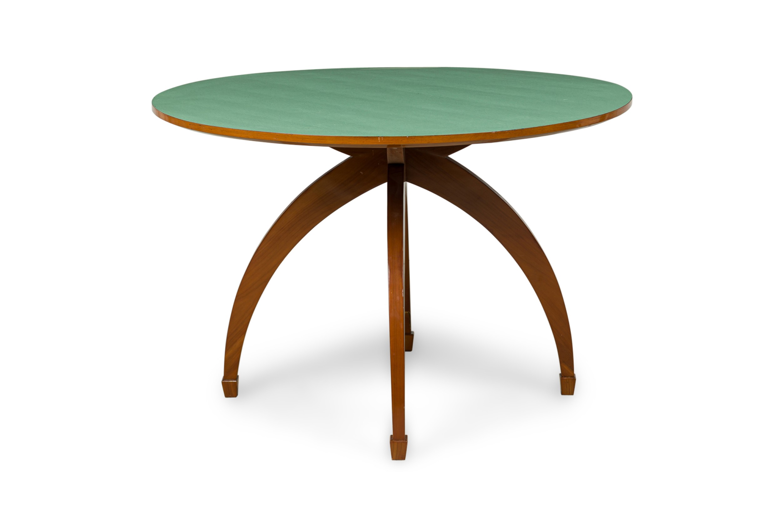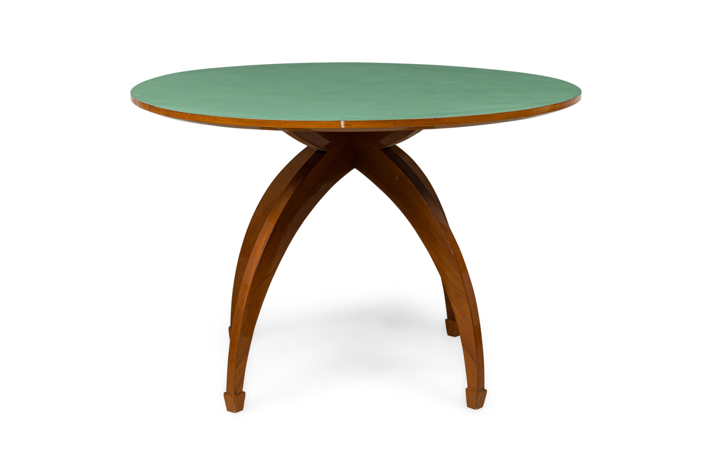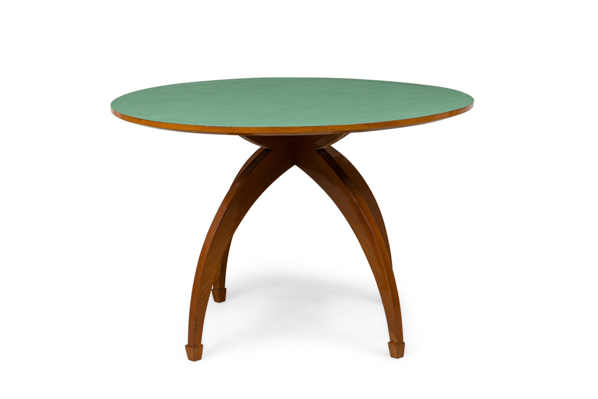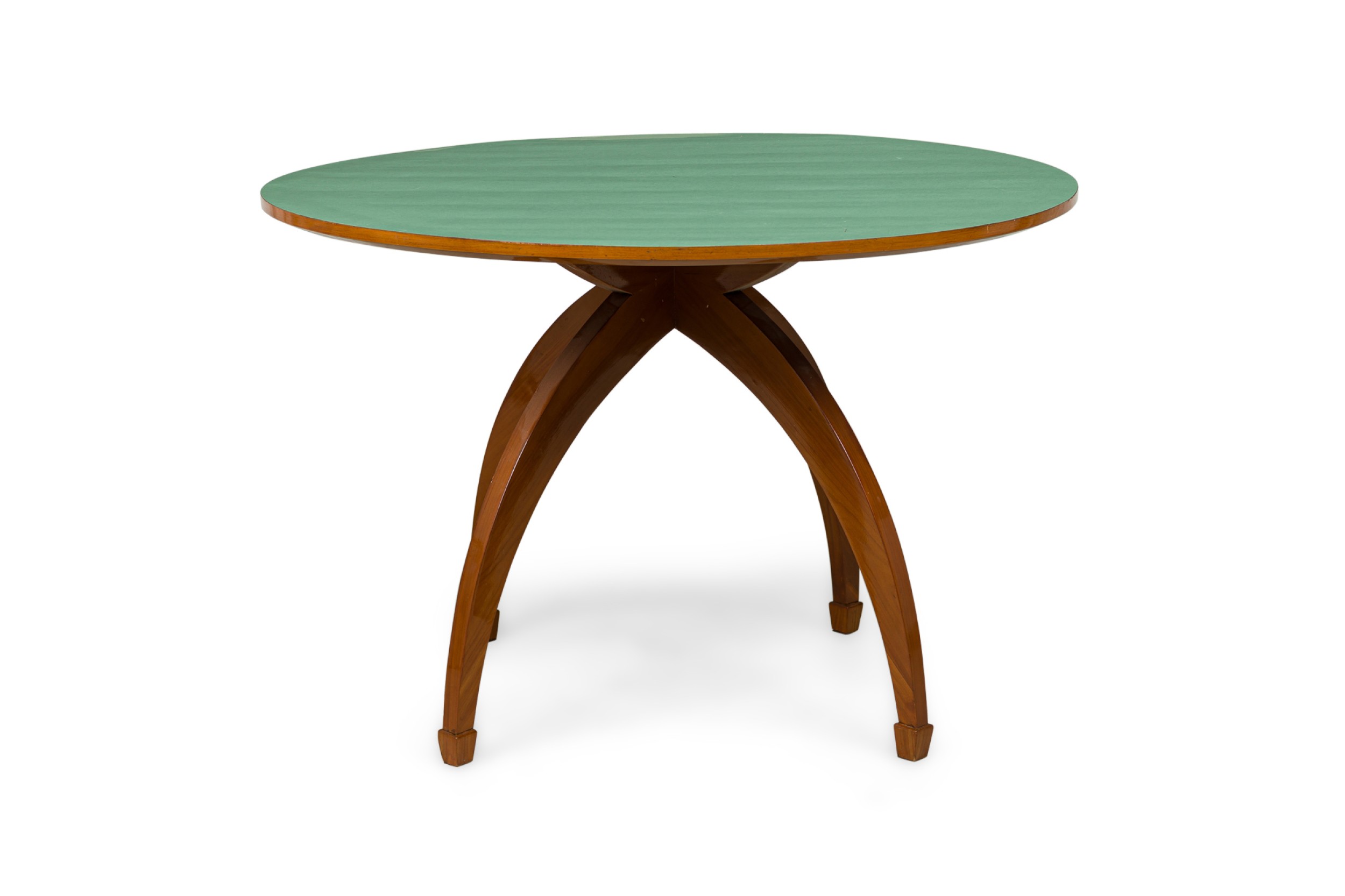 Italian Mid-Century Modern circular wood table on an X-form convex base with 4 tapered legs and carved square feet.