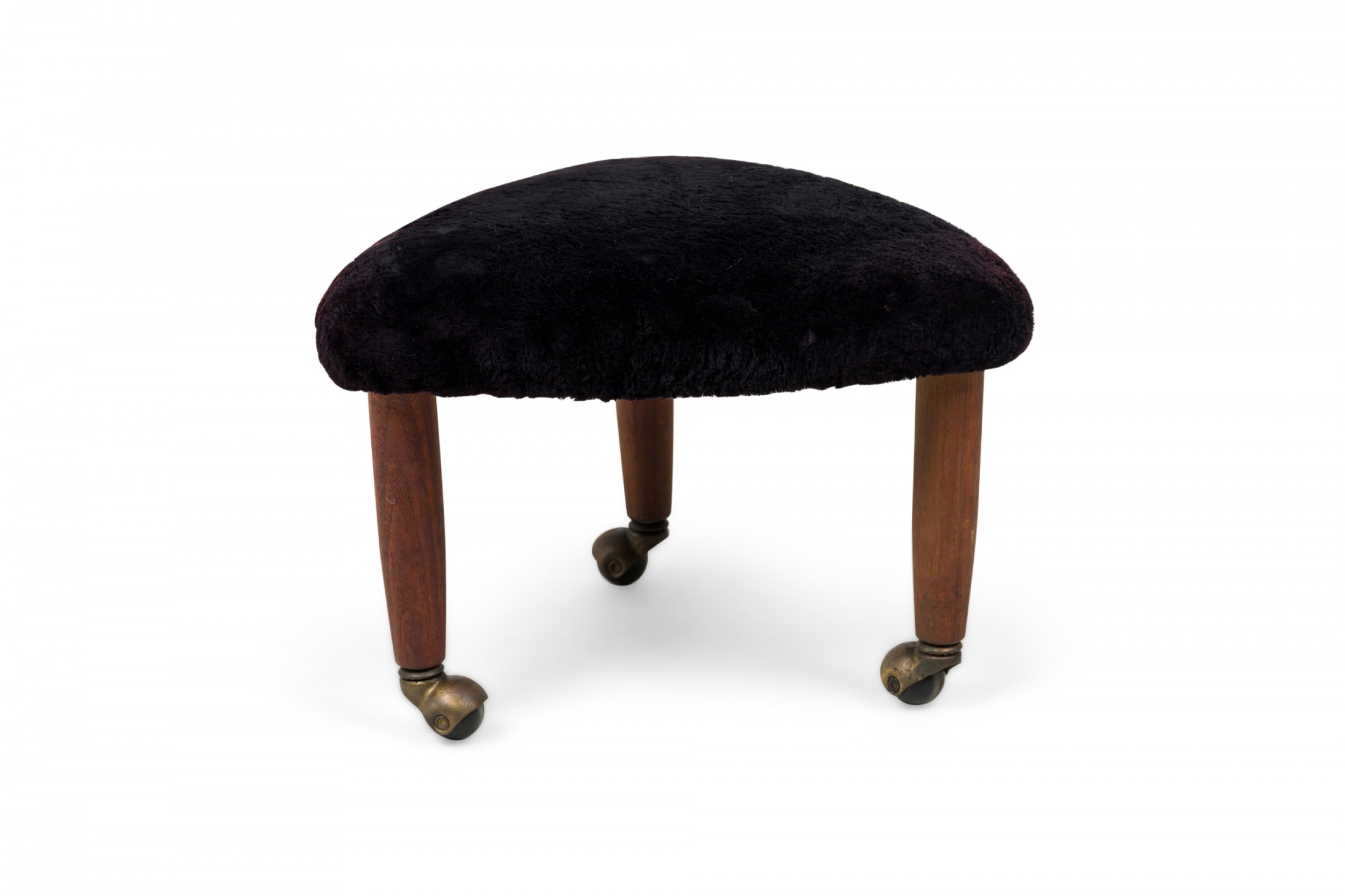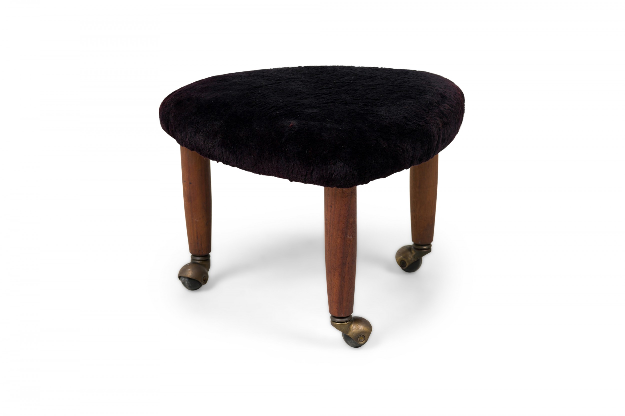 Mid-Century Italian Modern triangular footstool, upholstered in plush black velour, standing on 3 legs with brass casters. (manner of GIO PONTI)(Available in orange: REG4086 as a PAIR).