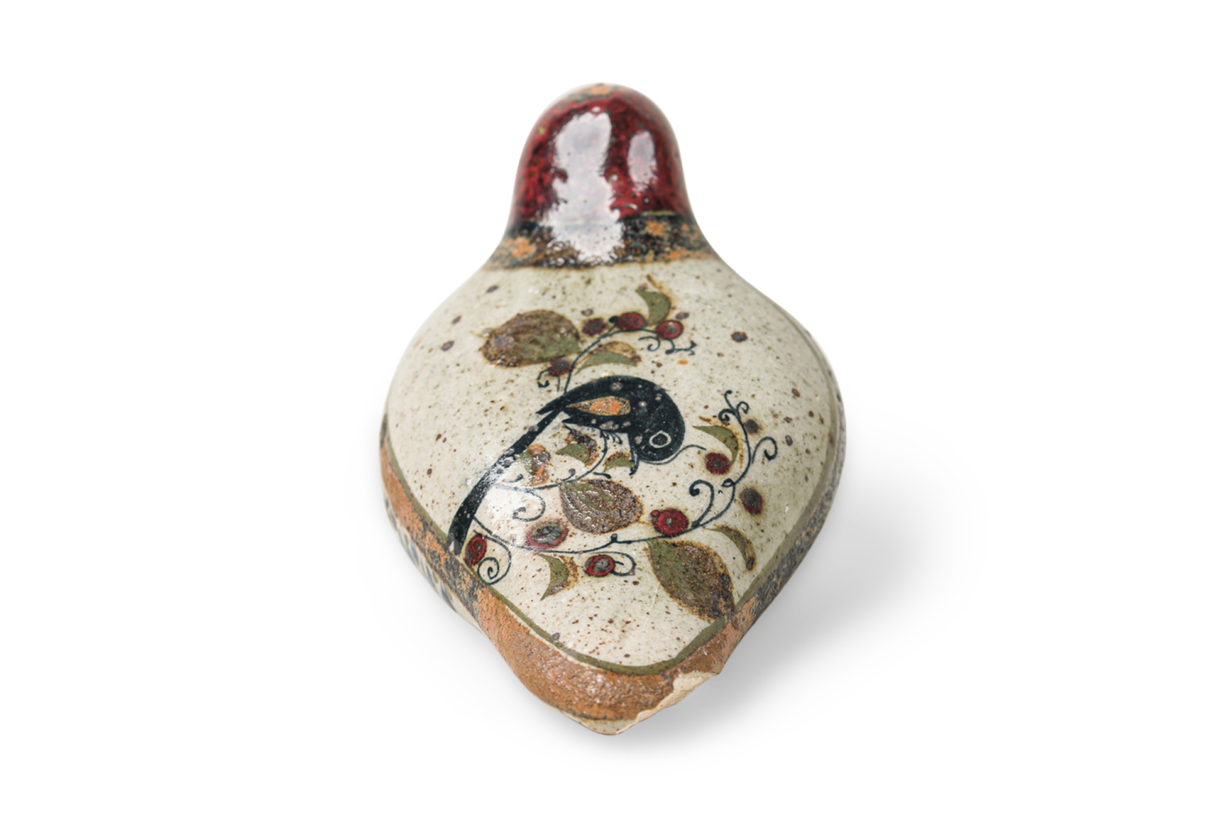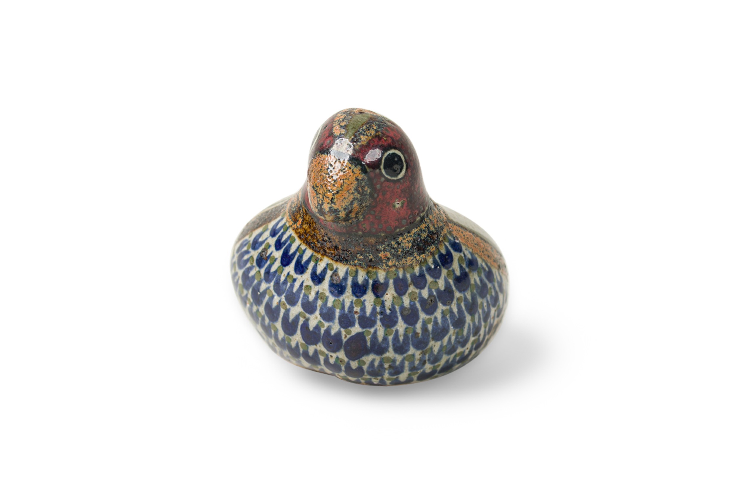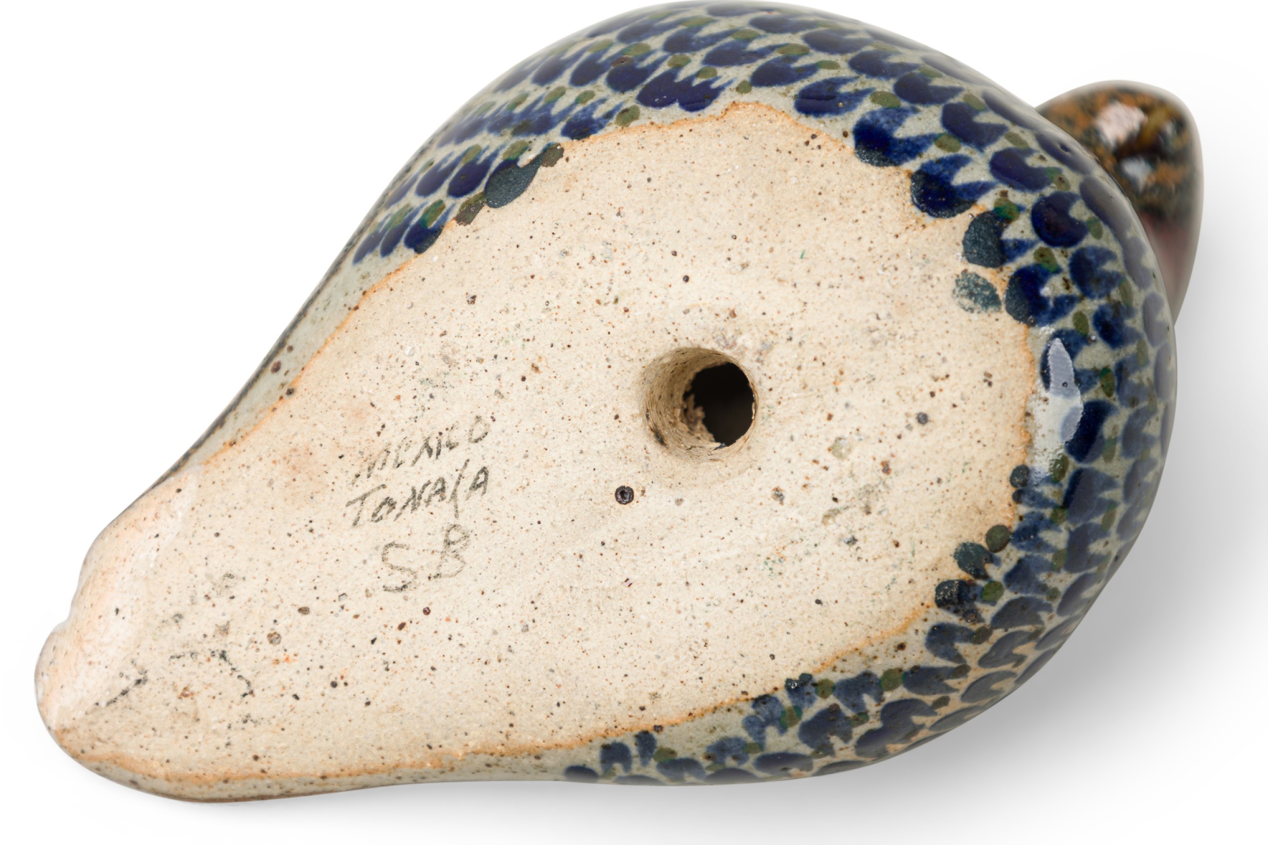 Mexican Mid-Century pottery bird figurine with red, white, and blue painted traditional folk art motifs (signed TONALA, Mexico).