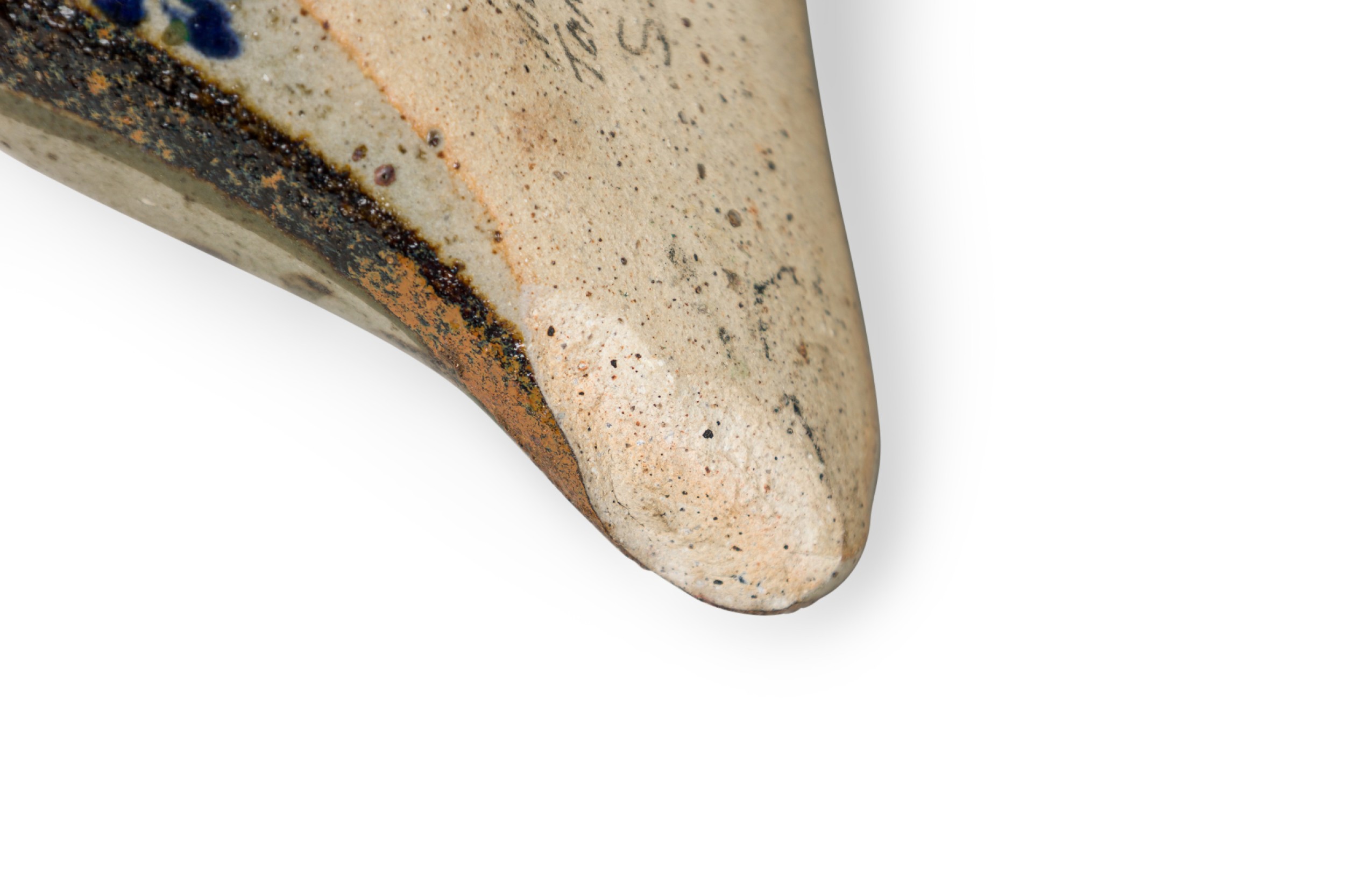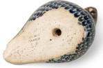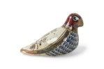 Mexican Mid-Century pottery bird figurine with red, white, and blue painted traditional folk art motifs (signed TONALA, Mexico)
