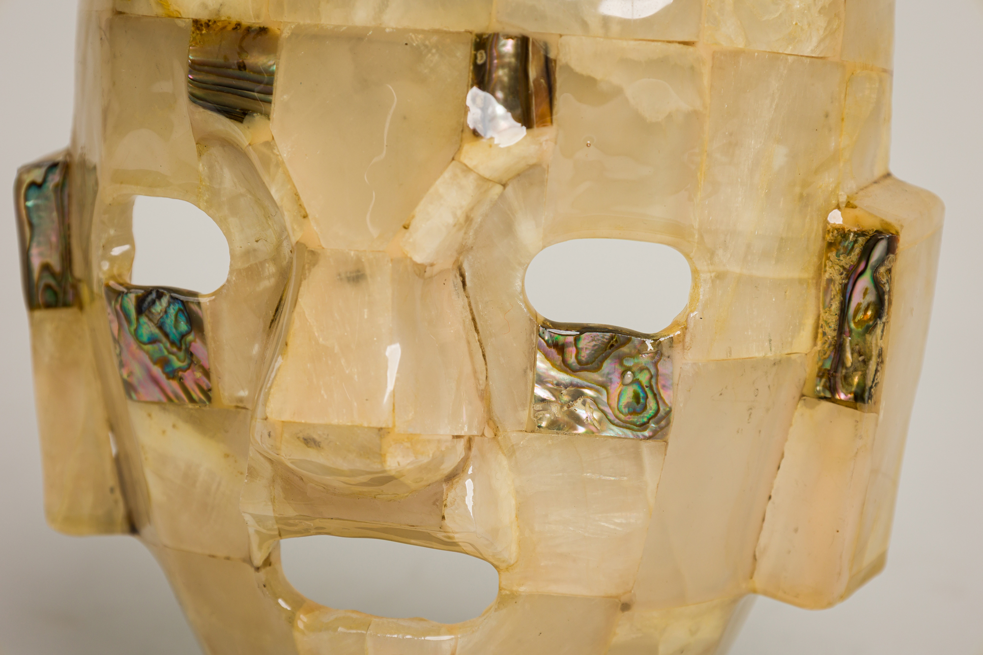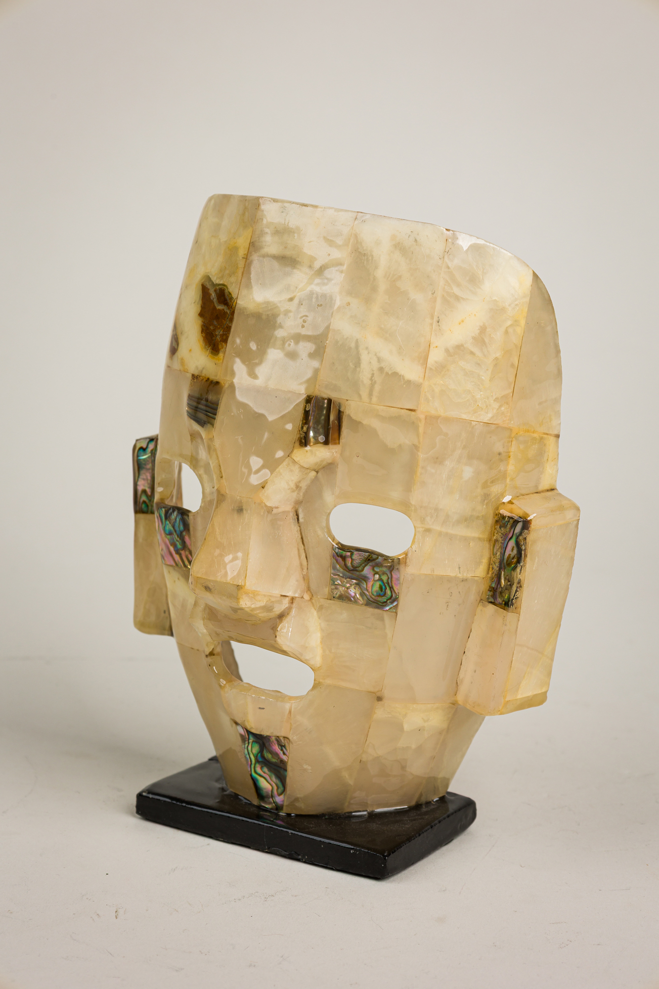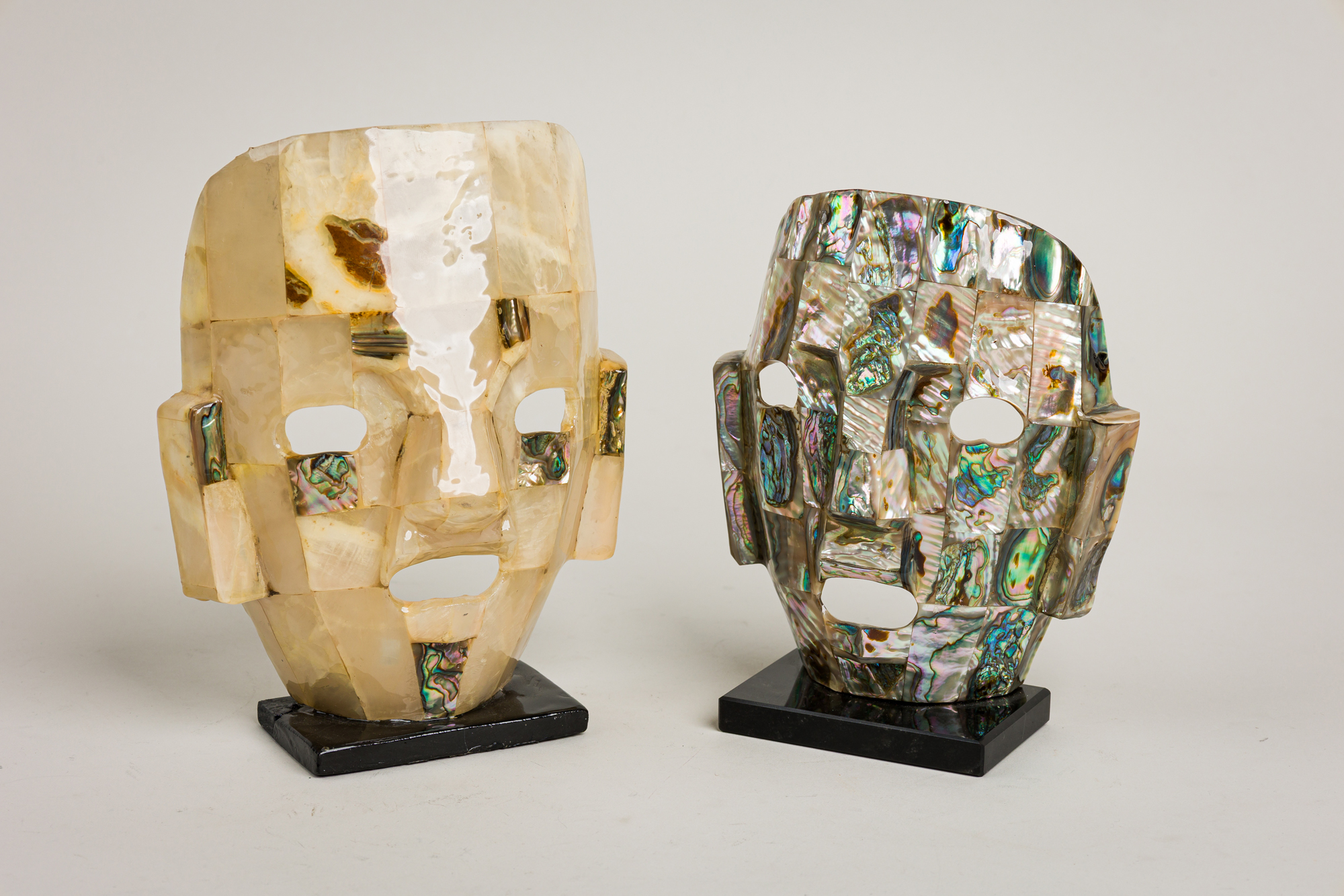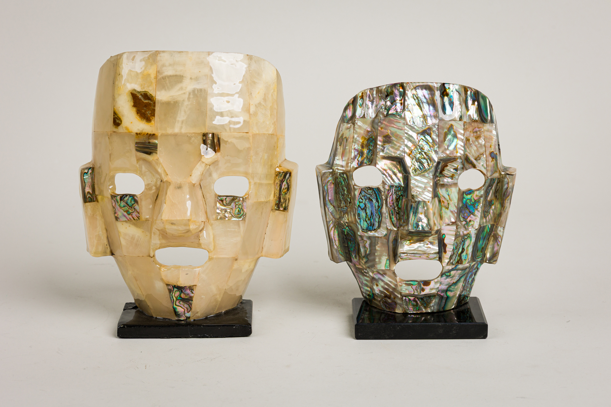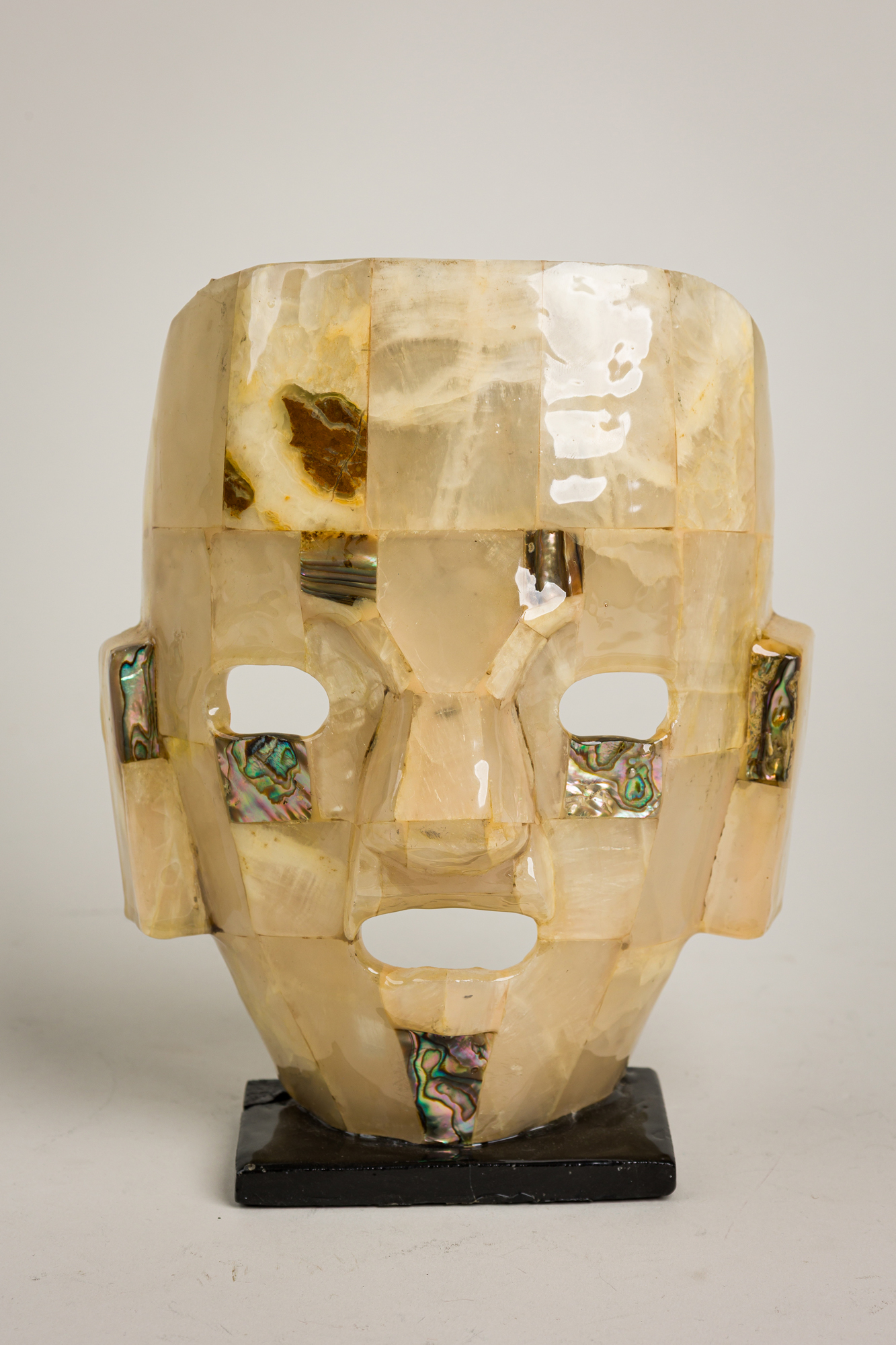 2 Mid-Century modern Pre-Columbian style Aztec masks made with various tesselated semi-precious stone (onyx, mother-of-pearl) (PRICED EACH).