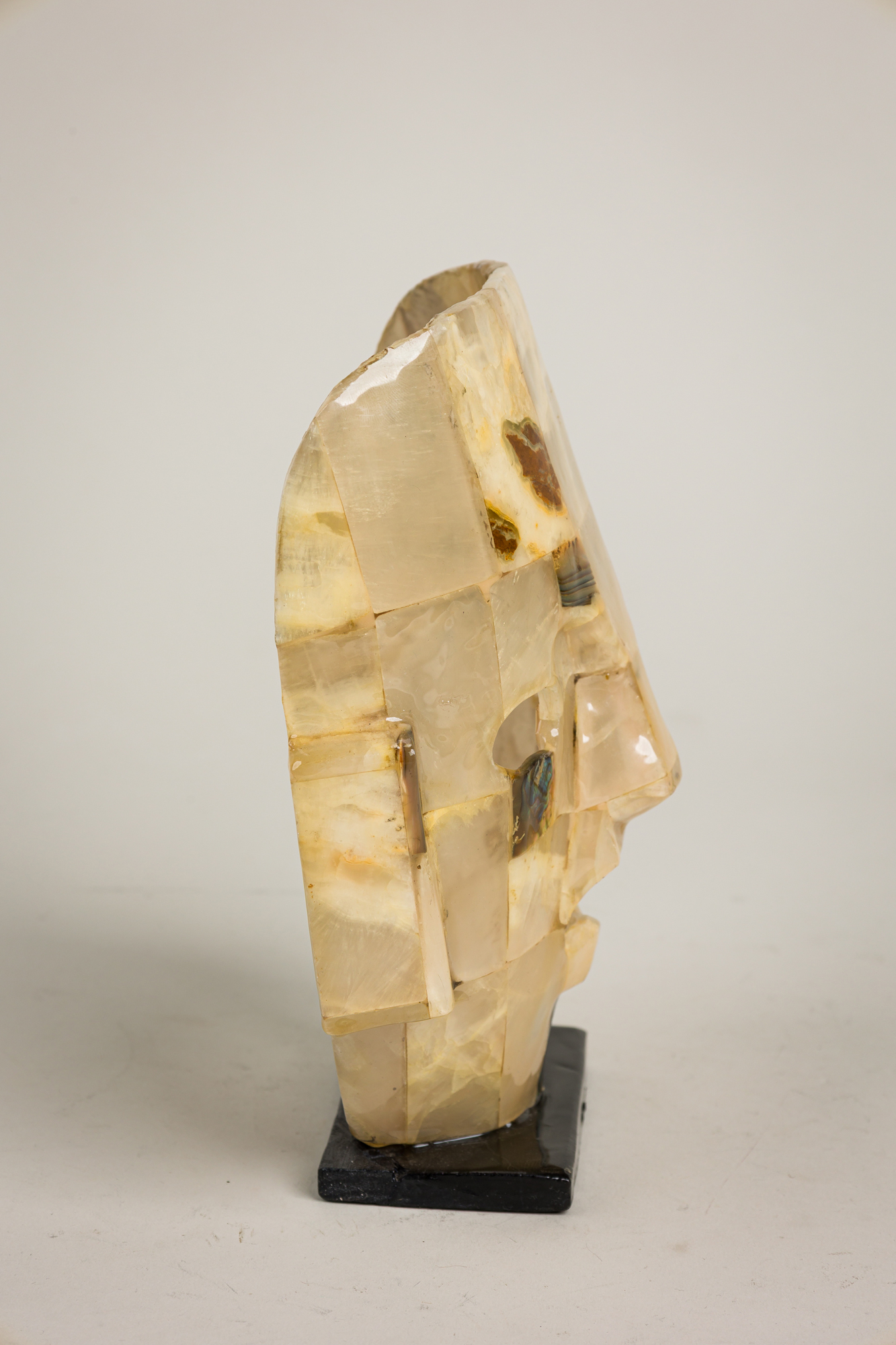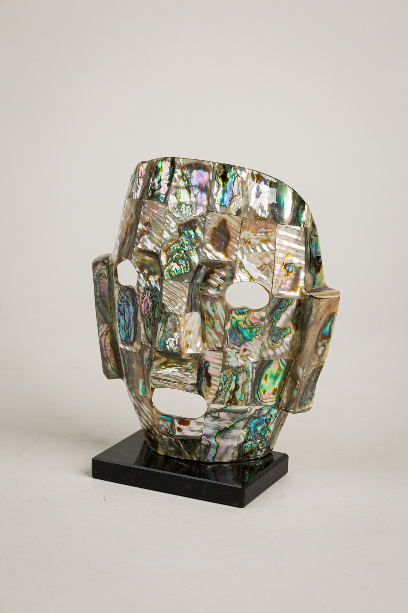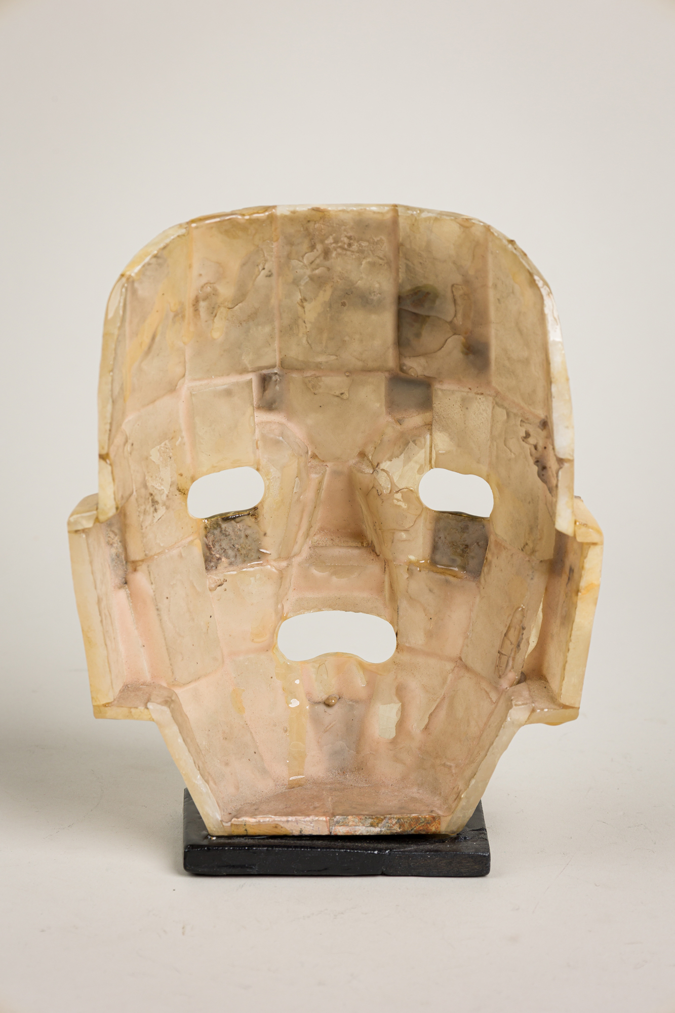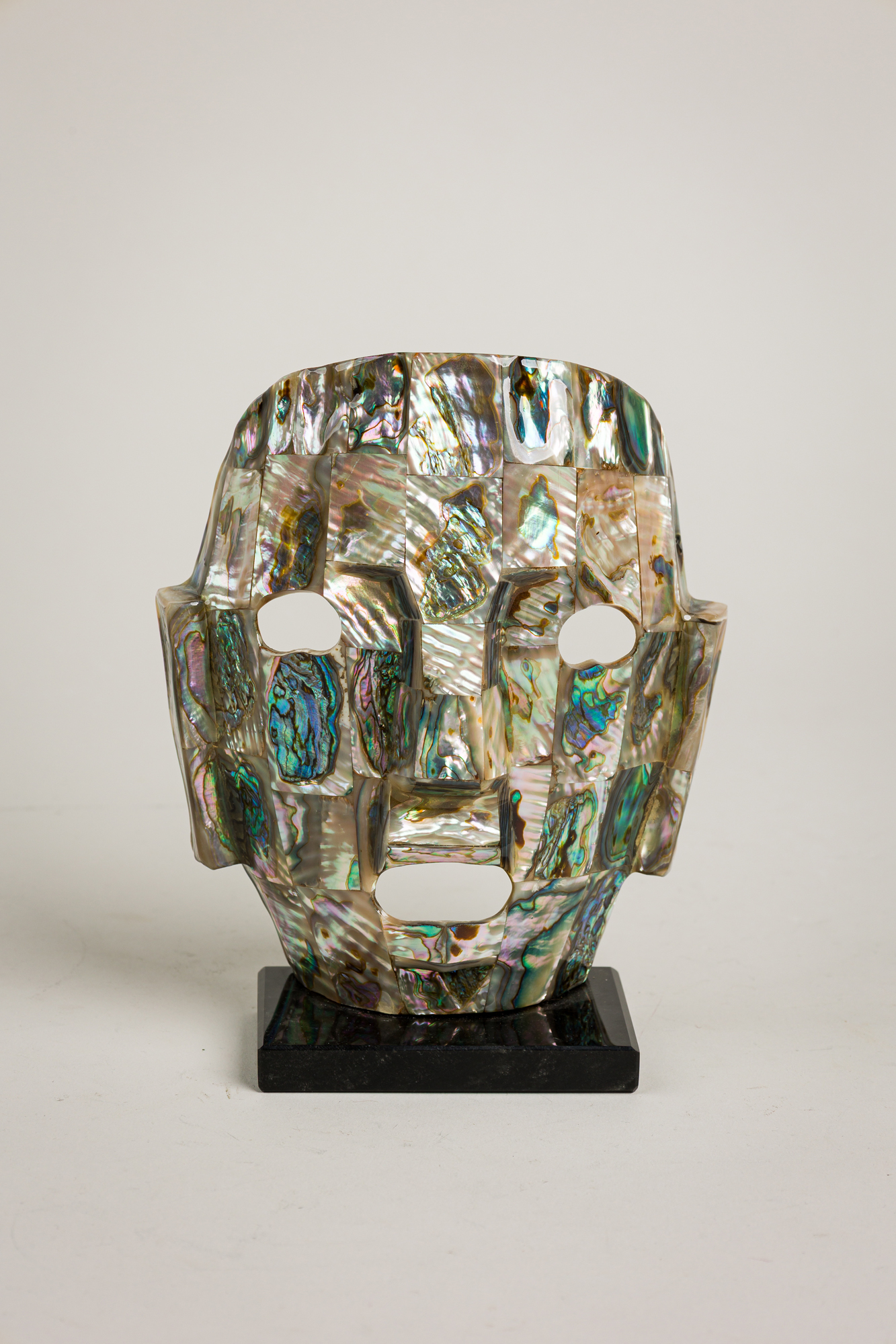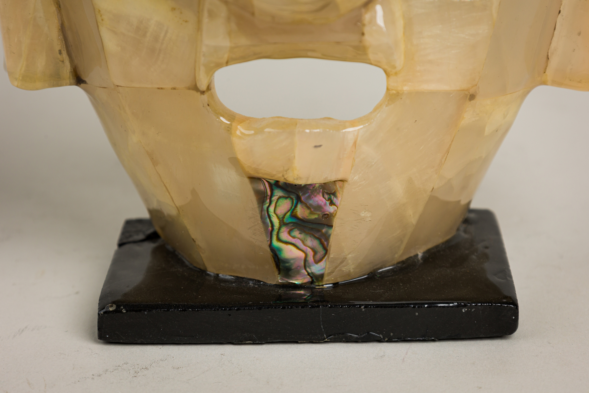 2 Mid-Century modern Pre-Columbian style Aztec masks made with various tesselated semi-precious stone (onyx, mother-of-pearl) (PRICED EACH).