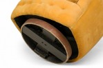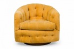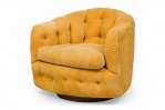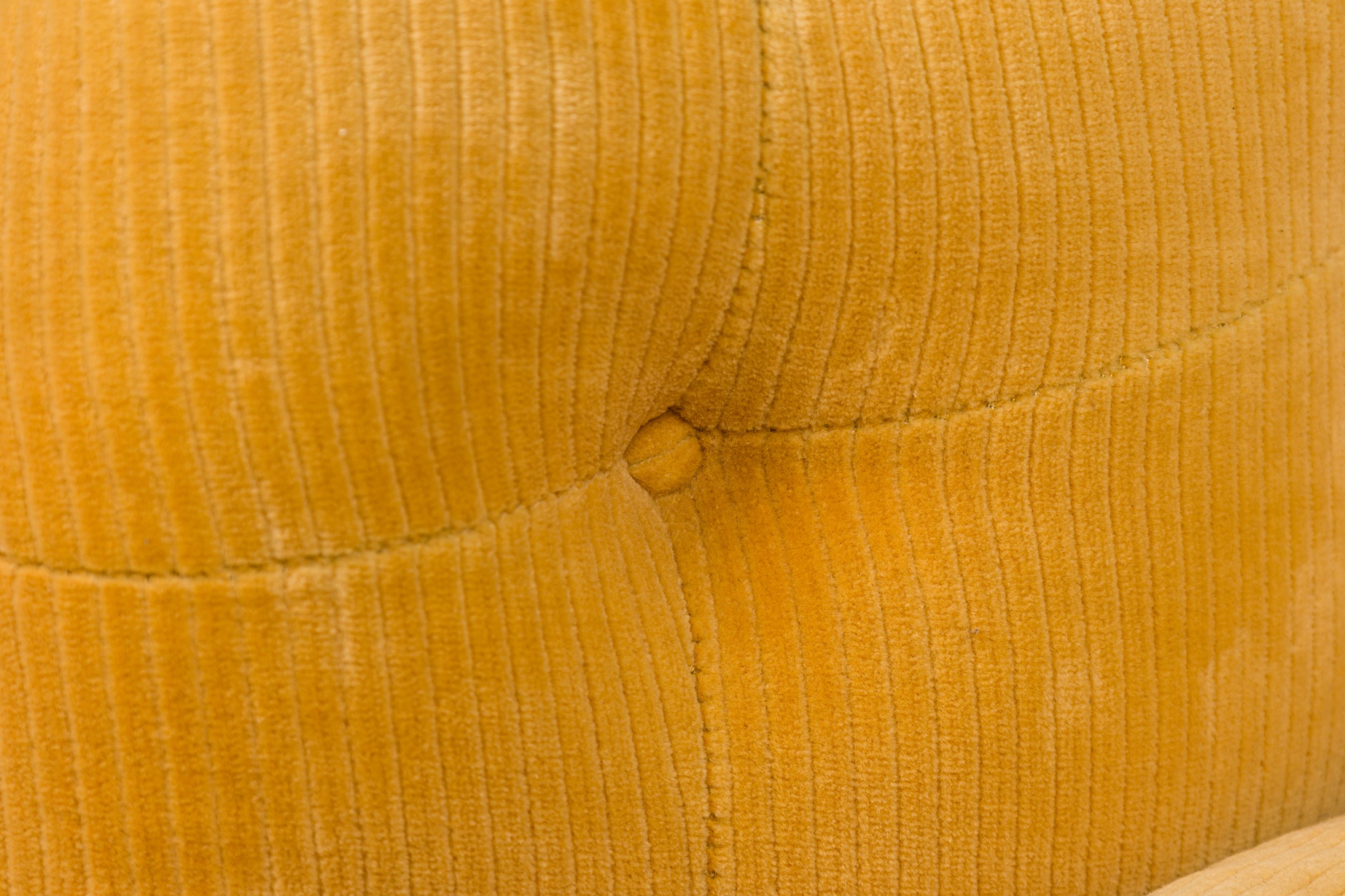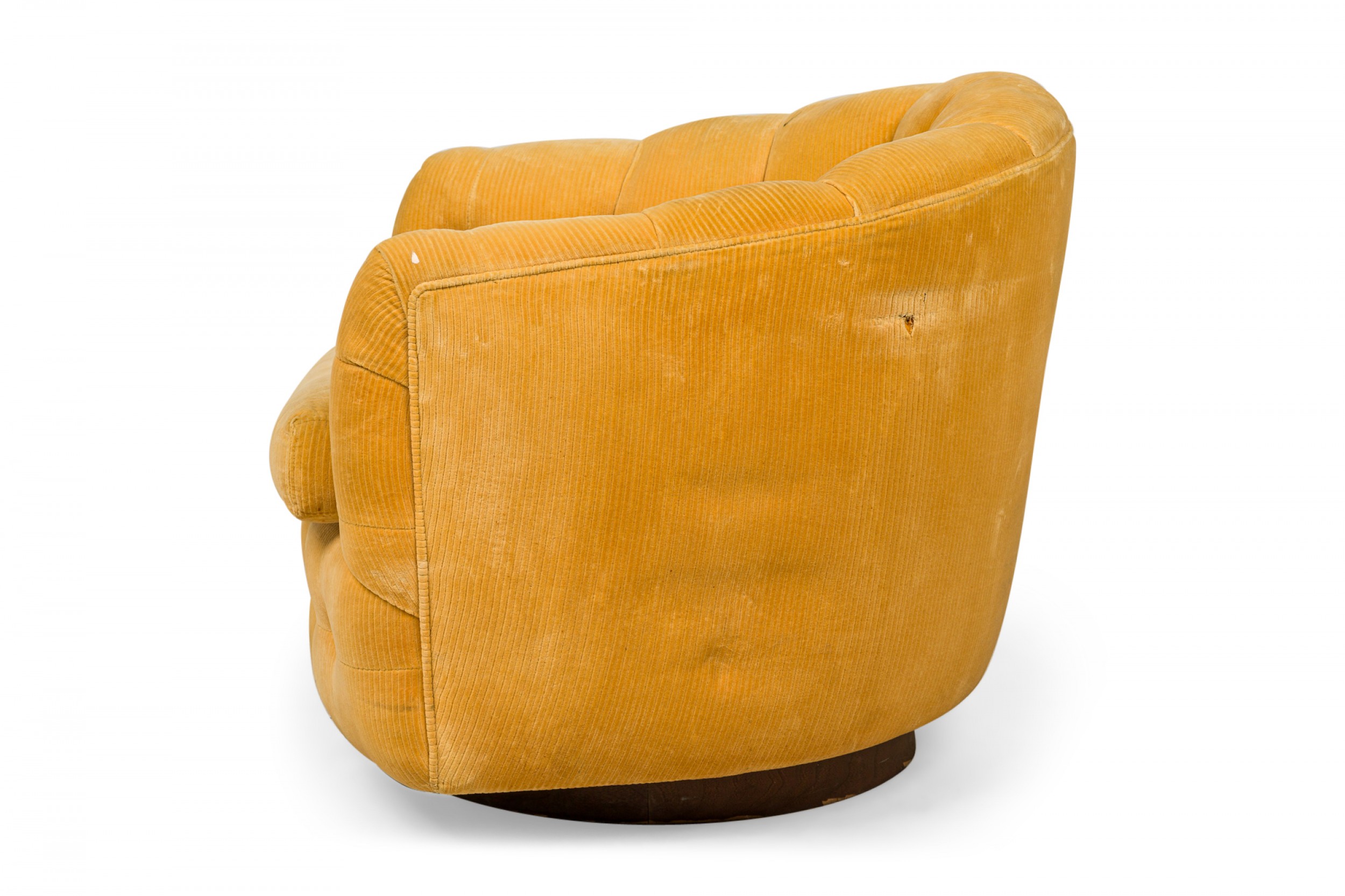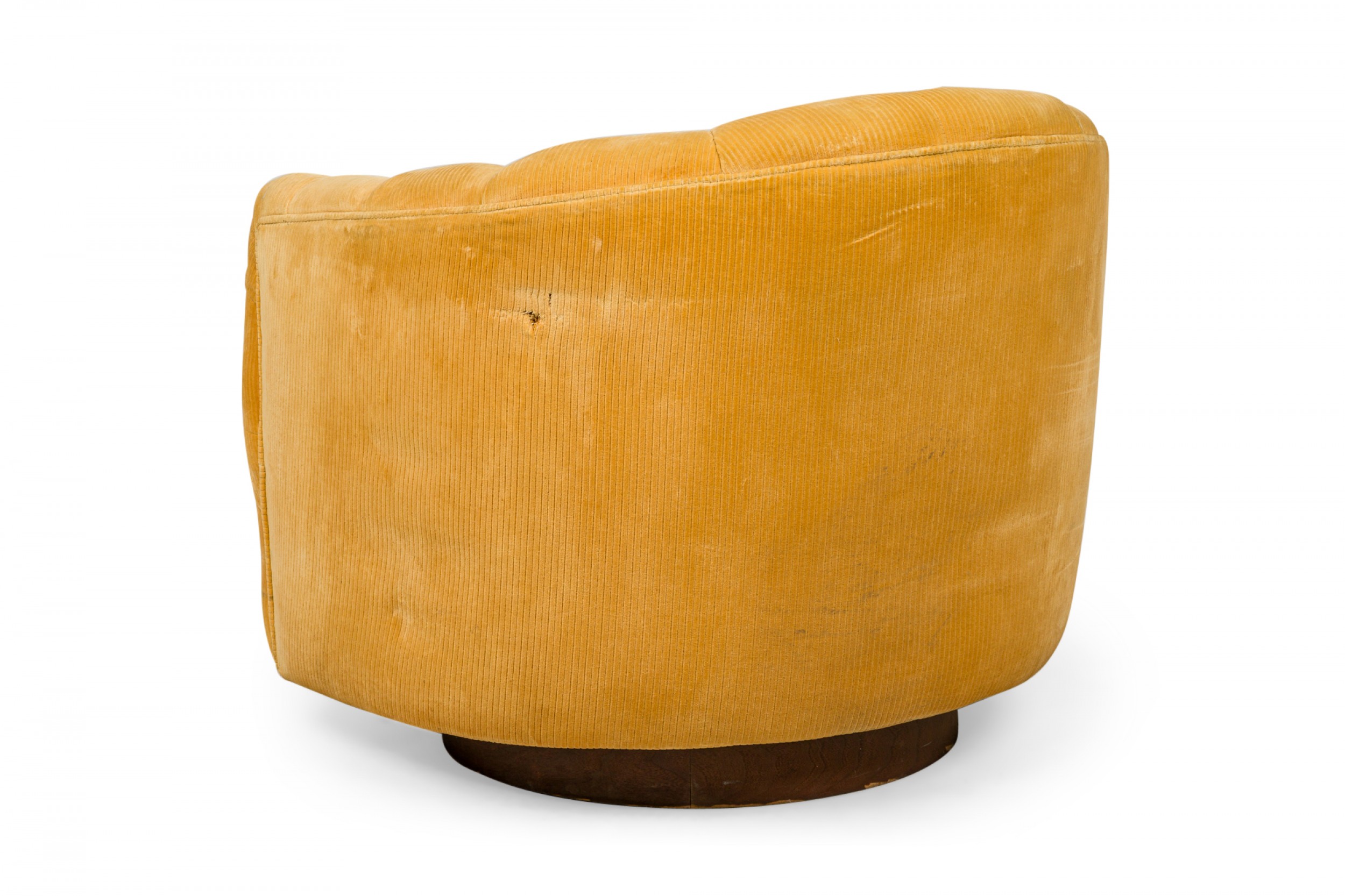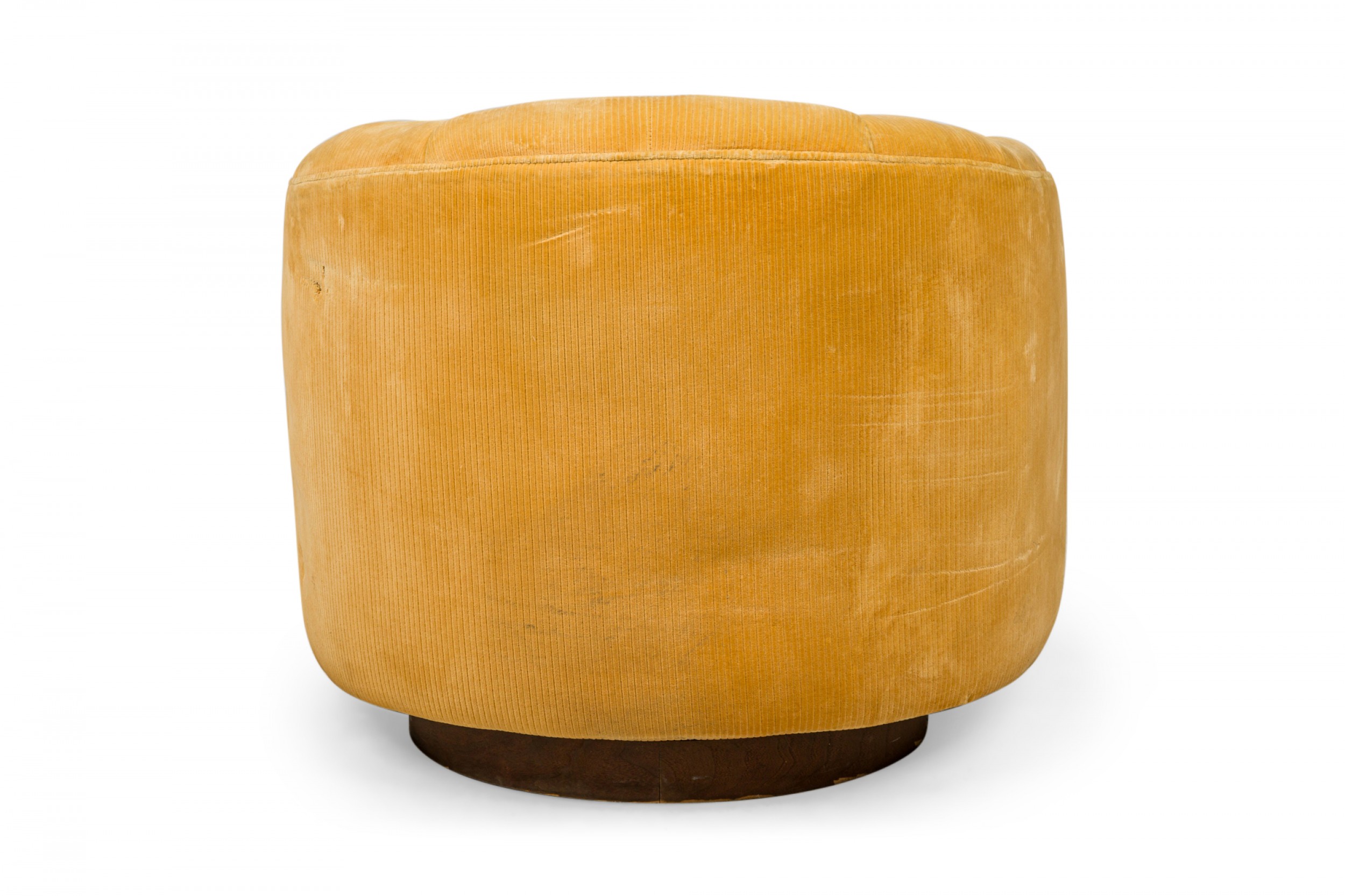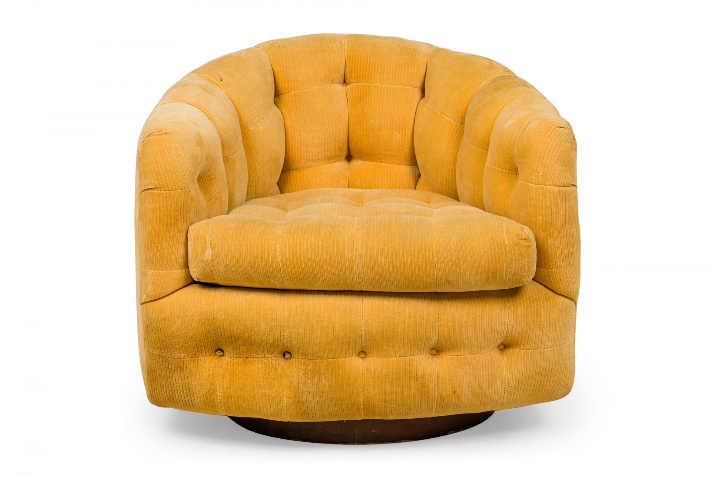 American Mid-Century horseshoe-form lounge / armchair with canary yellow button tufted velour upholstery with a removable seat cushion resting on a wood veneer plinth base. (MILO BAUGHMAN FOR THAYER COGGIN).