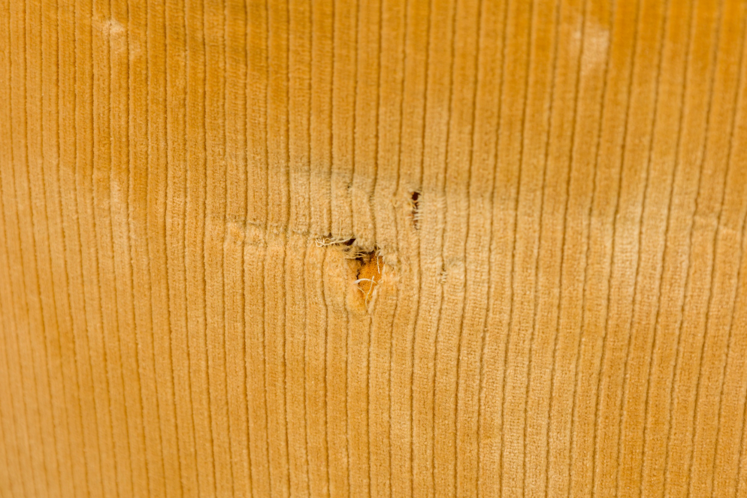 Style: Mid-Century Materials & Techniques: Tufted, upholstered, velour, wood Category: Seating Condition: There is a tear on the back of the chair. and some marks on the arms. Good; Wear consistent with age and use