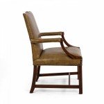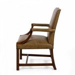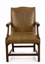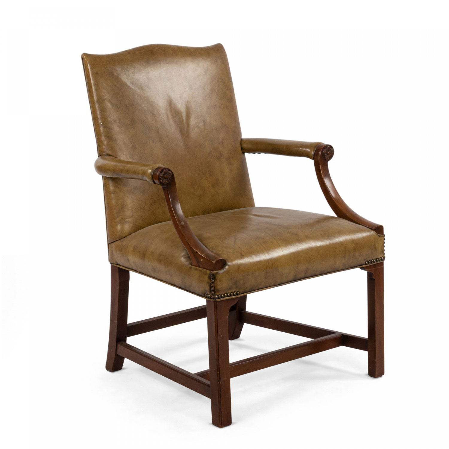 English Georgian style (20th Cent) arm chair with tan leather seat, shaped back and arm rests with brass nail head trim and carved floral detail at arm..