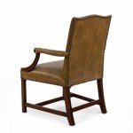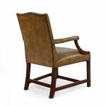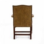 English Georgian style (20th Cent) arm chair with tan leather seat, shaped back and arm rests with brass nail head trim and carved floral detail at arm.