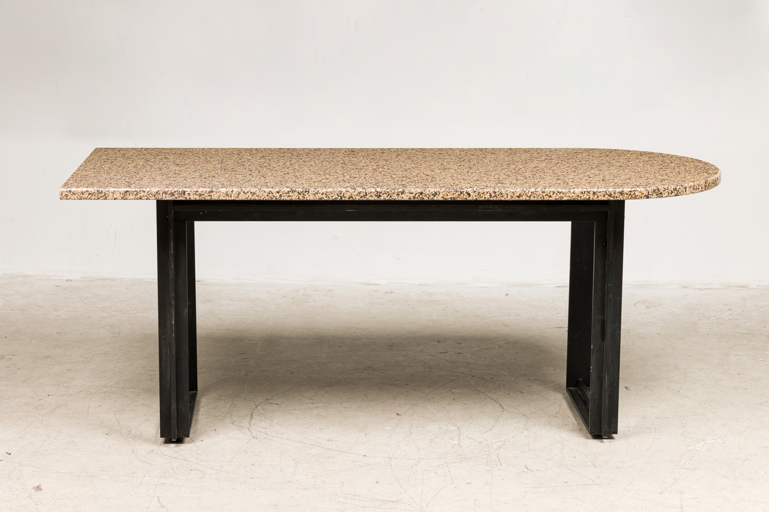 C. 1970s, USA, granite top with one rounded side, over architectural black powder coated flat bar steel, 29"h x 71"l x 30"w