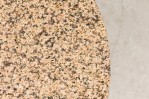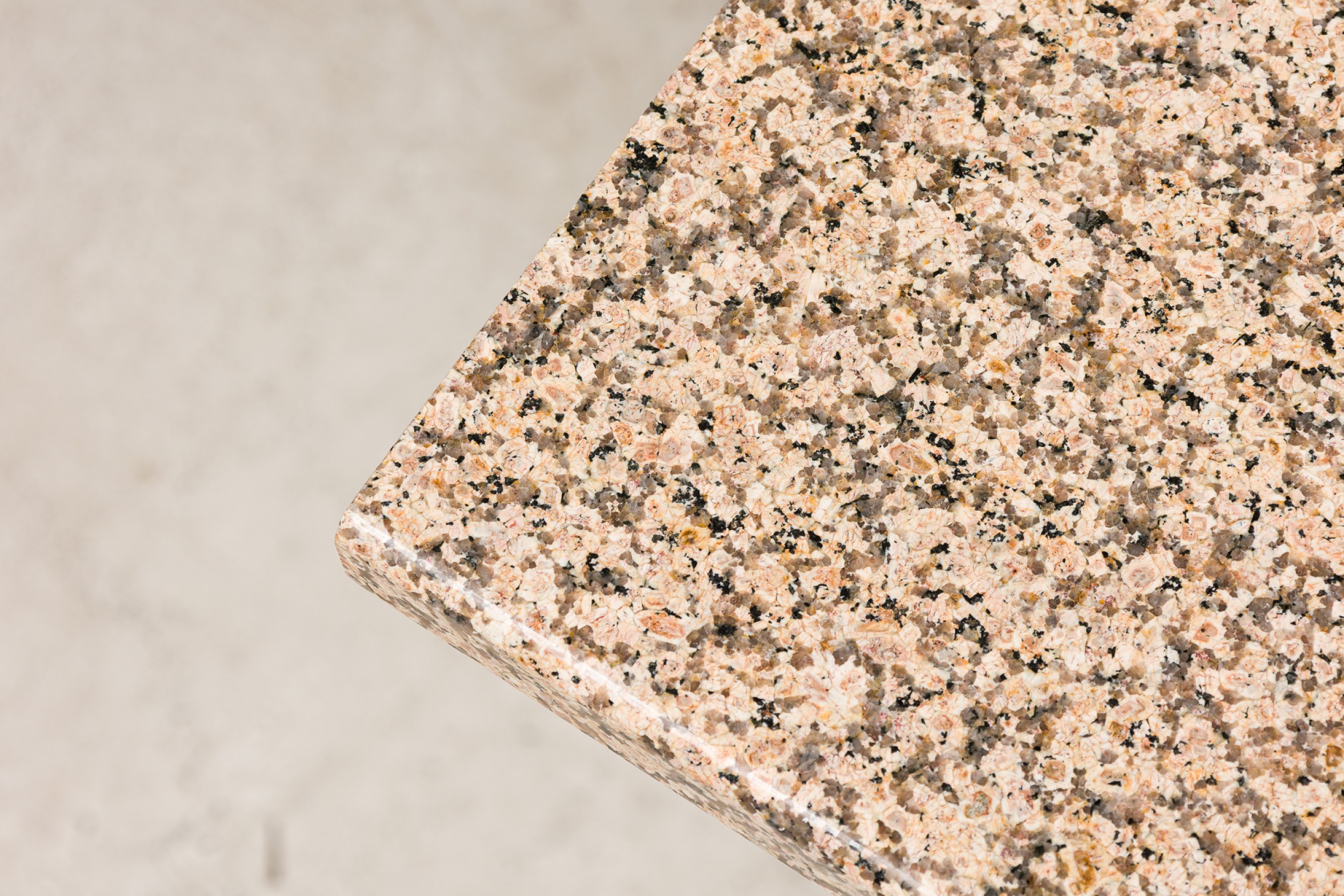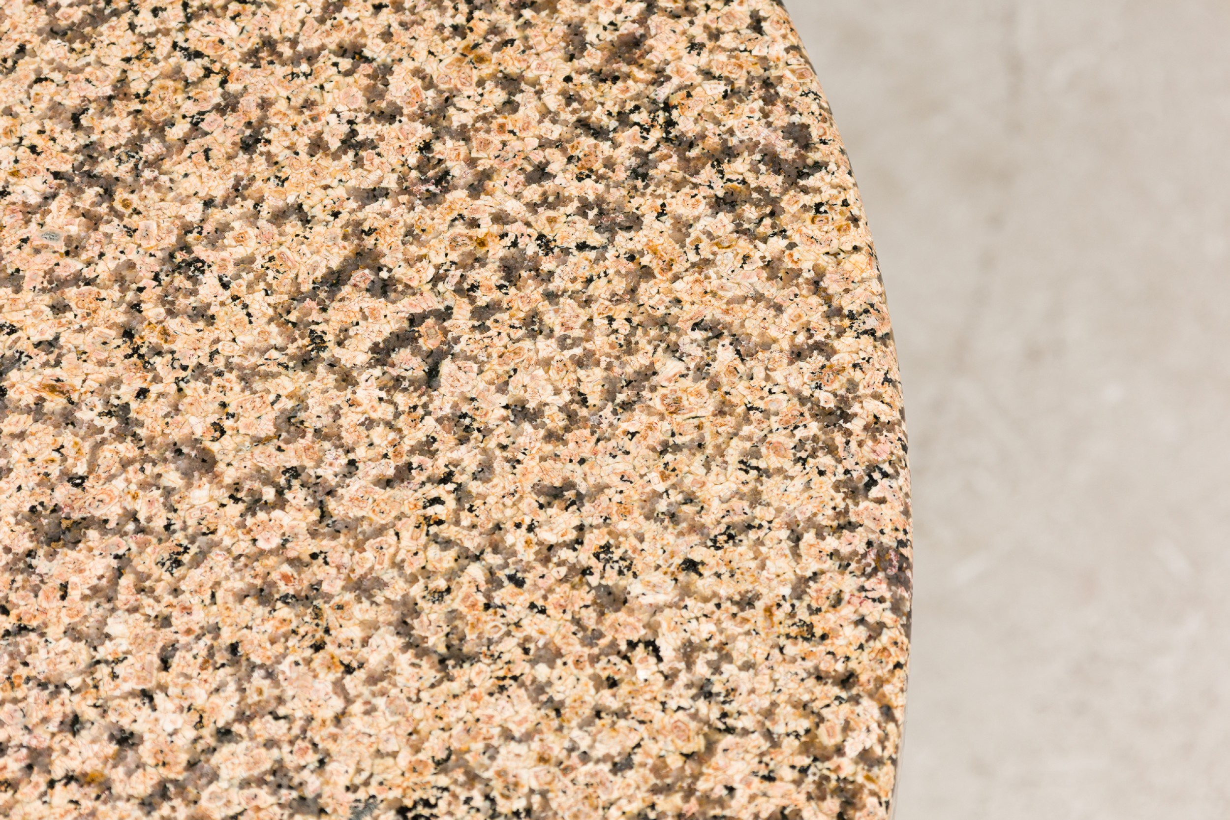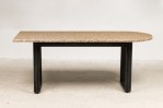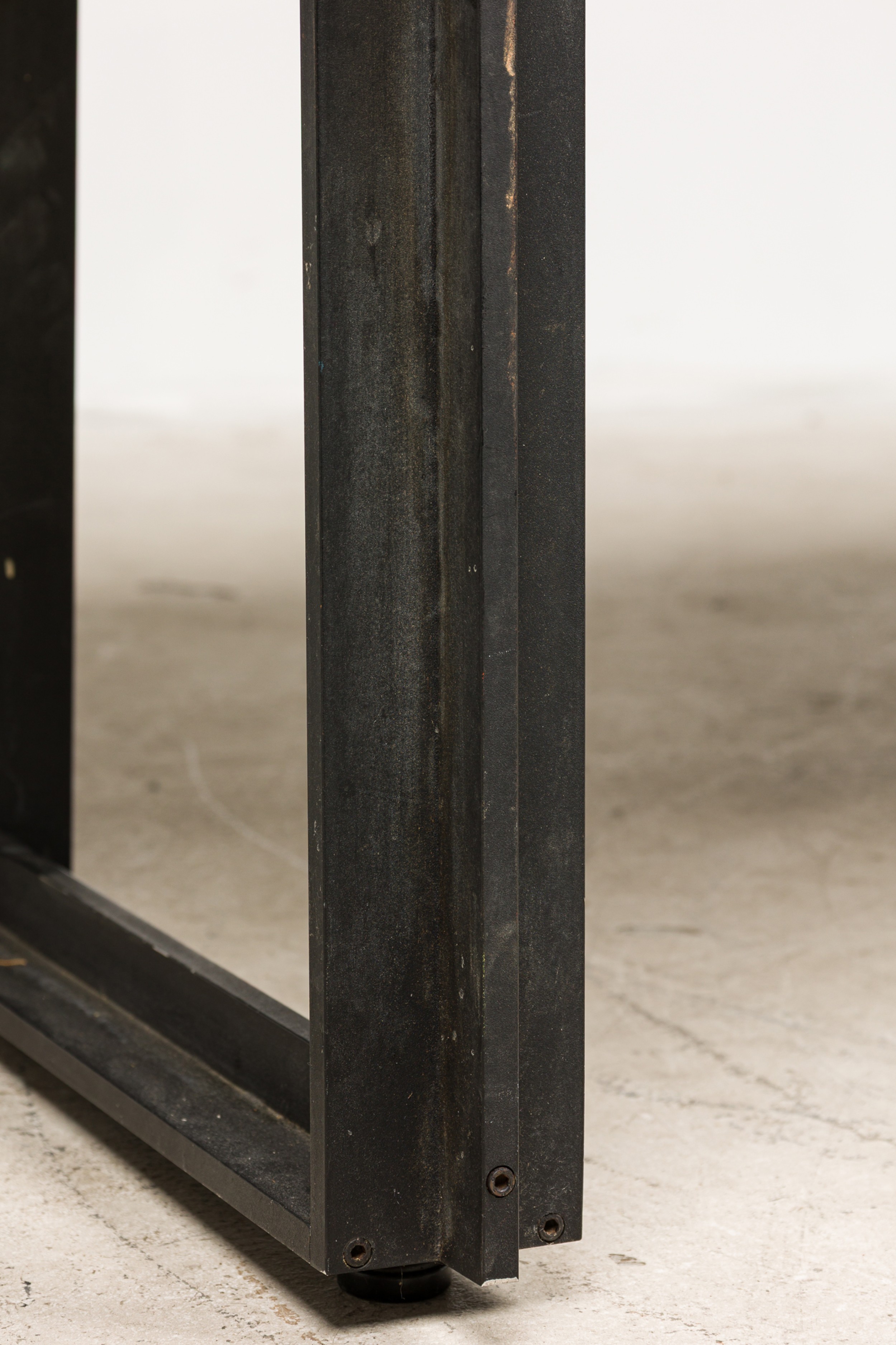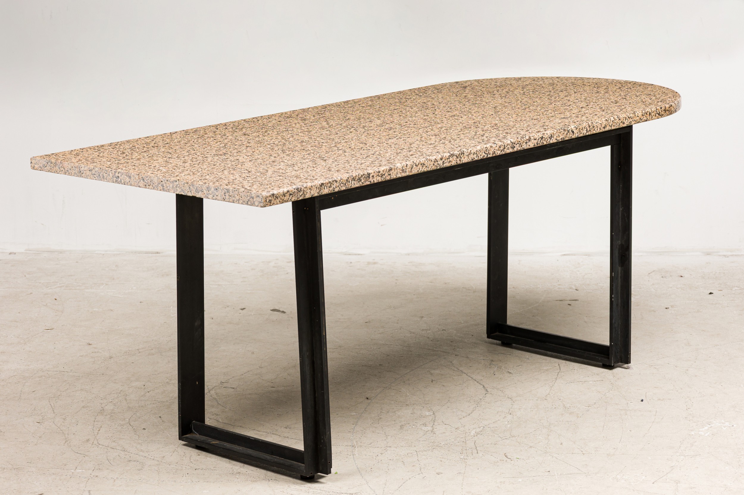 C. 1970s, USA, granite top with one rounded side, over architectural black powder coated flat bar steel, 29"h x 71"l x 30"w.