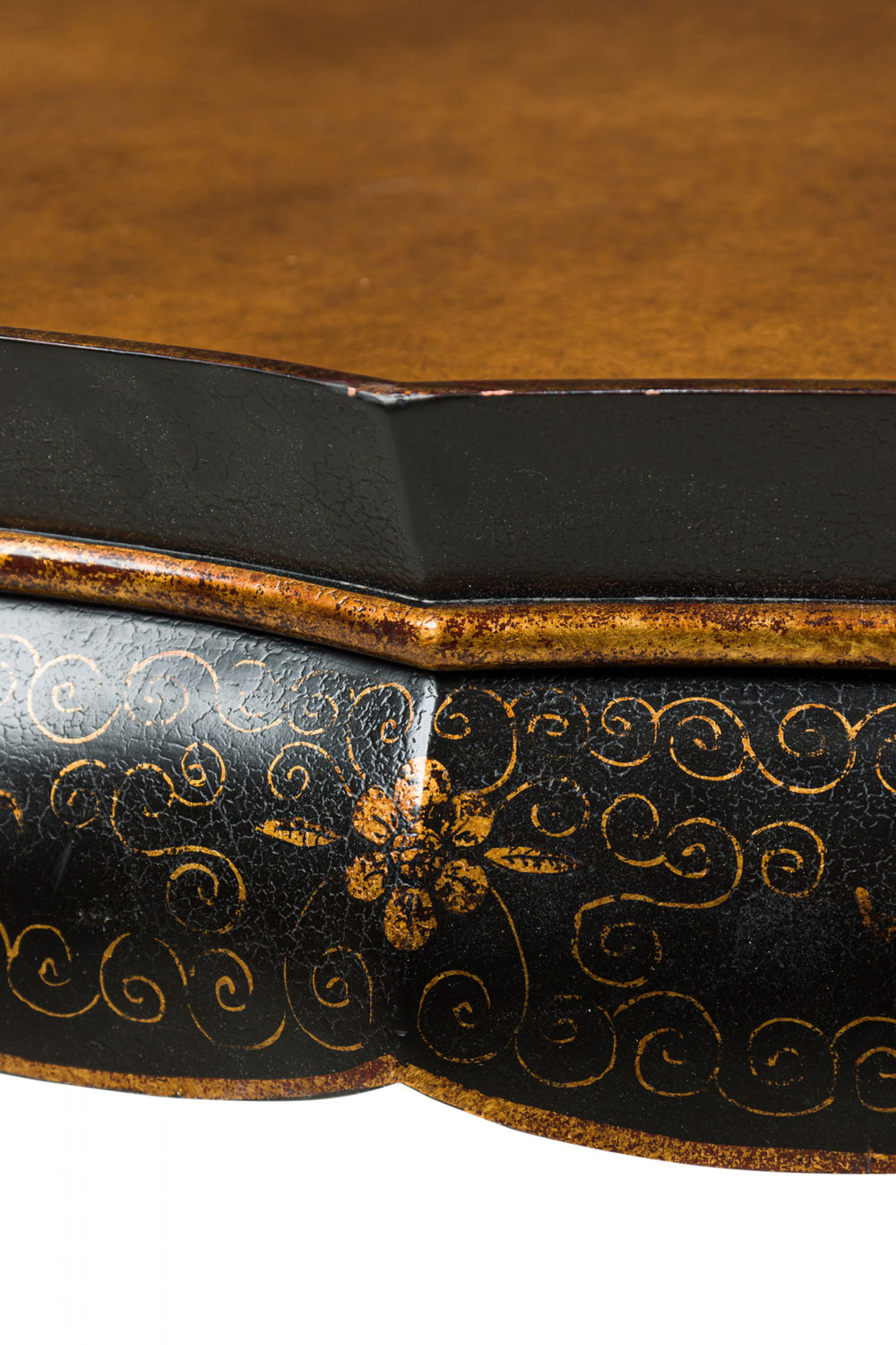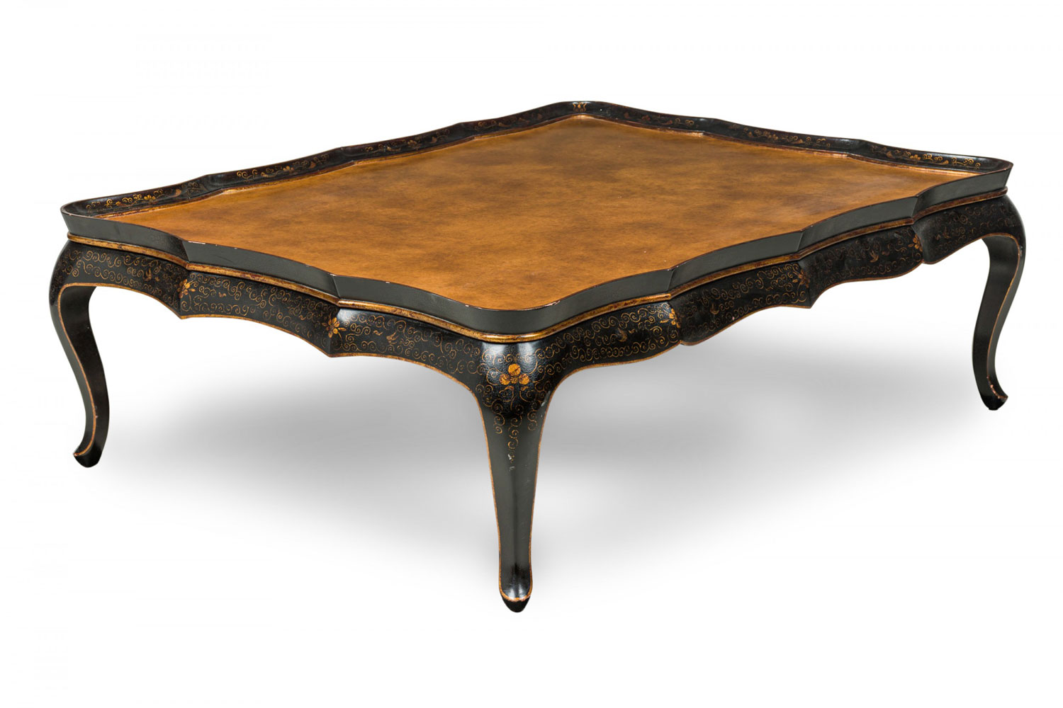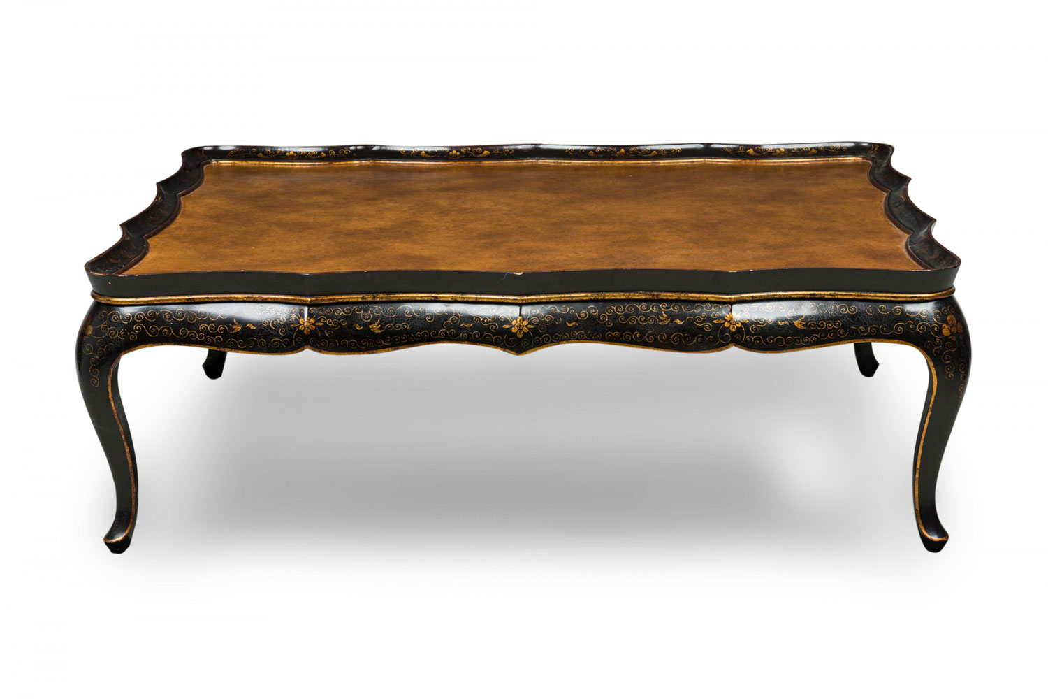 Monumental Chinese Export low coffee table with a raised scalloped gallery surrounding a gold texture painted tabletop, surrounded by a dark brown apron with gold painted floral detail, resting on four curved cabriole legs.