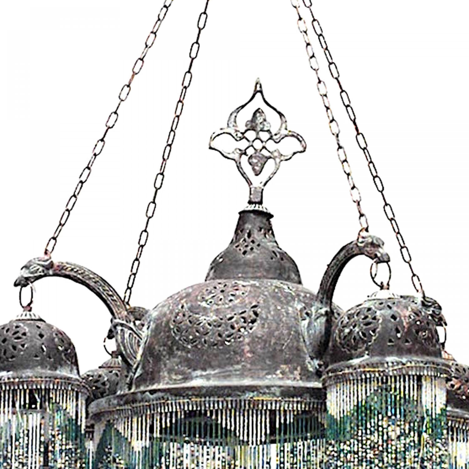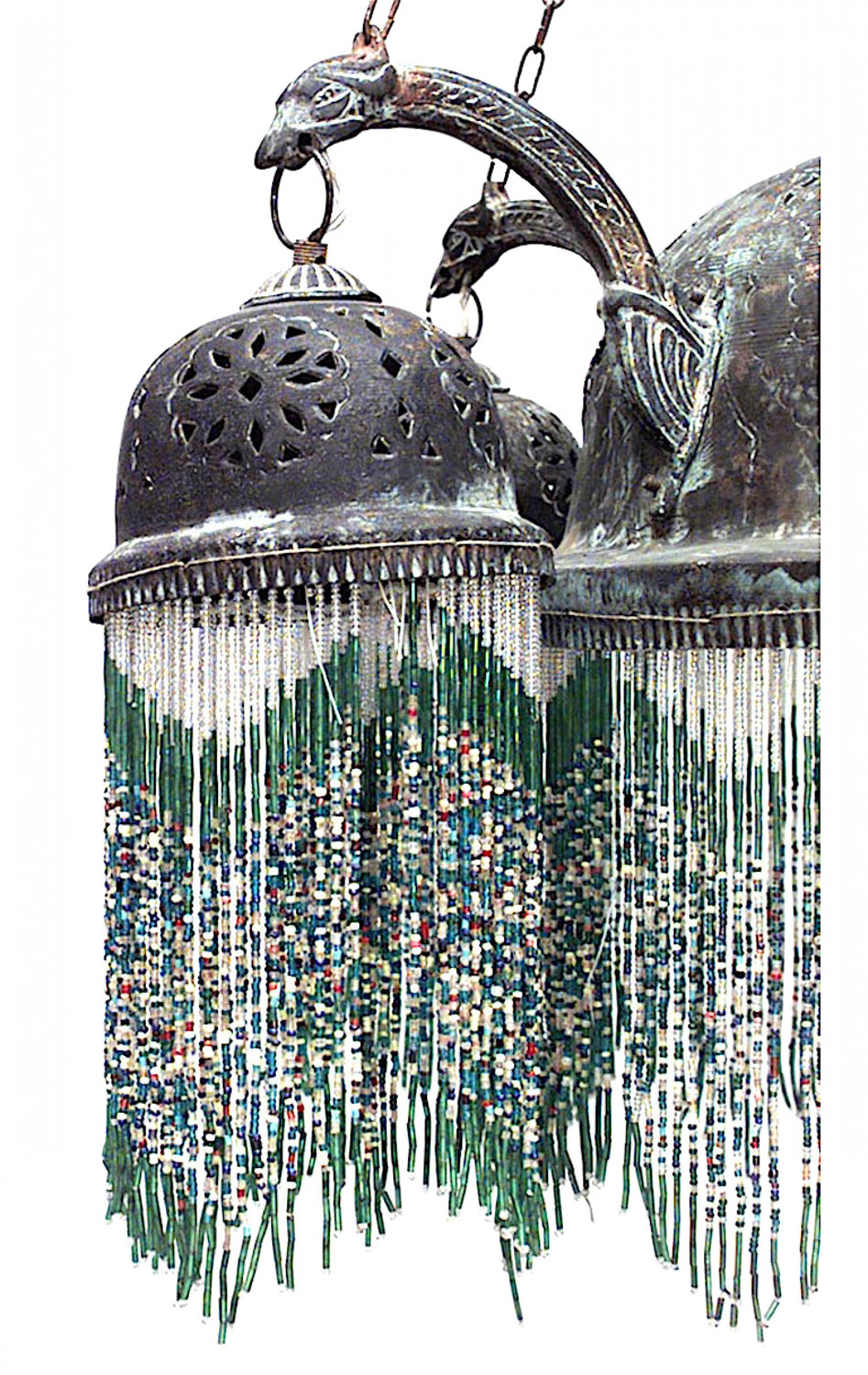 Middle Eastern Moorish-style (19/20th Century) patinated brass filigree chandelier with 4 bird head arms holding dome shades. Green glass beaded fringe.