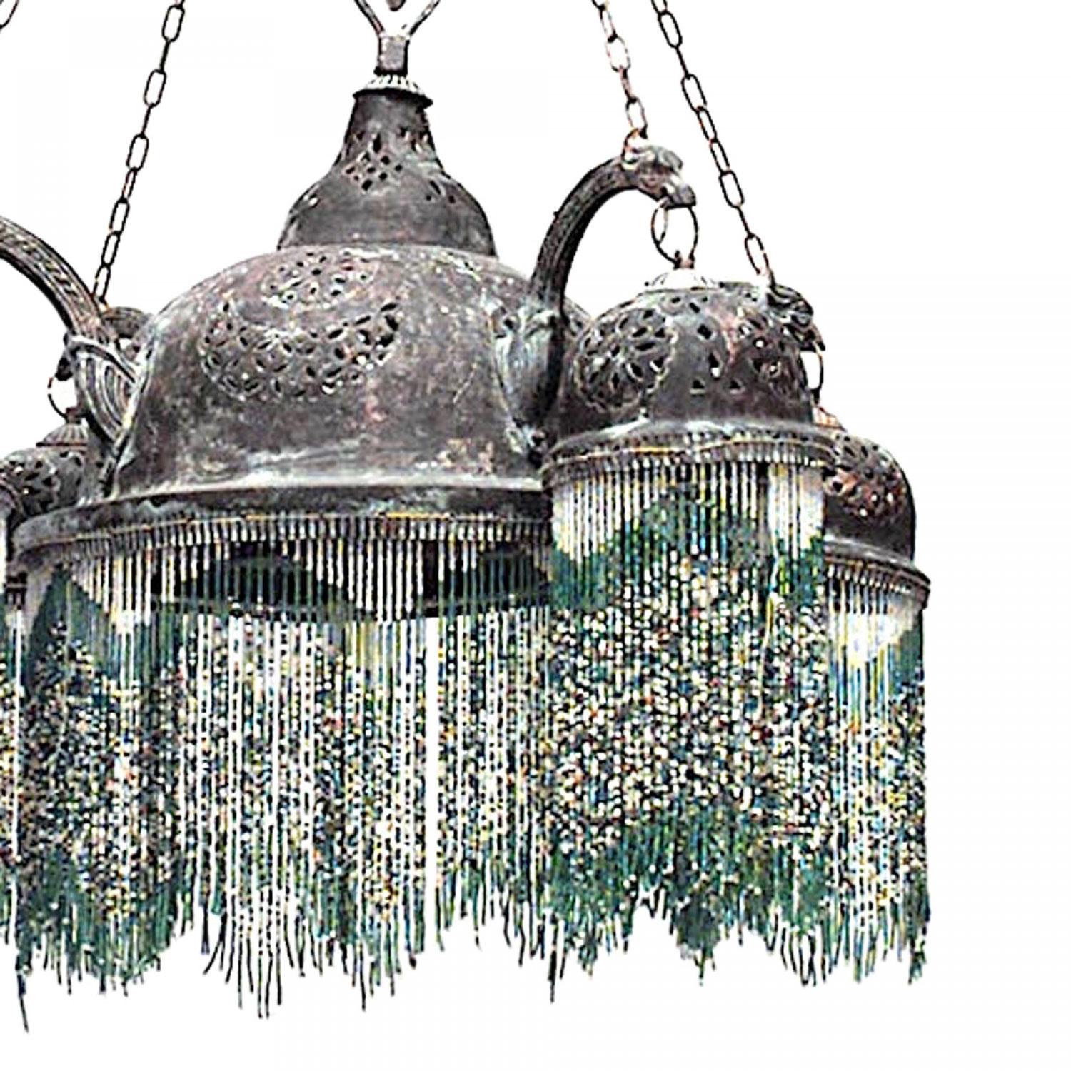 Moorish Style Patinated Brass and Green Glass Bead Chandelier