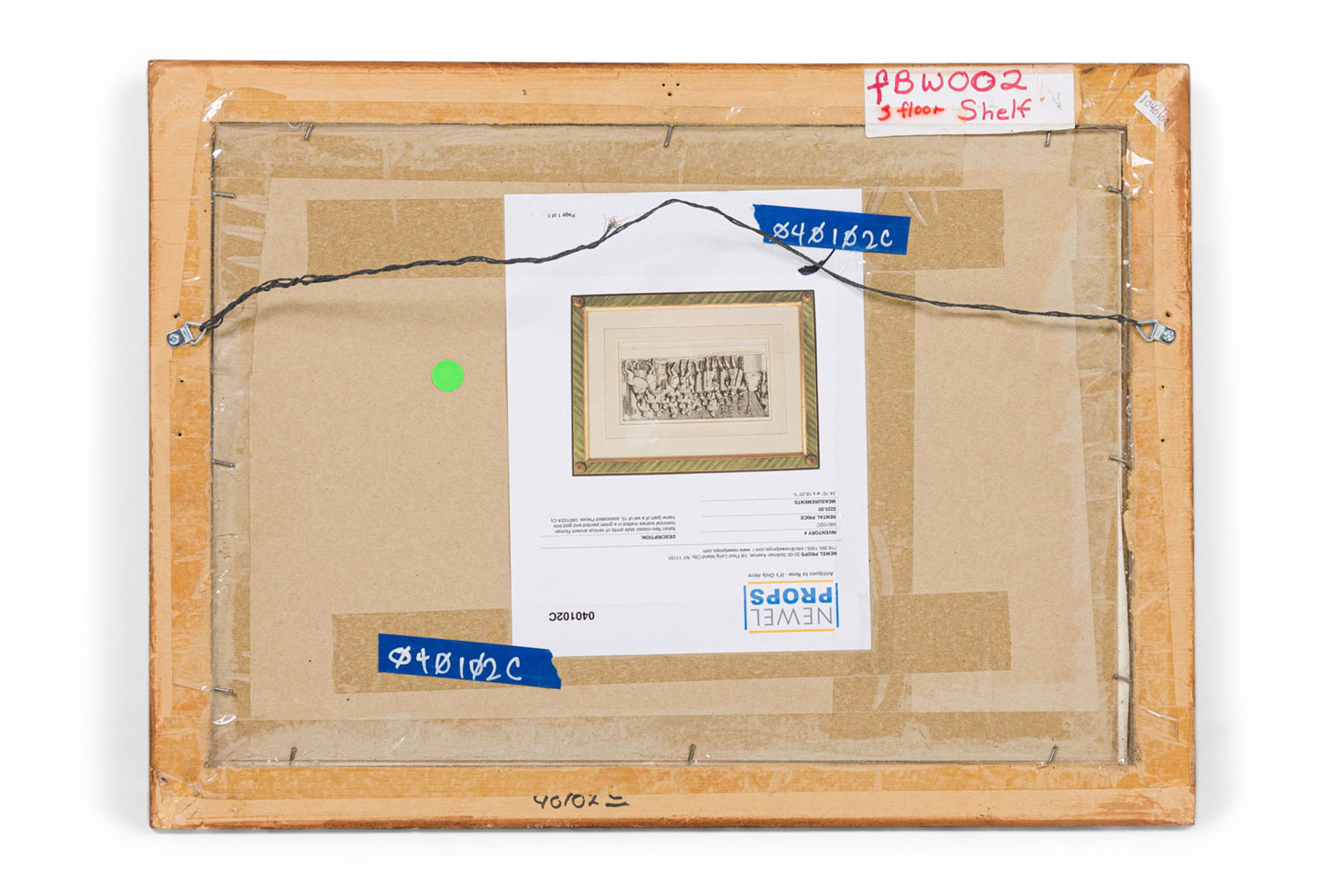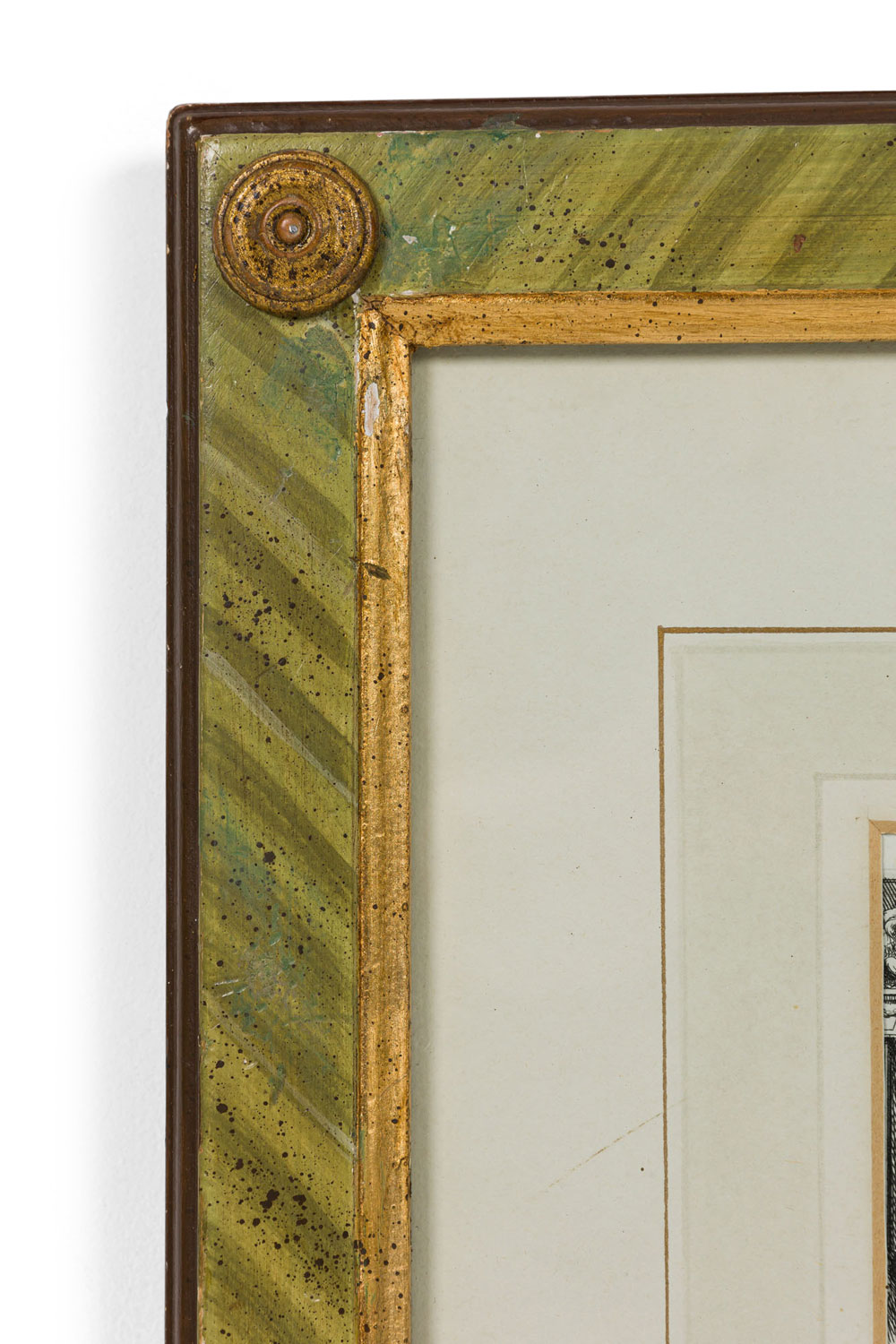 Italian Neo-classic style prints of various ancient Roman historical scenes matted in a green painted and gold trim frame (part of a set of 15; associated Pieces: 040102A-O).