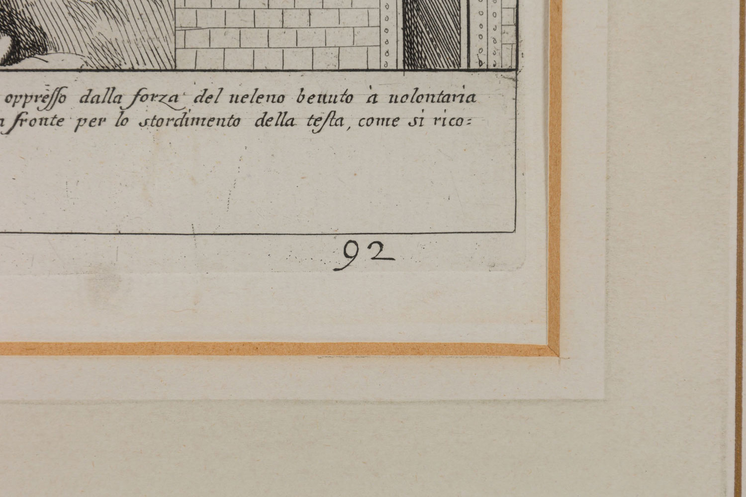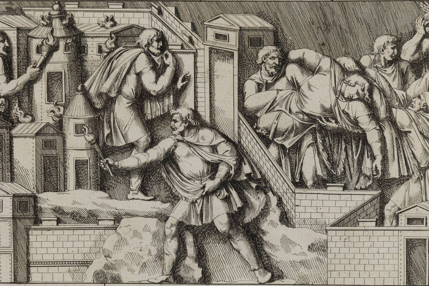 Italian Neo-classic style prints of various ancient Roman historical scenes matted in a green painted and gold trim frame (part of a set of 15; associated pieces: 040102A-O)