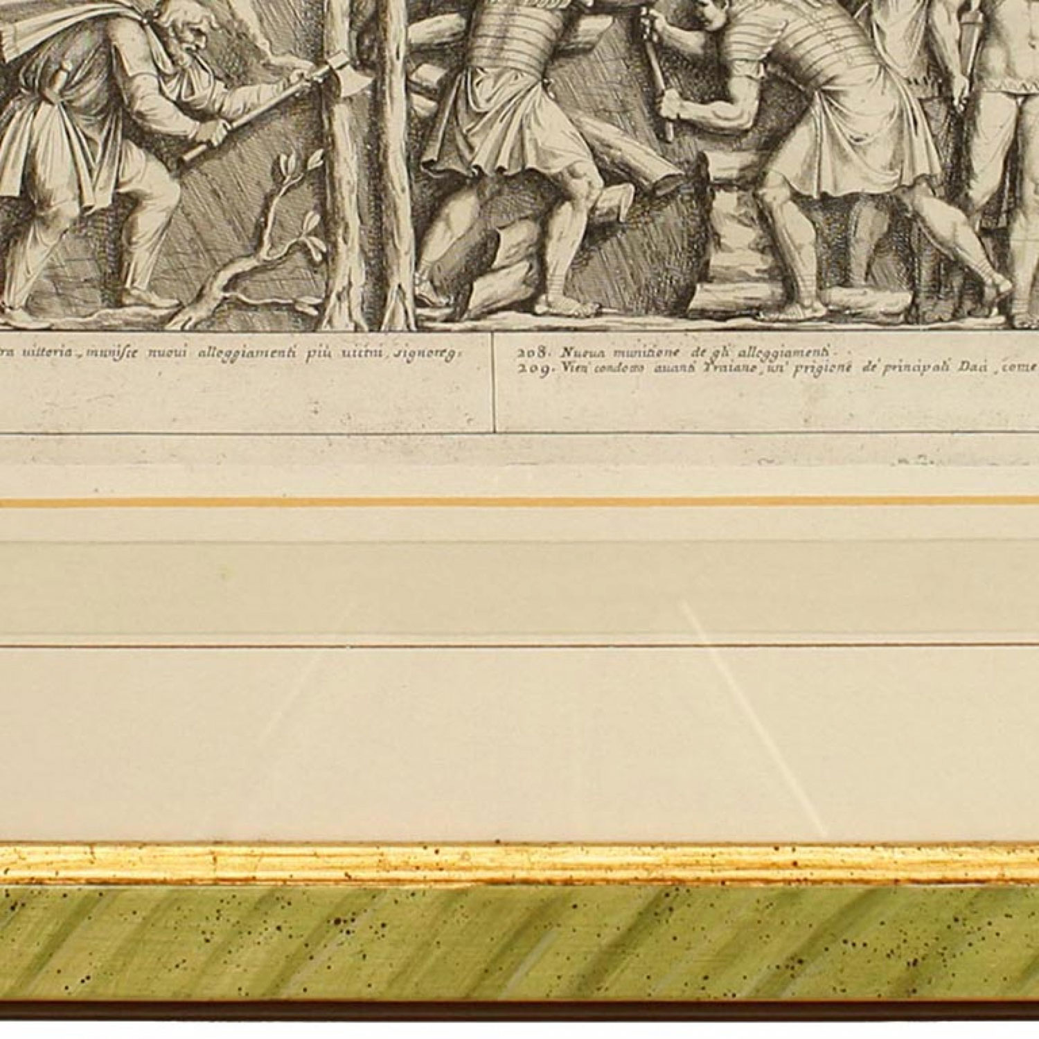 Italian Neo-classic style prints of various ancient Roman historical scenes matted in a green painted and gold trim frame (part of a set of 15; associated pieces: 040102A-O)