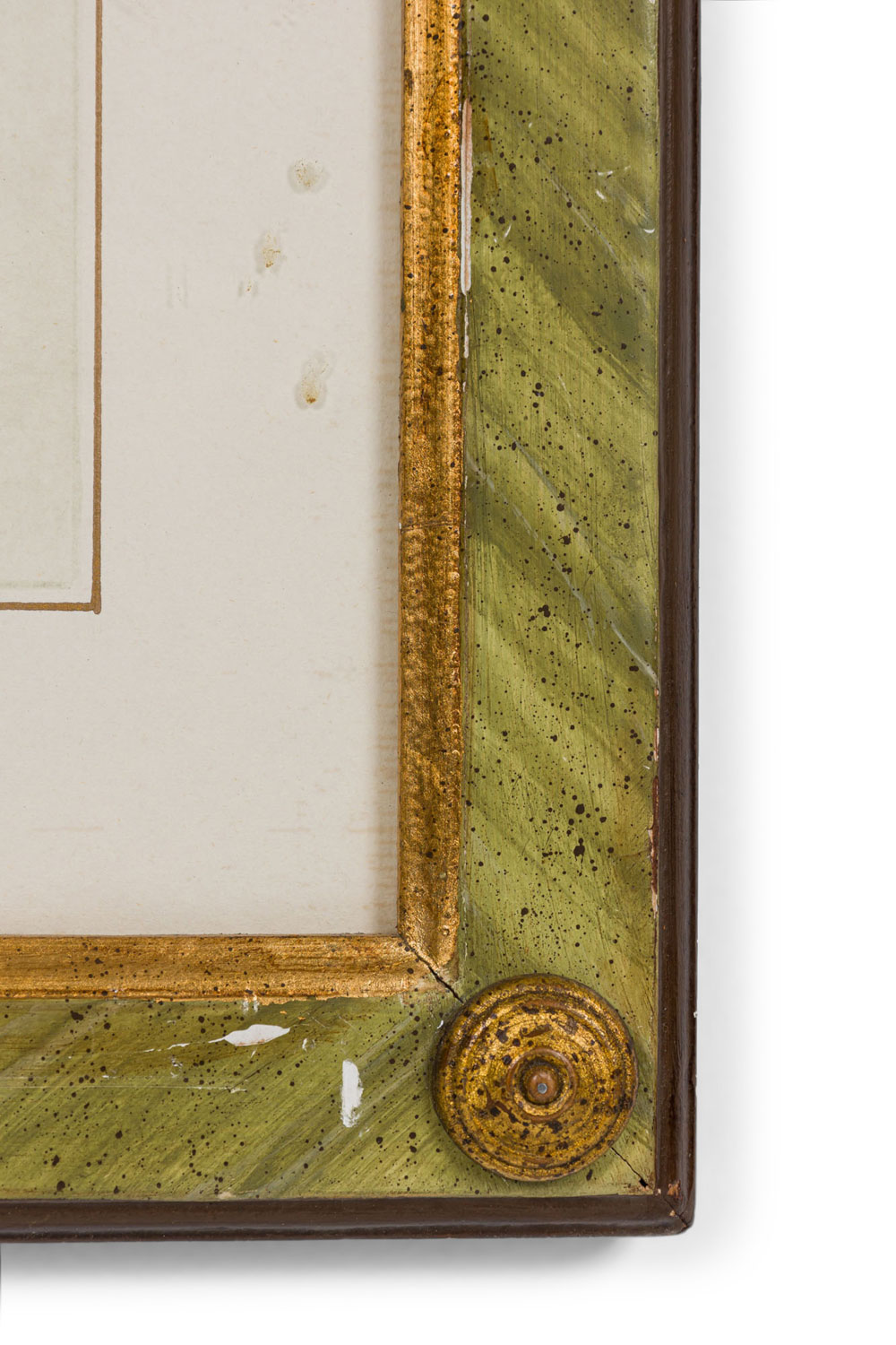 Italian Neo-classic style prints of various ancient Roman historical scenes matted in a green painted and gold trim frame (part of a set of 15; associated pieces: 040102A-O)