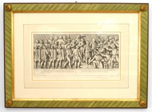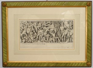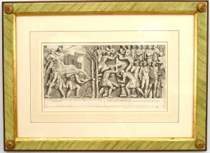 15 Italian Neo-classic style prints of various ancient Roman historical scenes matted in a green painted and gold trim frame (available individually 041020A-O; PRICED EACH).