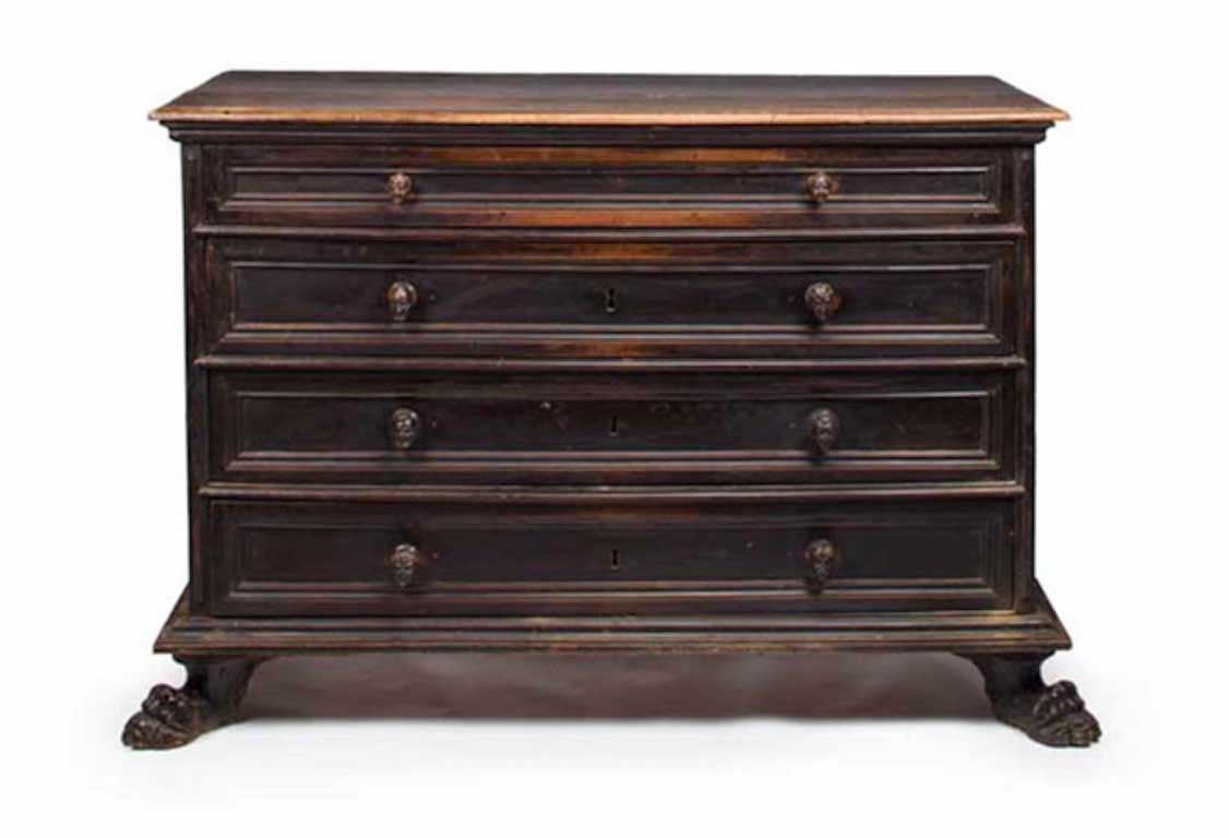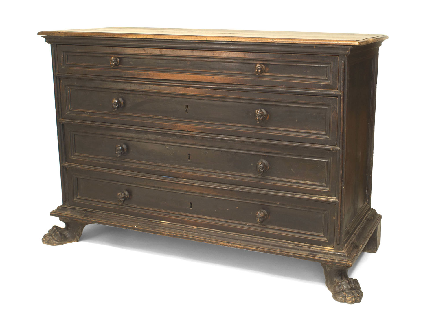 Northern Italian Baroque walnut commode (17th/18th Century) with 4 drawers pulls carved in the form of busts in Renaissance costume. Resting on hoof carved feet..