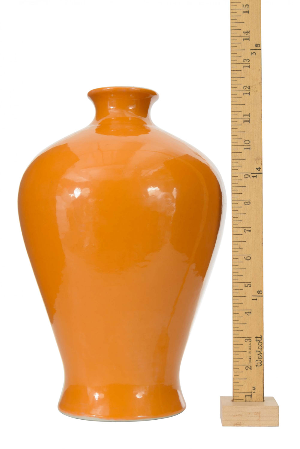Urn-shaped orange glazed ceramic vase with a small flared neck.