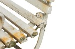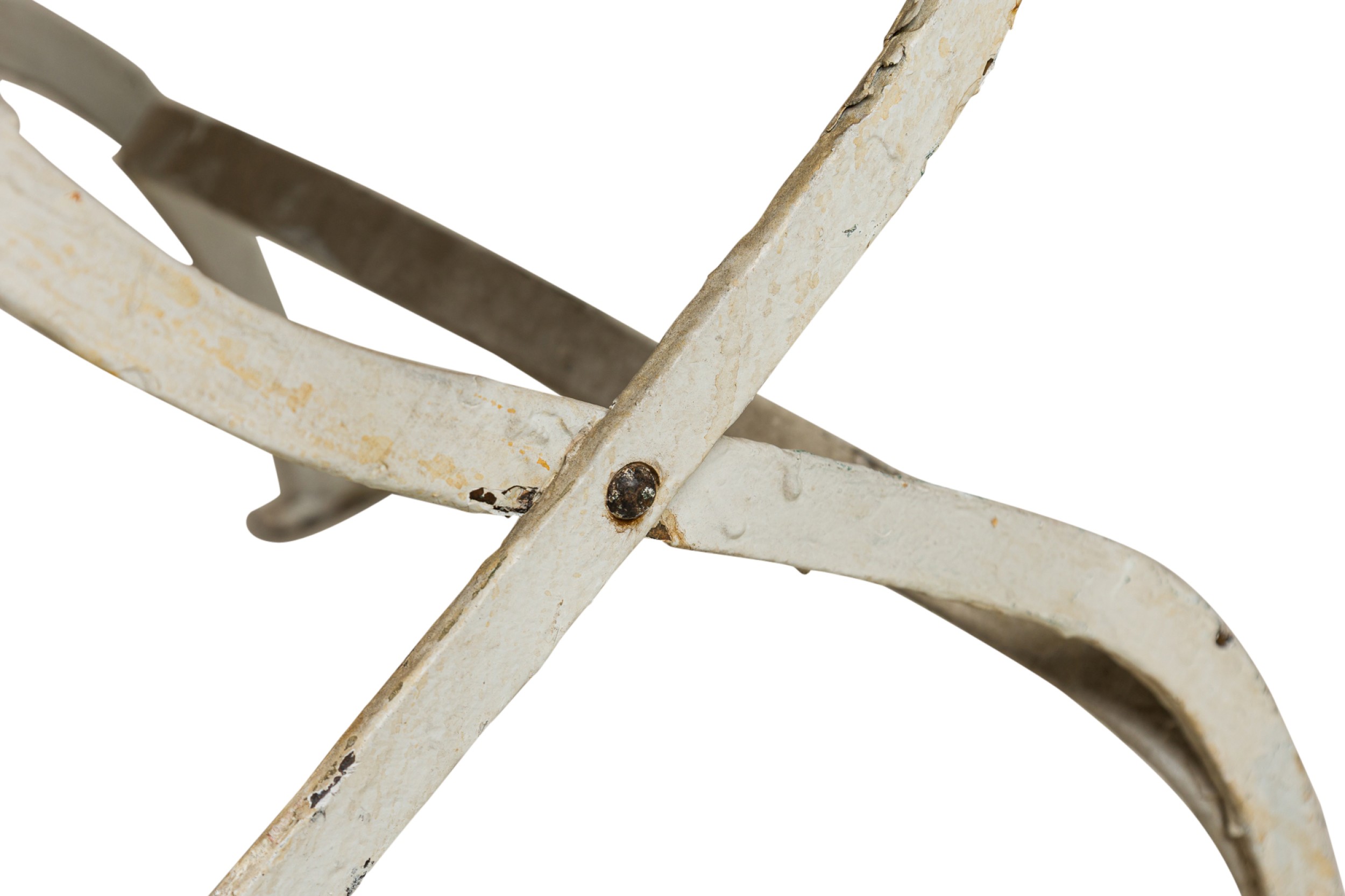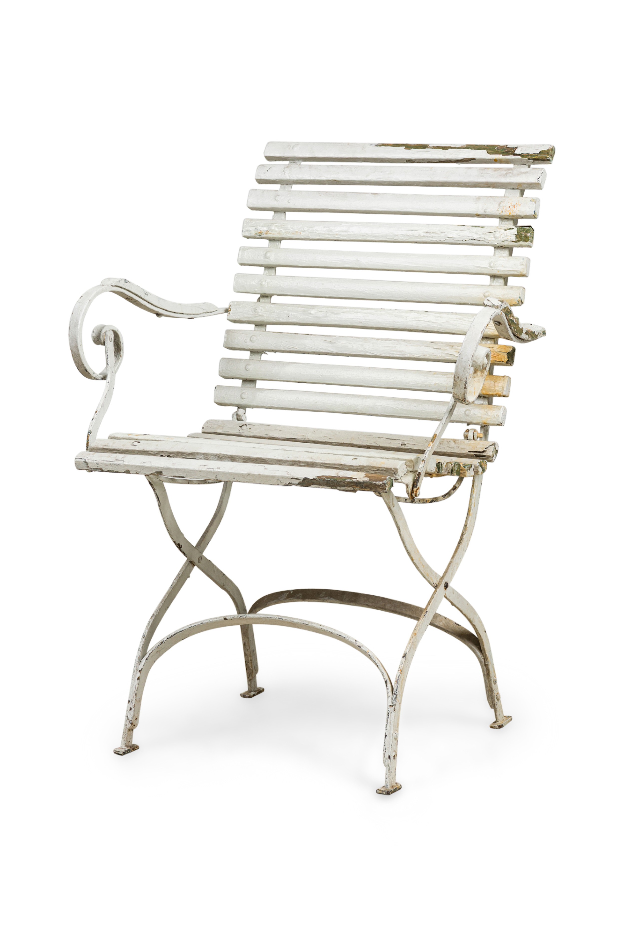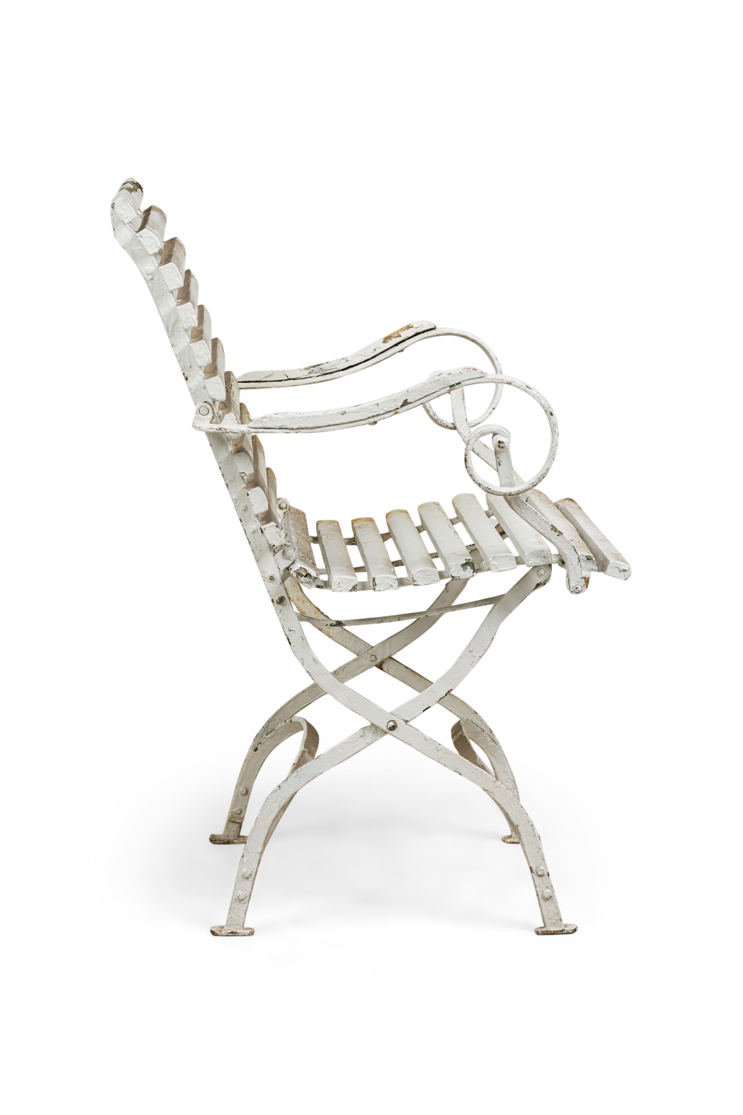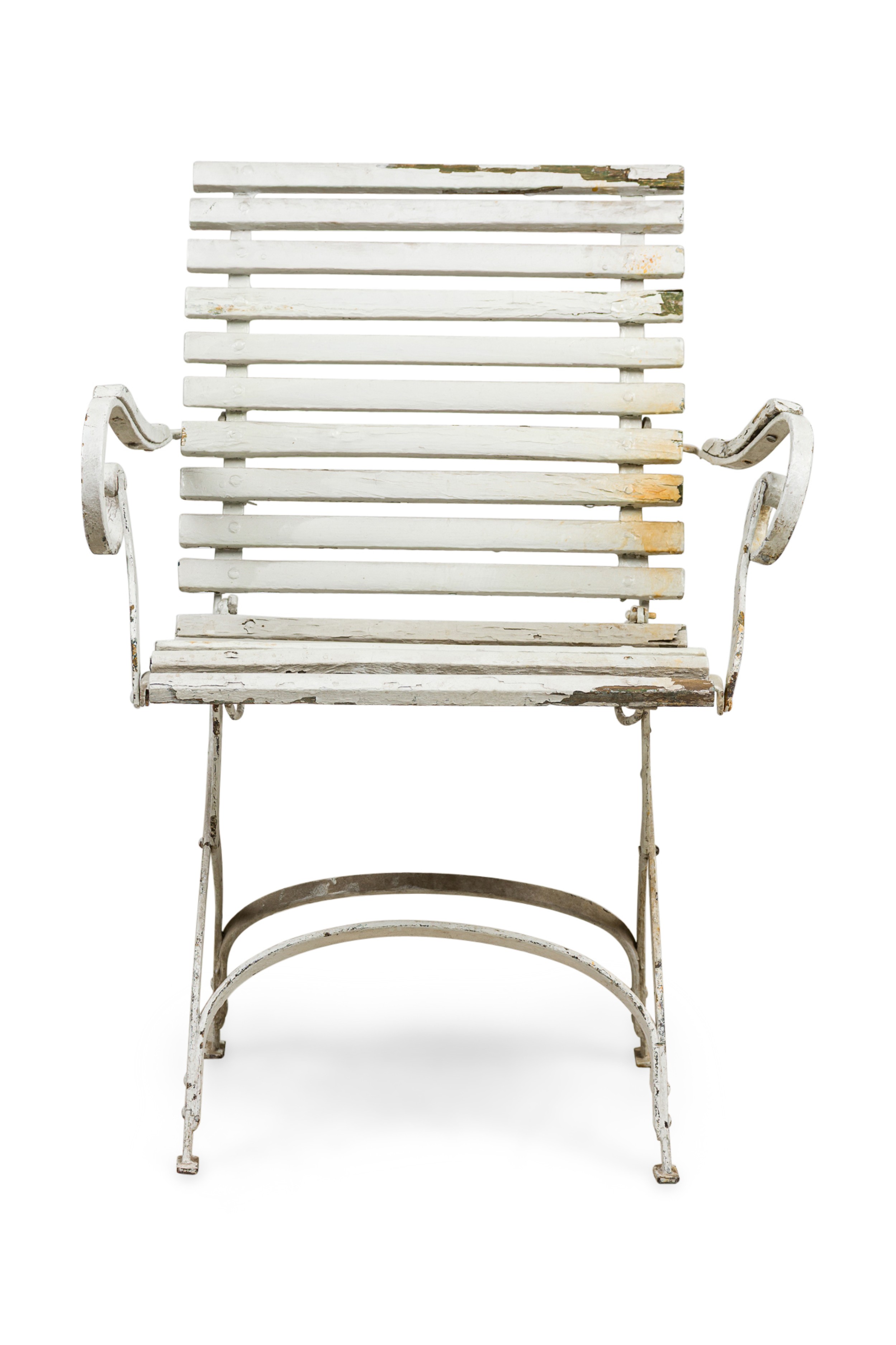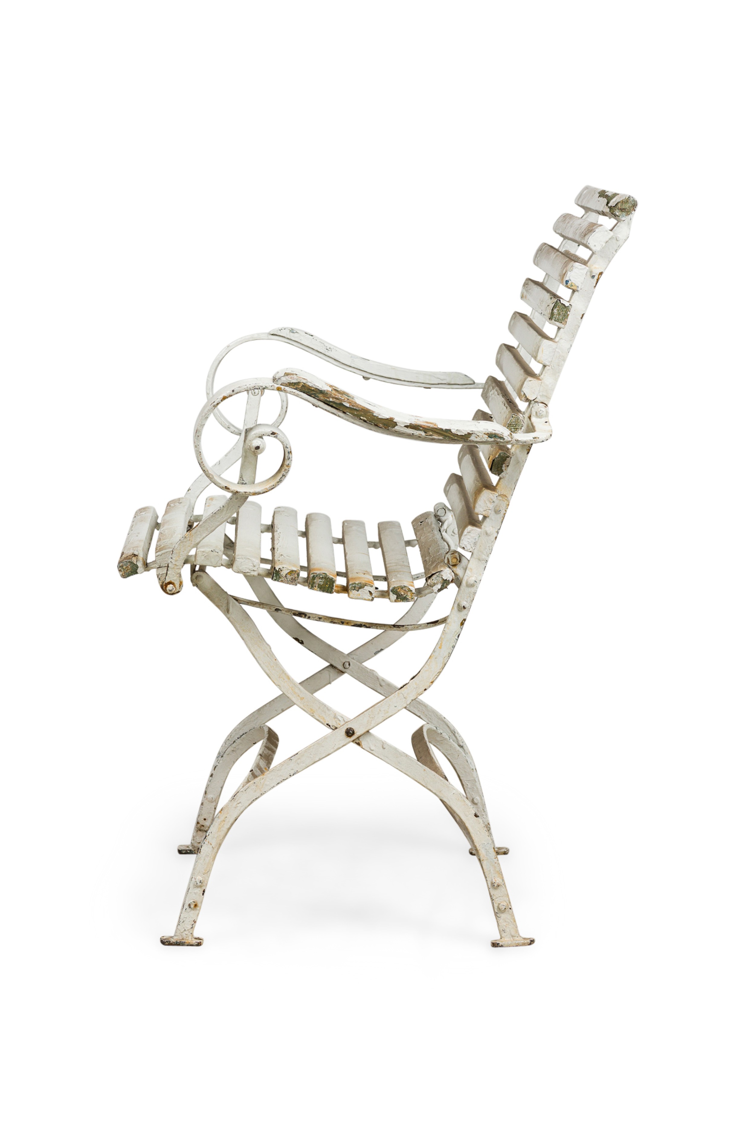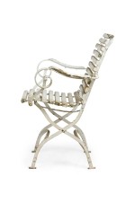 Outdoor French (19th-20th Century) folding white painted iron arm chair with scroll designs and narrow slat wood seat and back