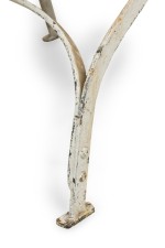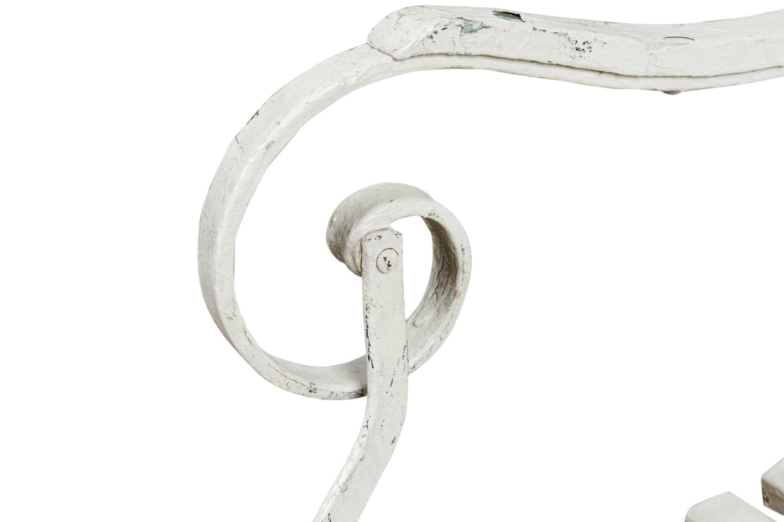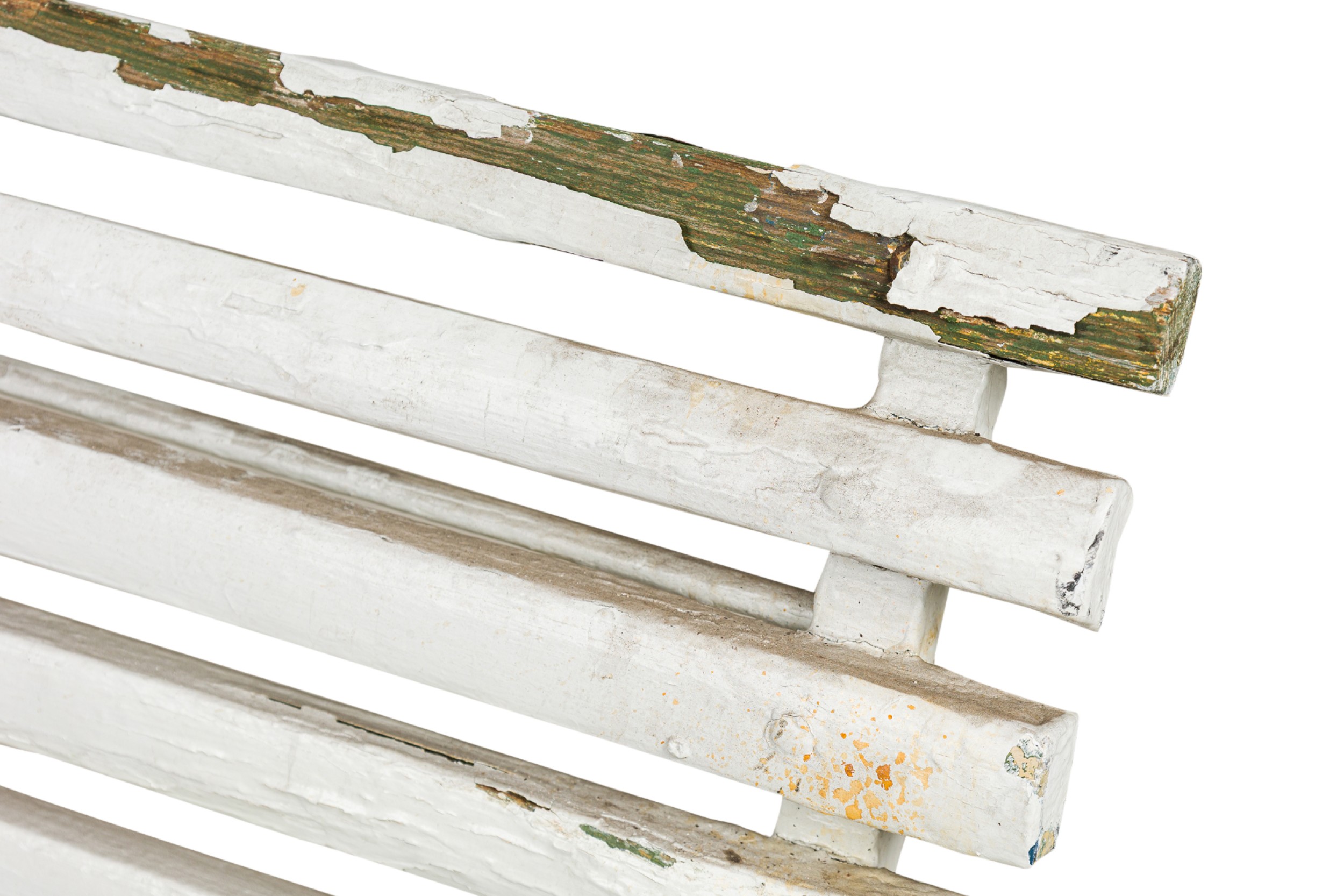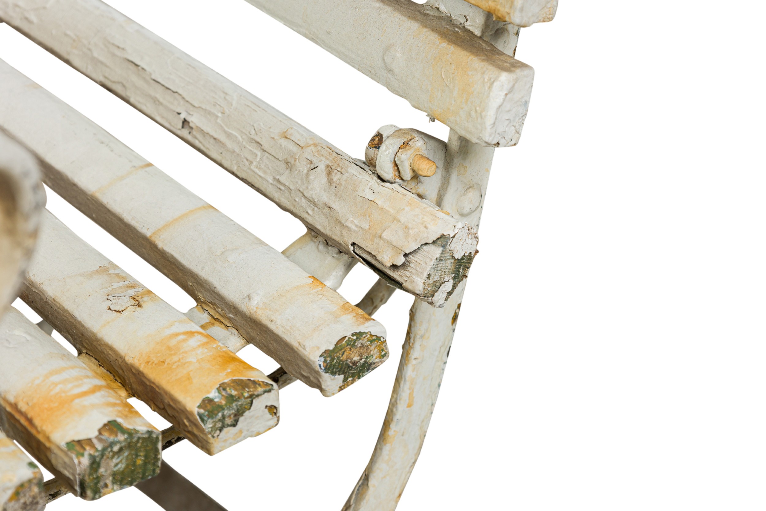 Style: French, Outdoor Materials & Techniques: Iron, iron / wrought iron, metal, slat Category: Seating Condition: Fair, structurally sound, some loss of paint penetrating the surface, rusty around the legs and craquelure over all