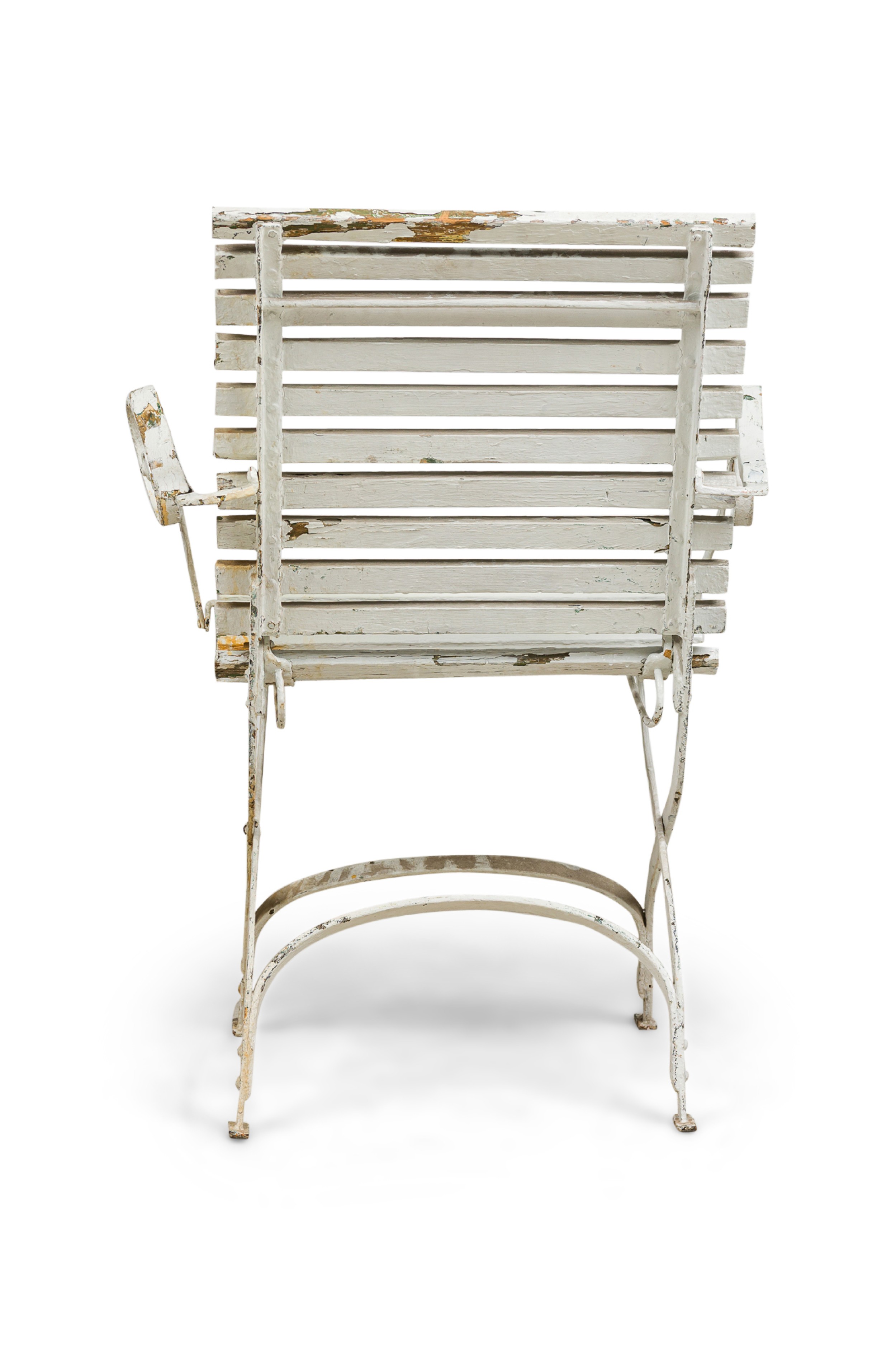 Outdoor French (19th-20th Century) folding white painted iron arm chair with scroll designs and narrow slat wood seat and back.