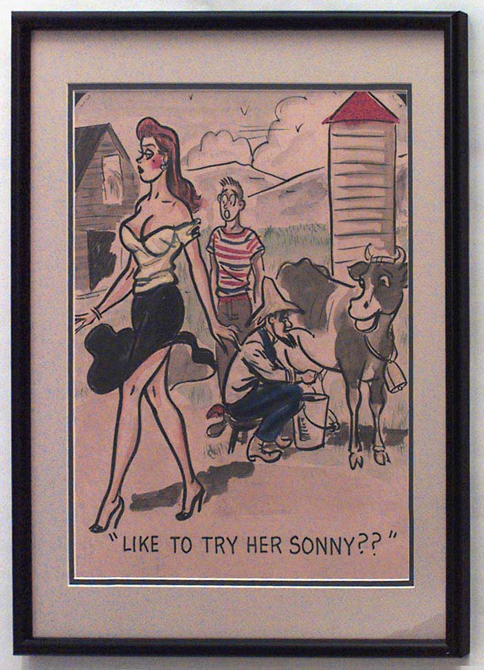 American Mid-Century (unsigned) black-framed caricature watercolor of sexy woman walking by 2 men milking a cow ("Like to try her Sonny?")